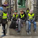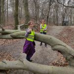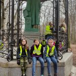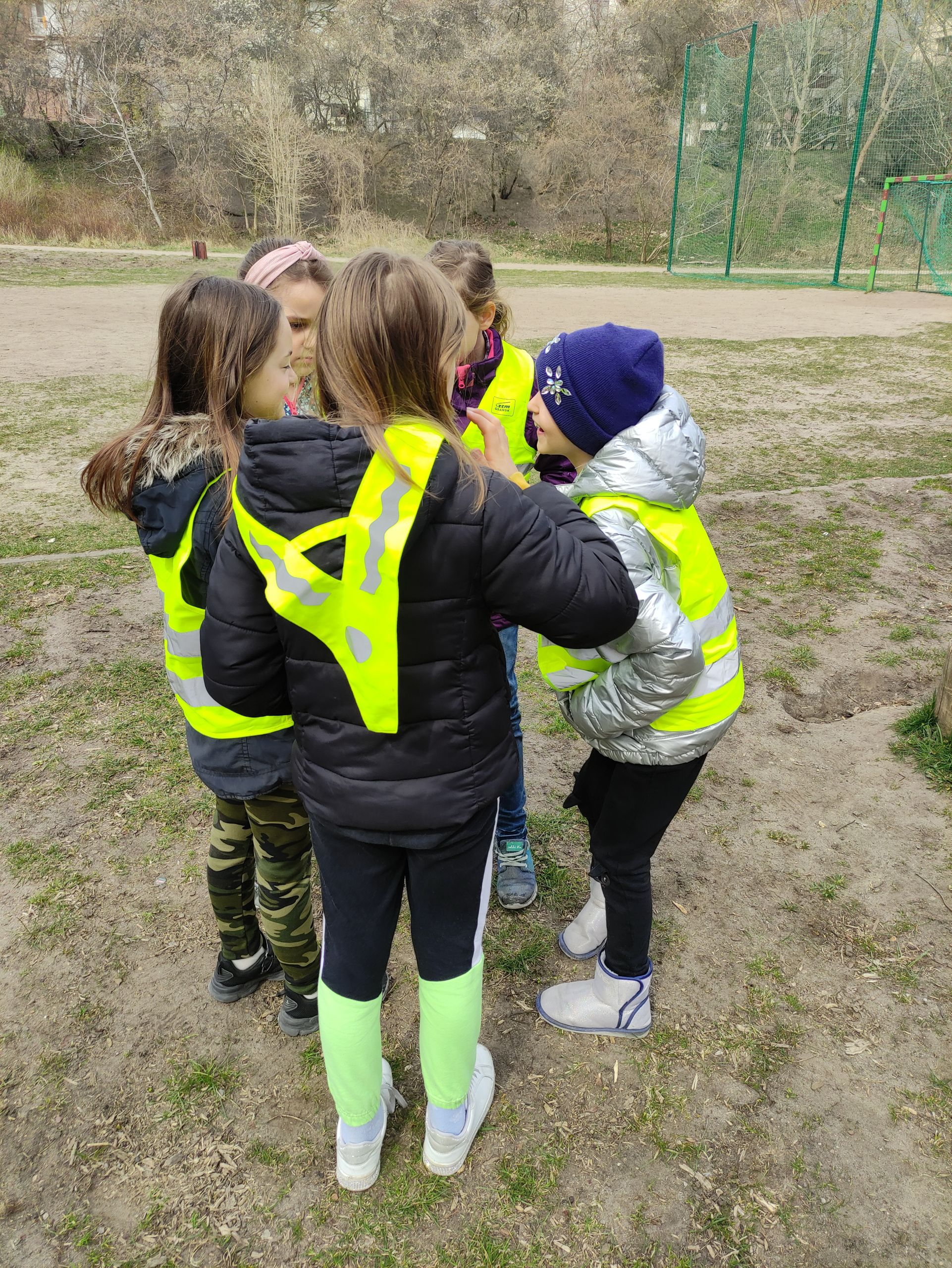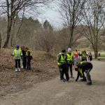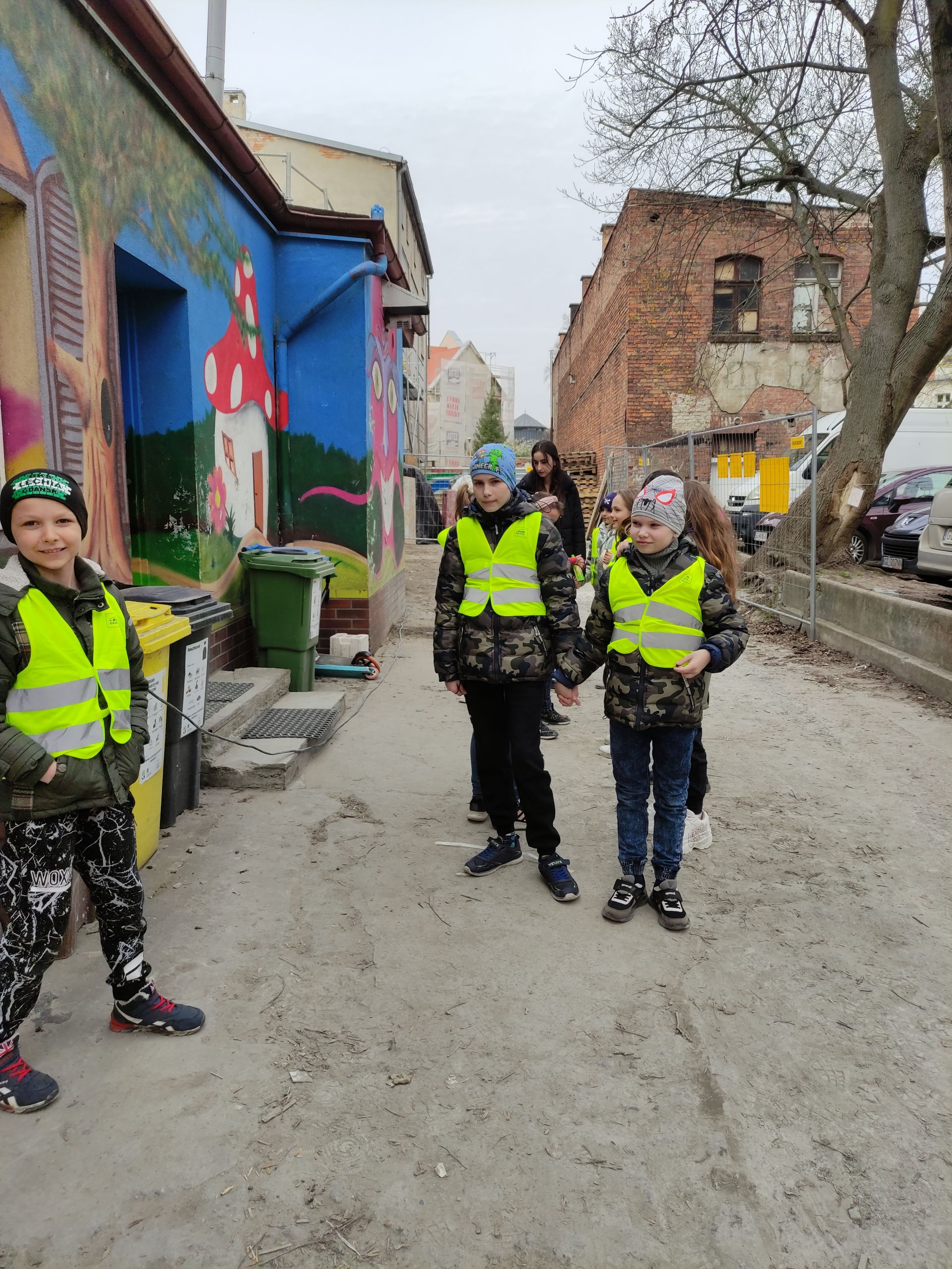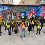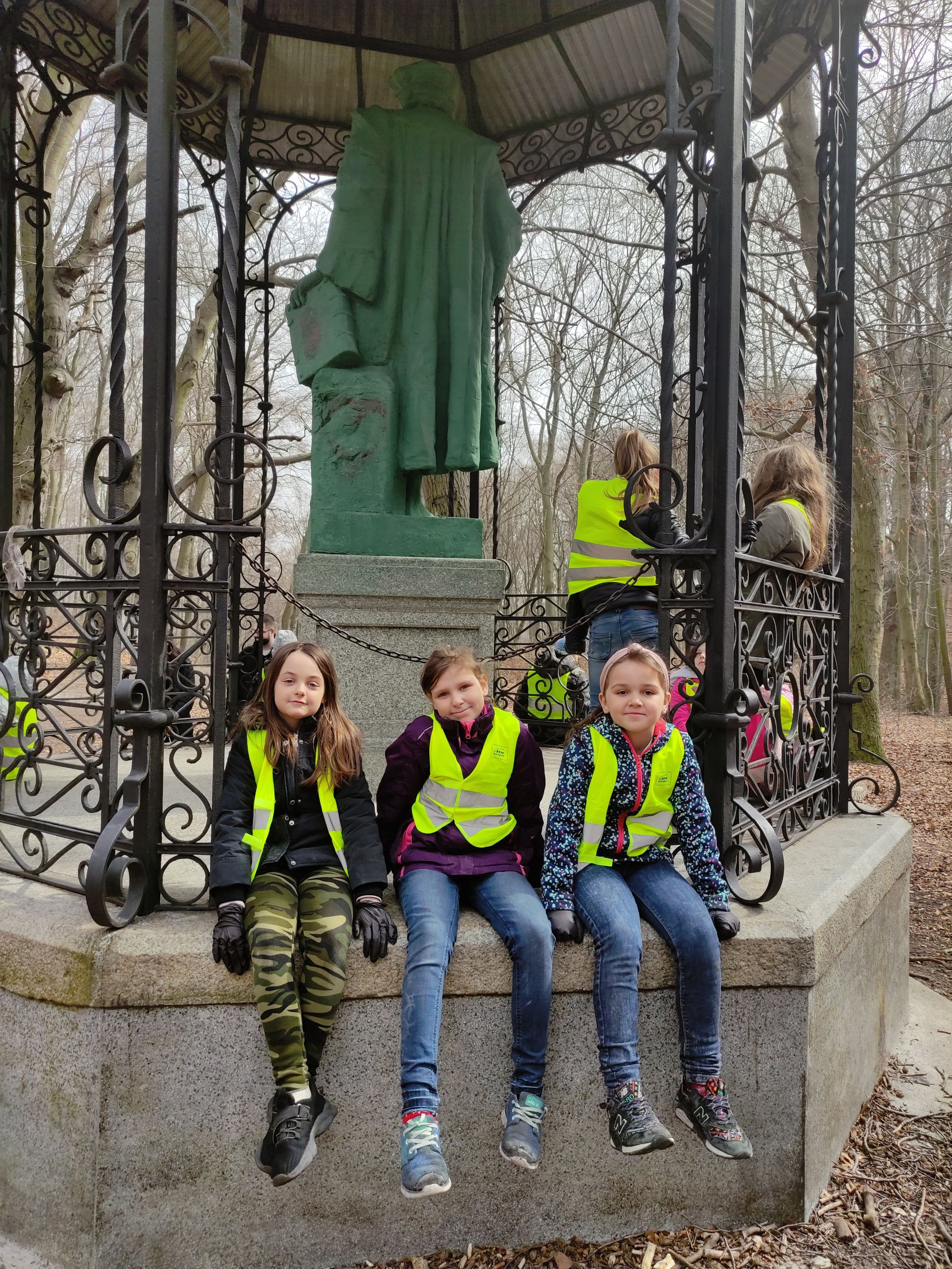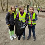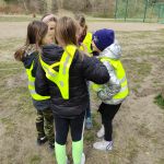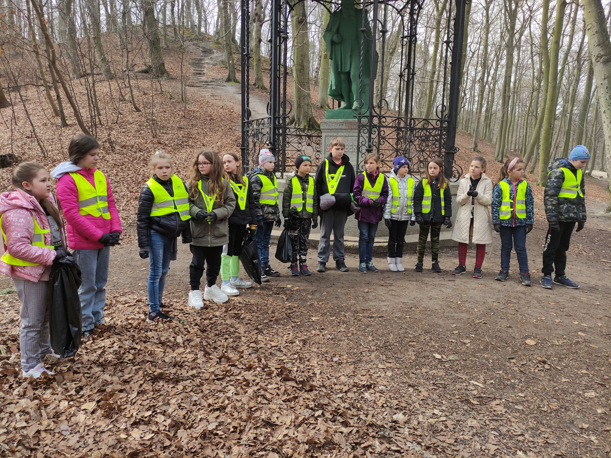 - Grupa dzieci w odblaskowych kamizelkach w lesie. W rękach trzymają worki z zebranymi śmieciami.