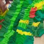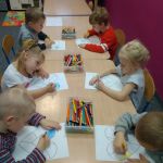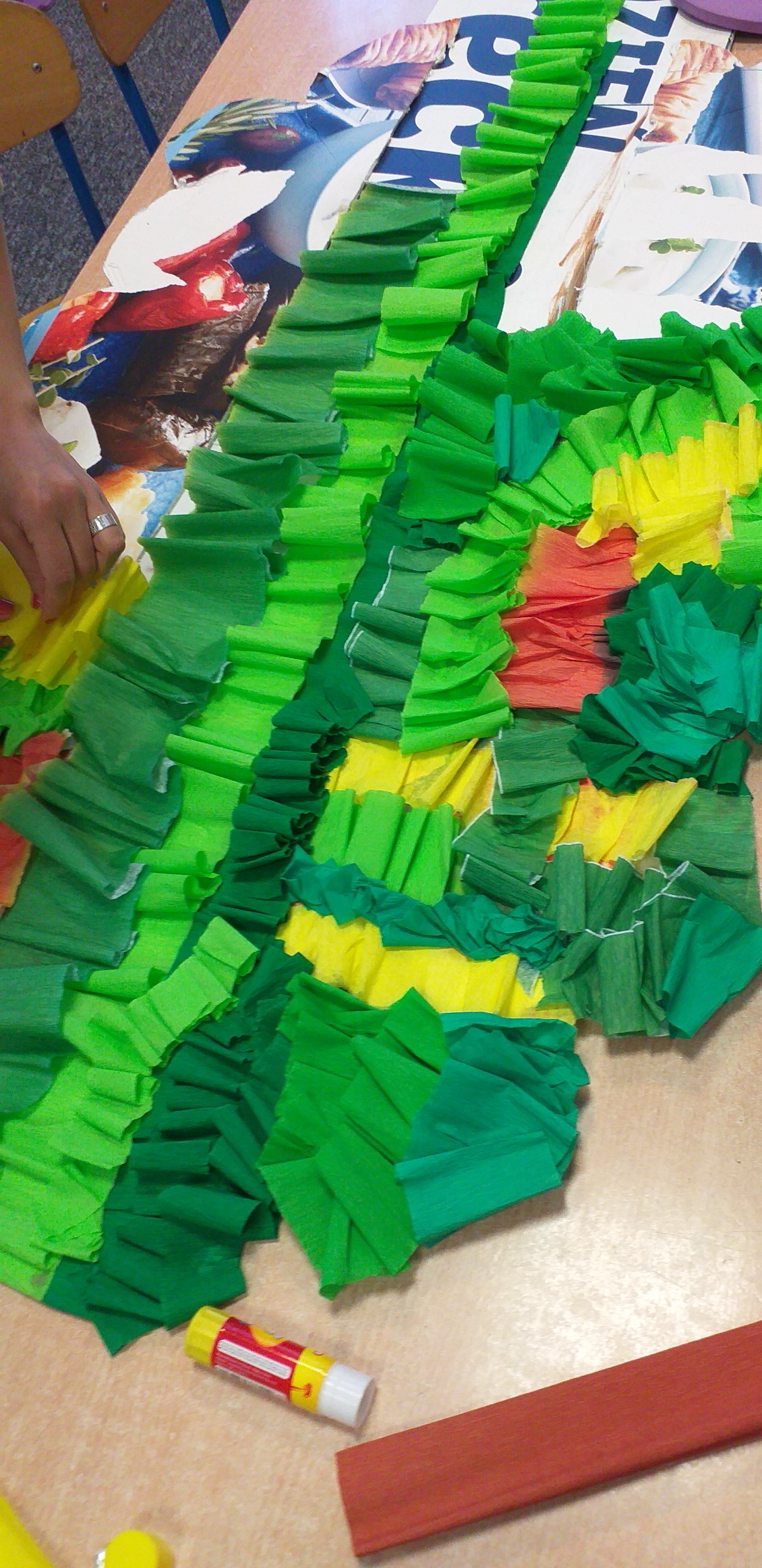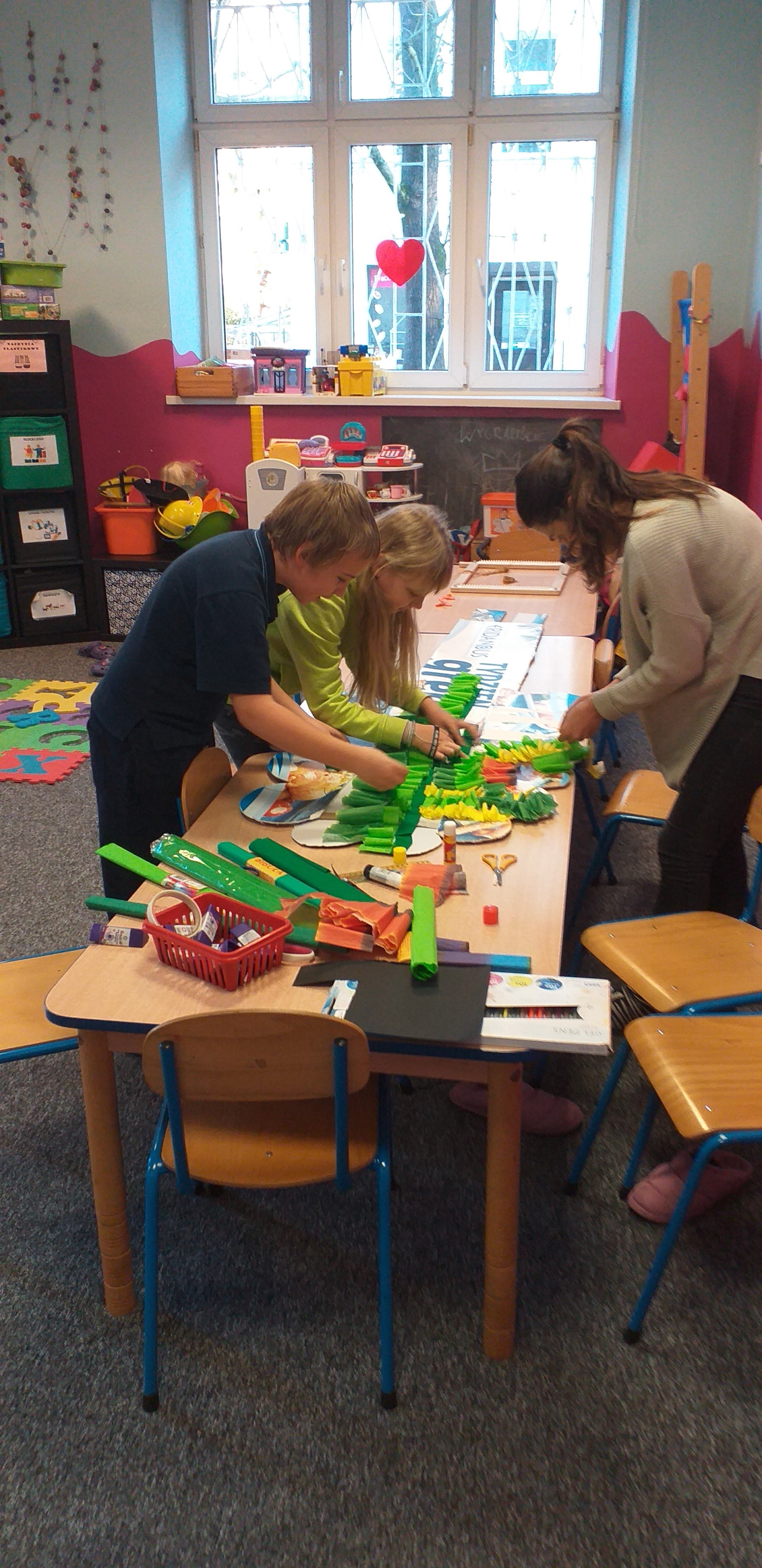 - Grupa dzieci stoi nad stolikiem i wykonuje pracę z zielonej bibuły.