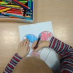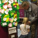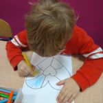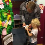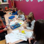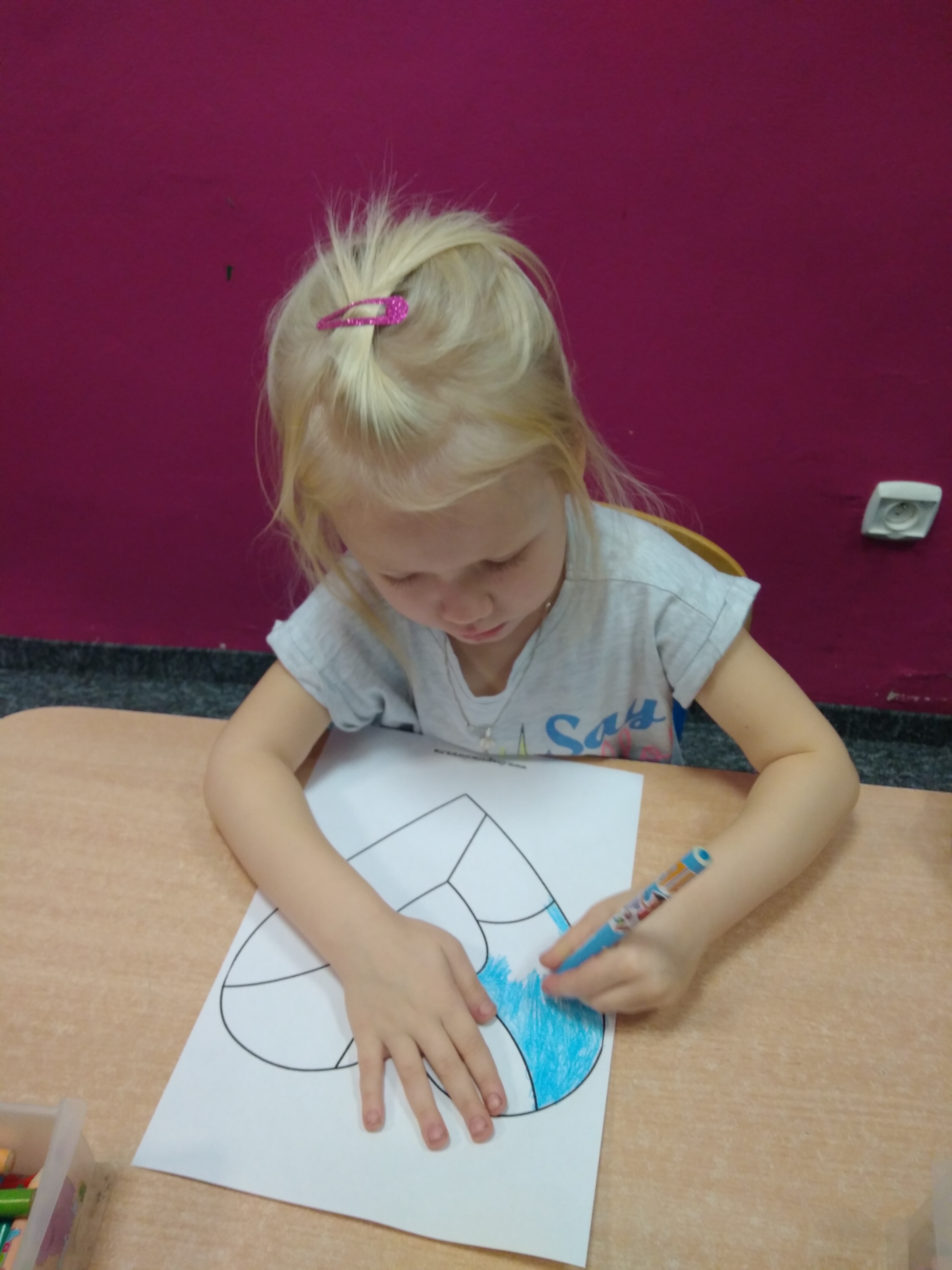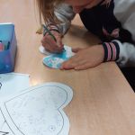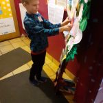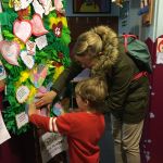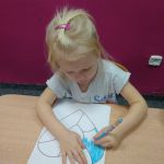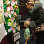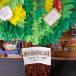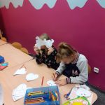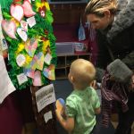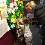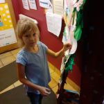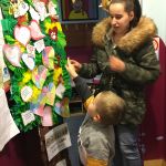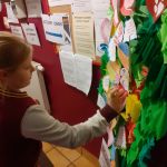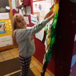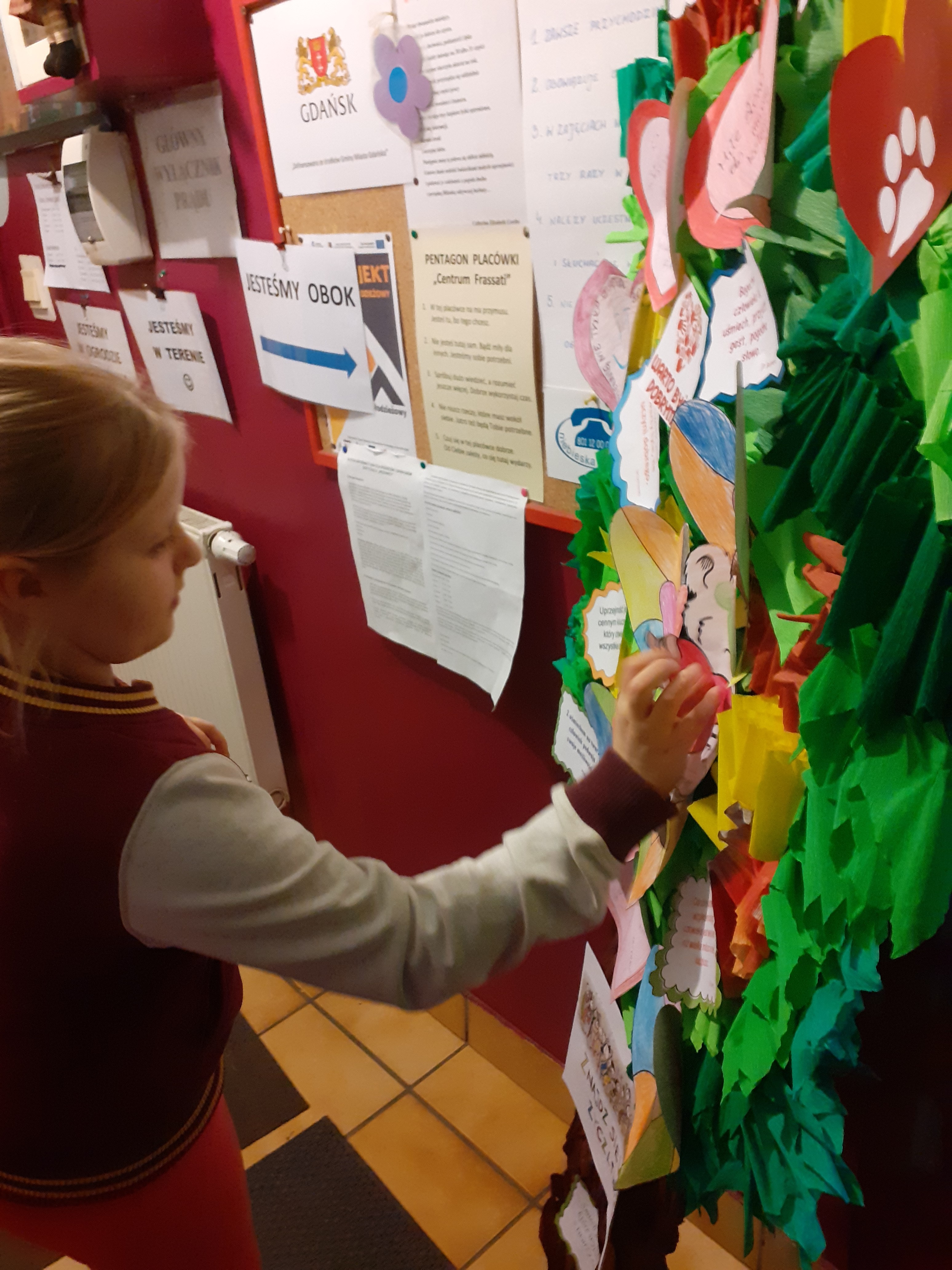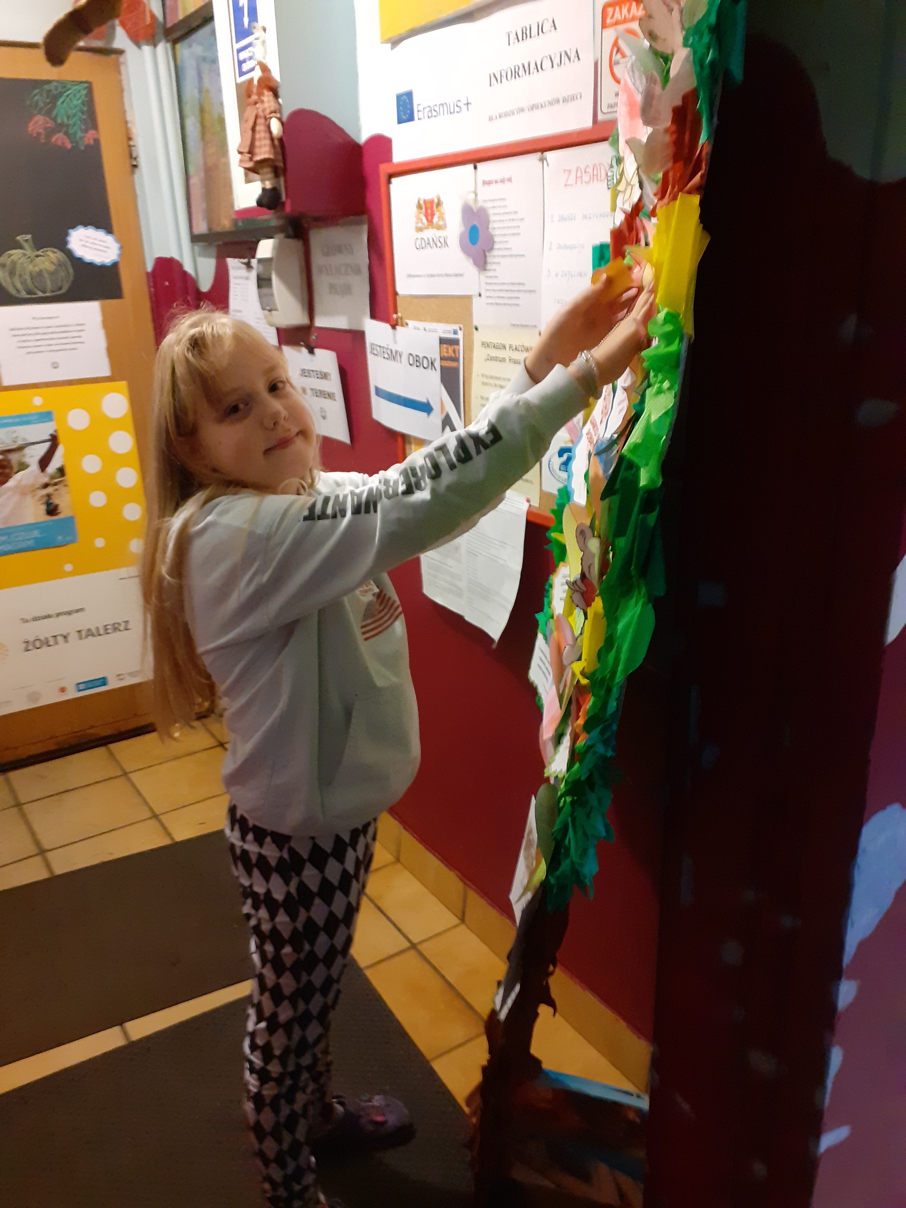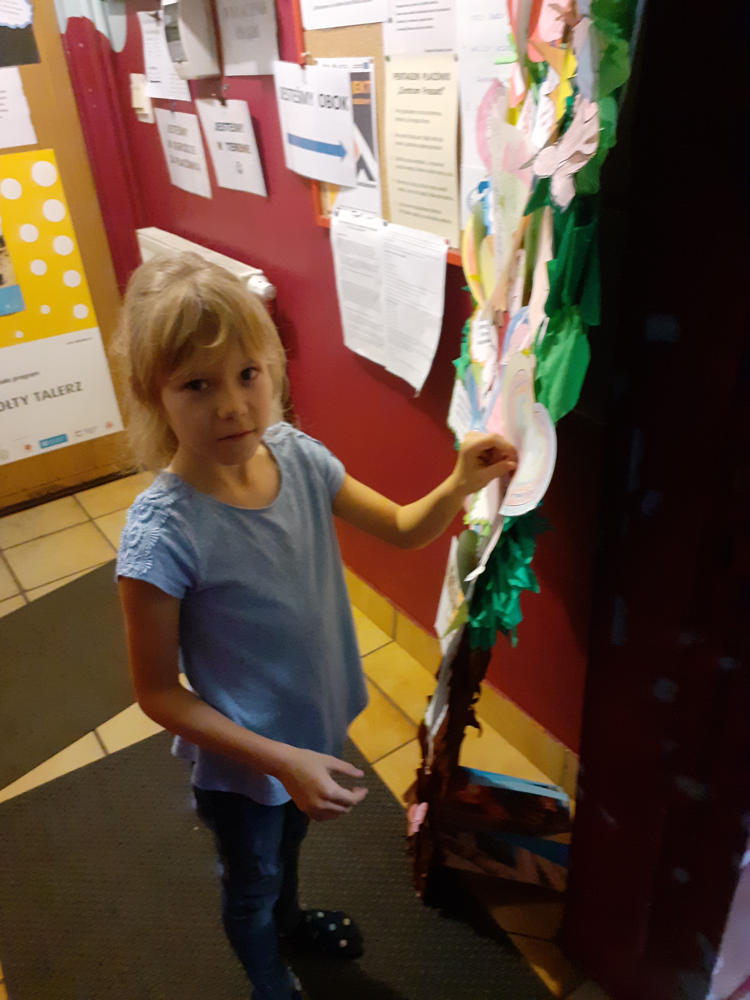 - Dziewczynka przyczepia rysunek do tekturowego drzewa.