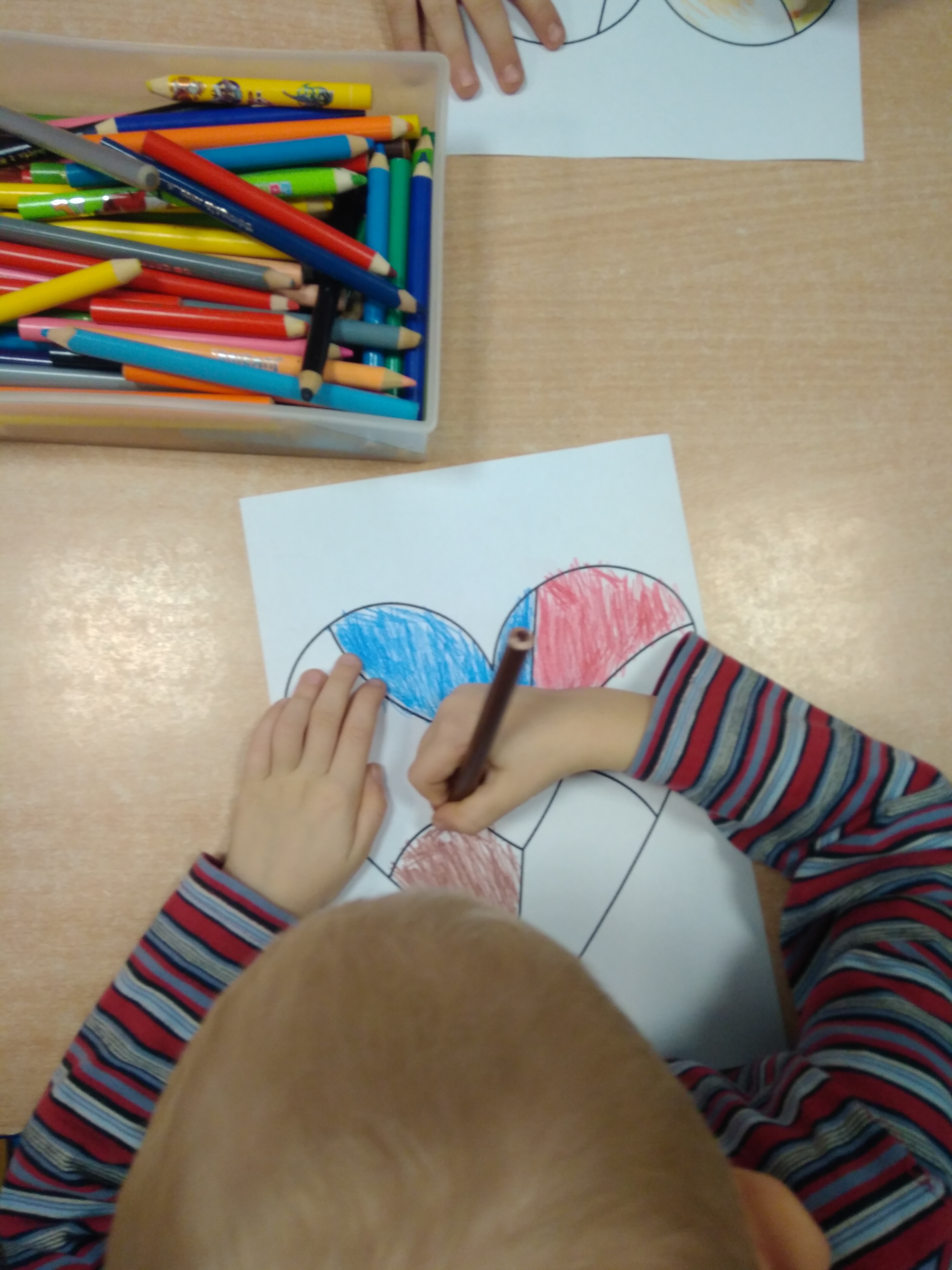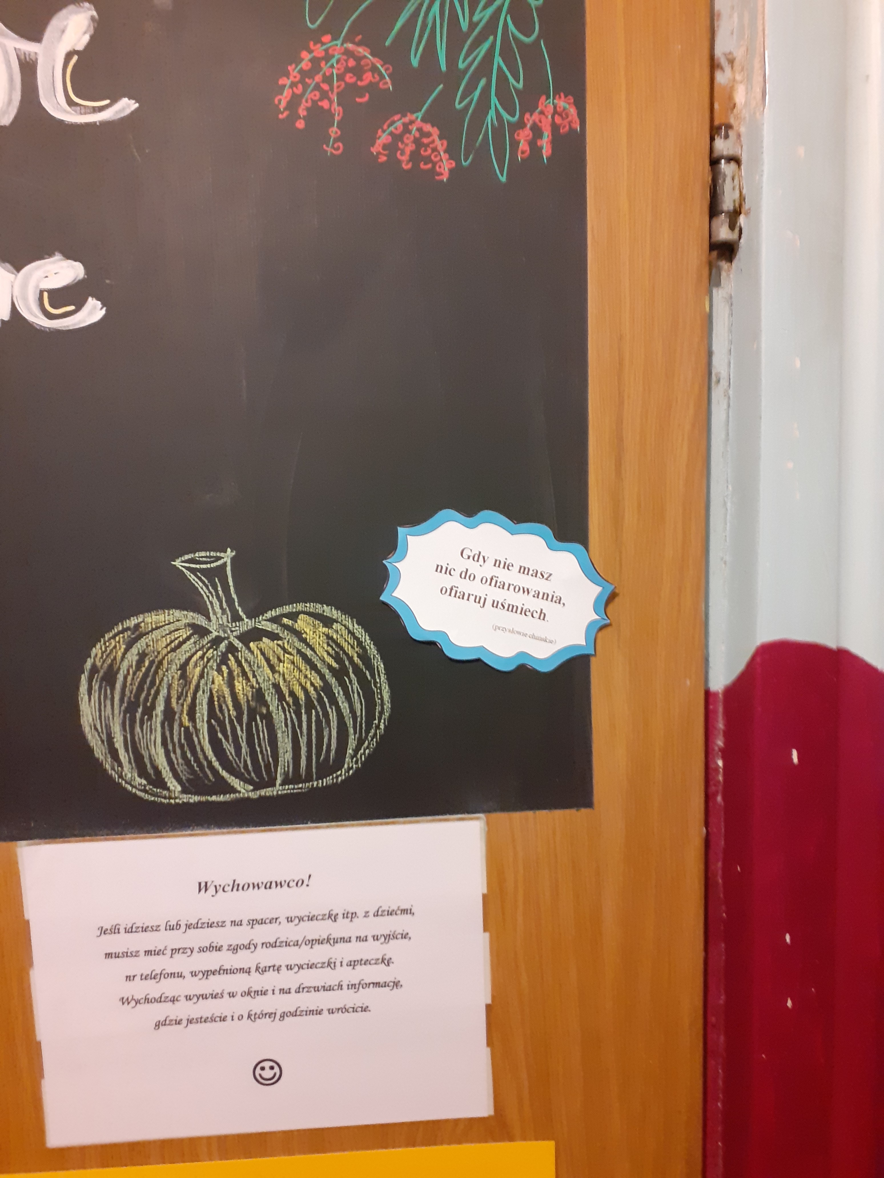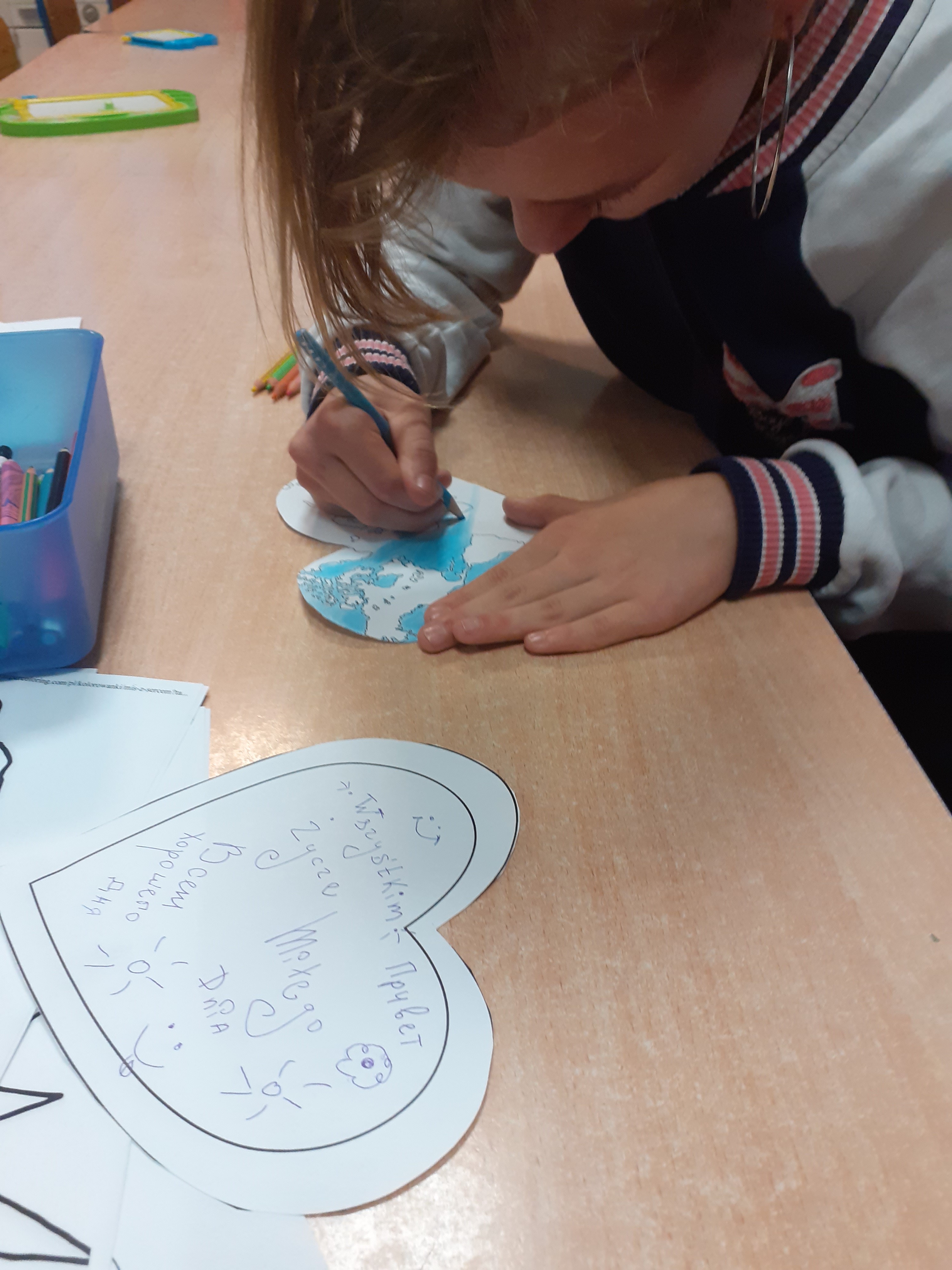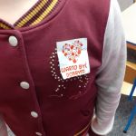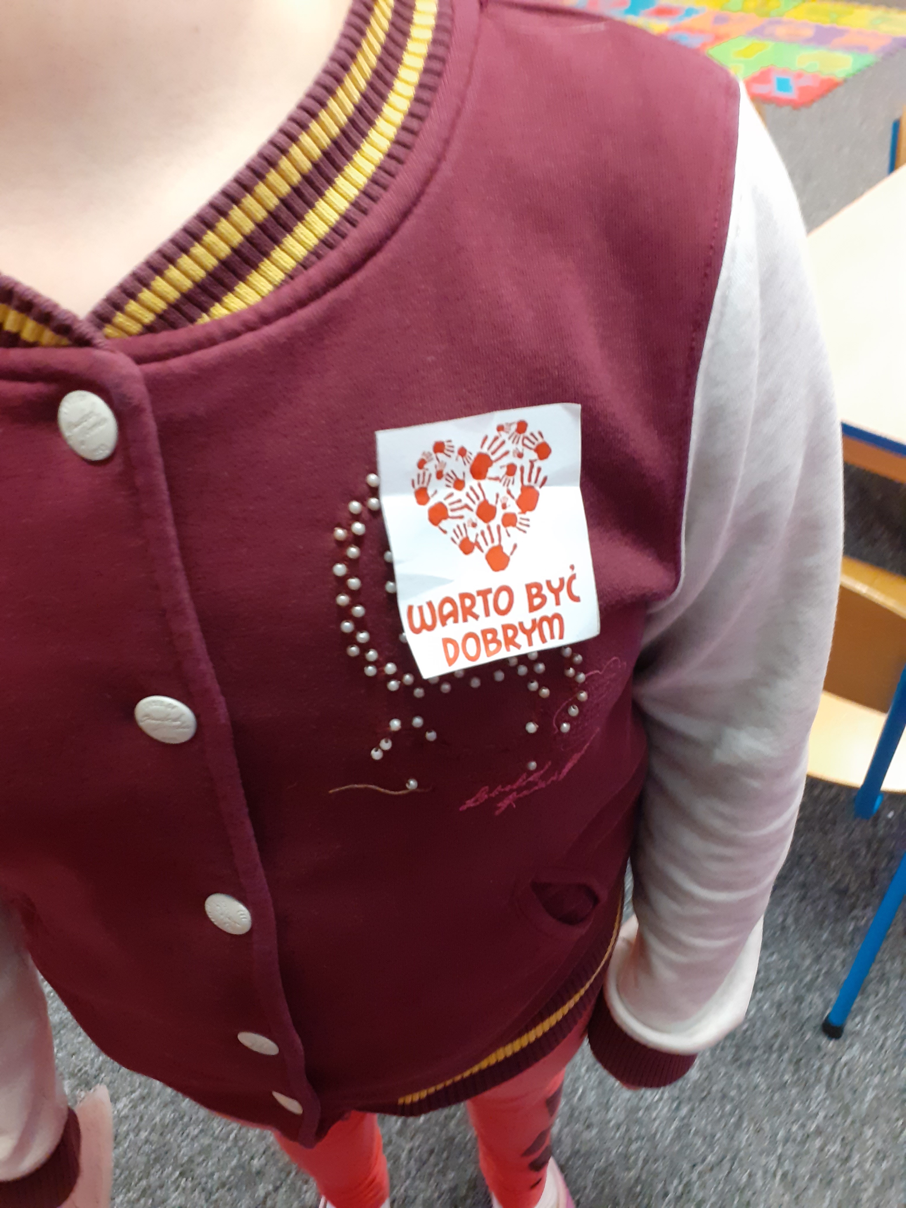- Dziecko z naklejoną na bluzę karteczką z tekstem „Warto być dobrym” oraz serduszkiem.