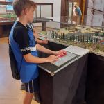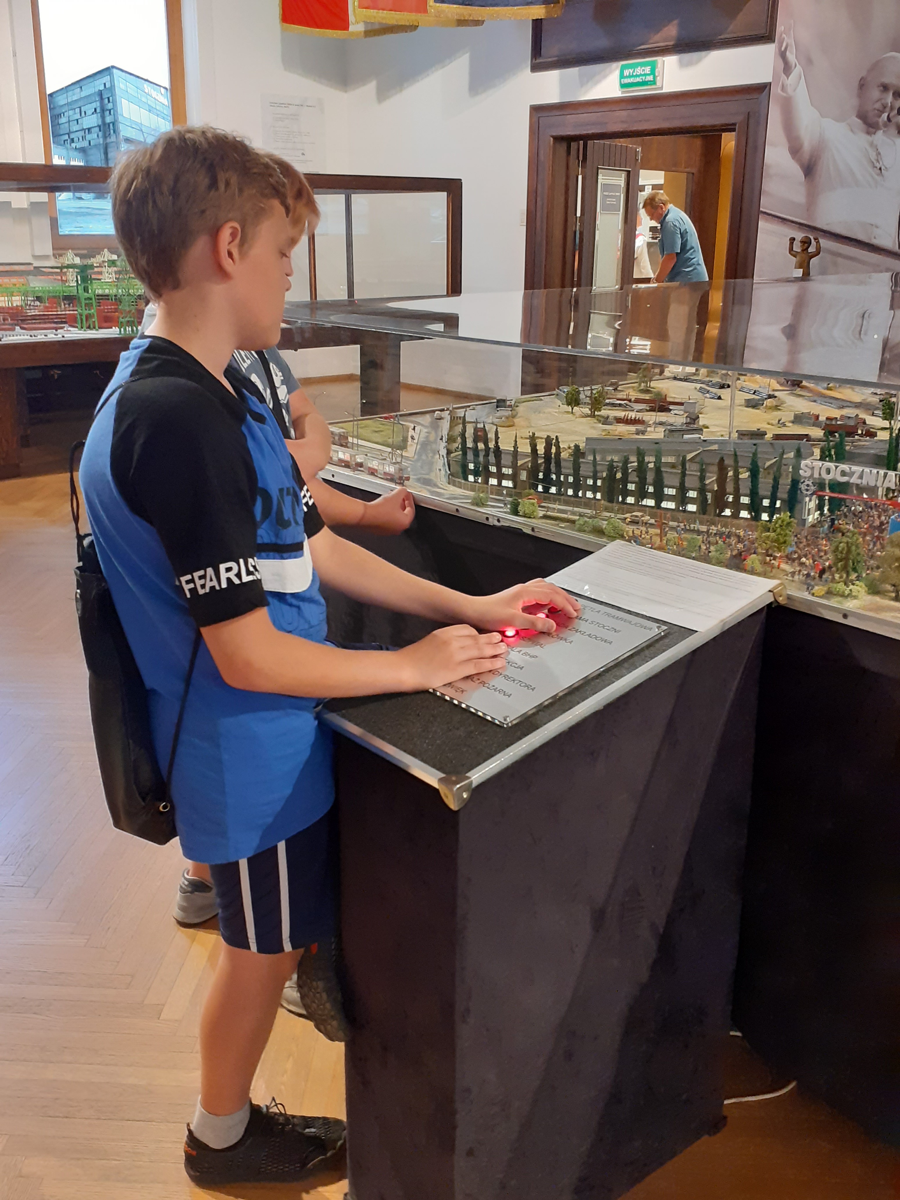 - Chłopiec stoi obok interaktywnej makiety Stoczni Gdańskiej w Europejskim Centrum Solidarności.