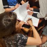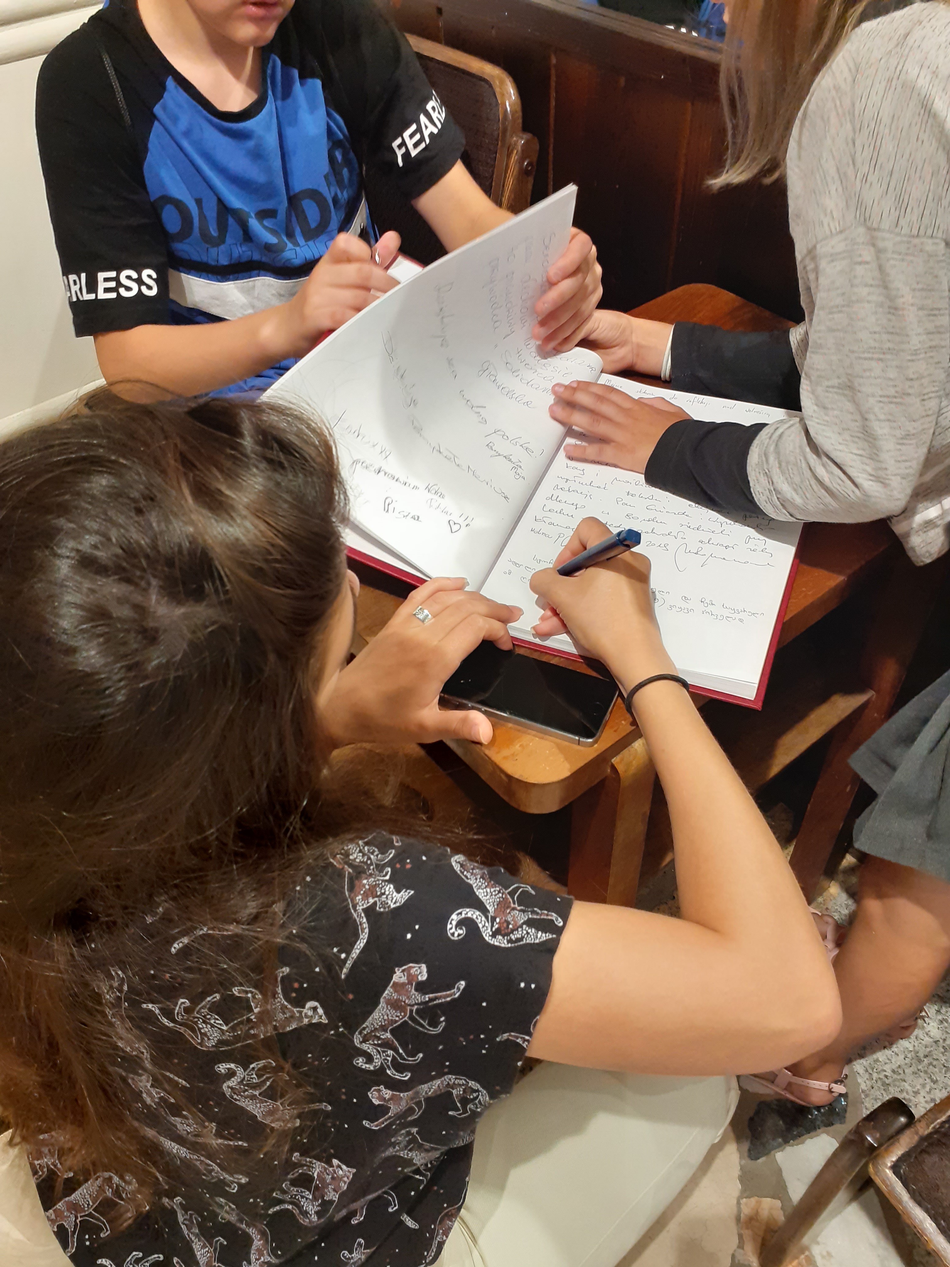 - Dzieci oraz wolontariuszka wpisują się do pamiątkowej księgi w Europejskim Centrum Solidarności.