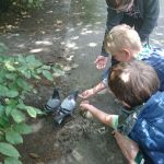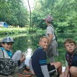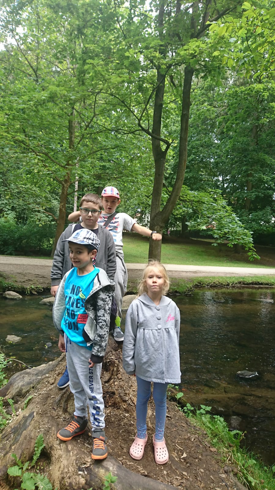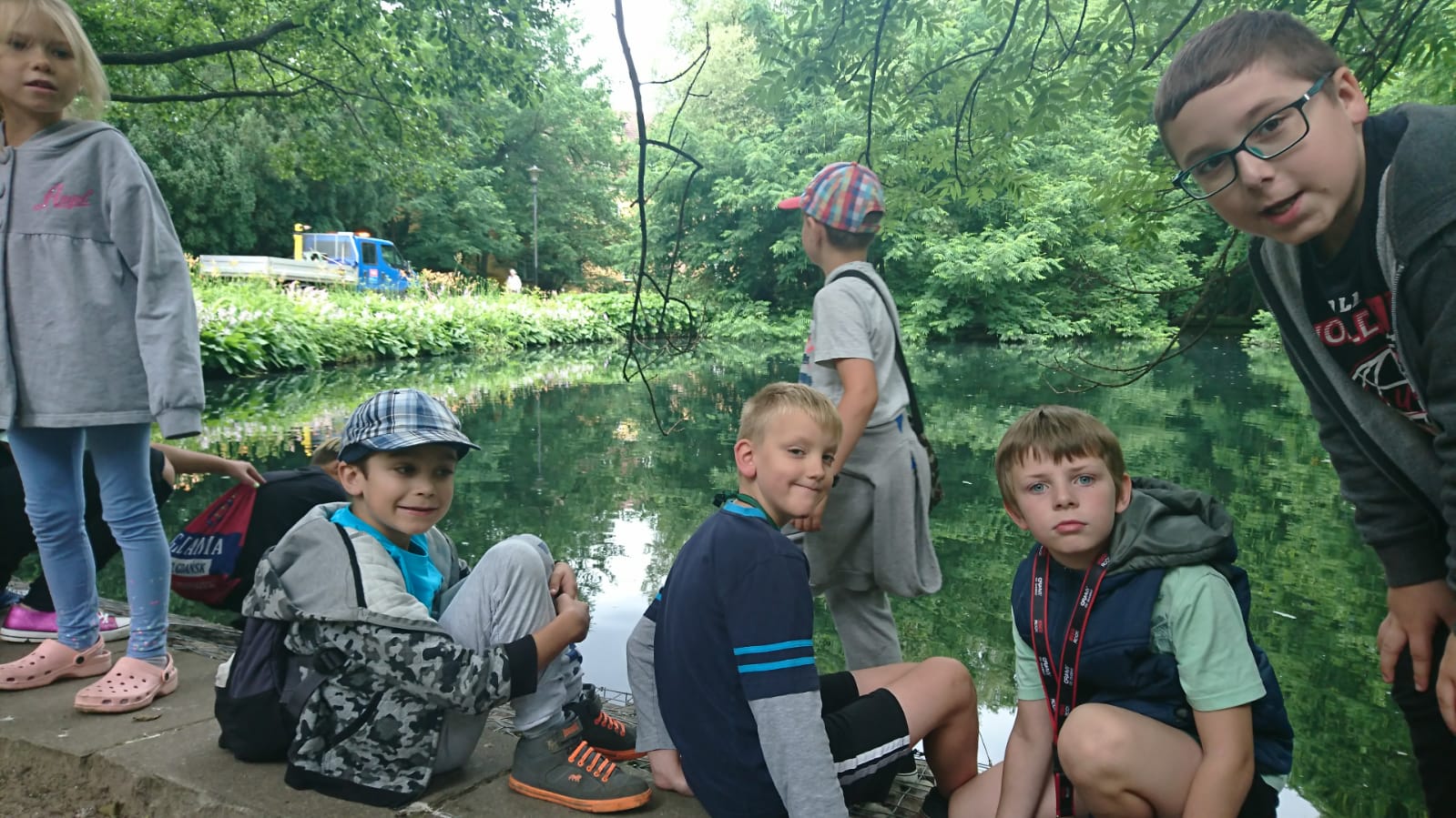 - Grupa dzieci pozuje do zdjęcia przy stawie. W tle stoją drzewa obficie pokryte zielonymi liśćmi.