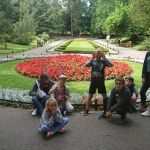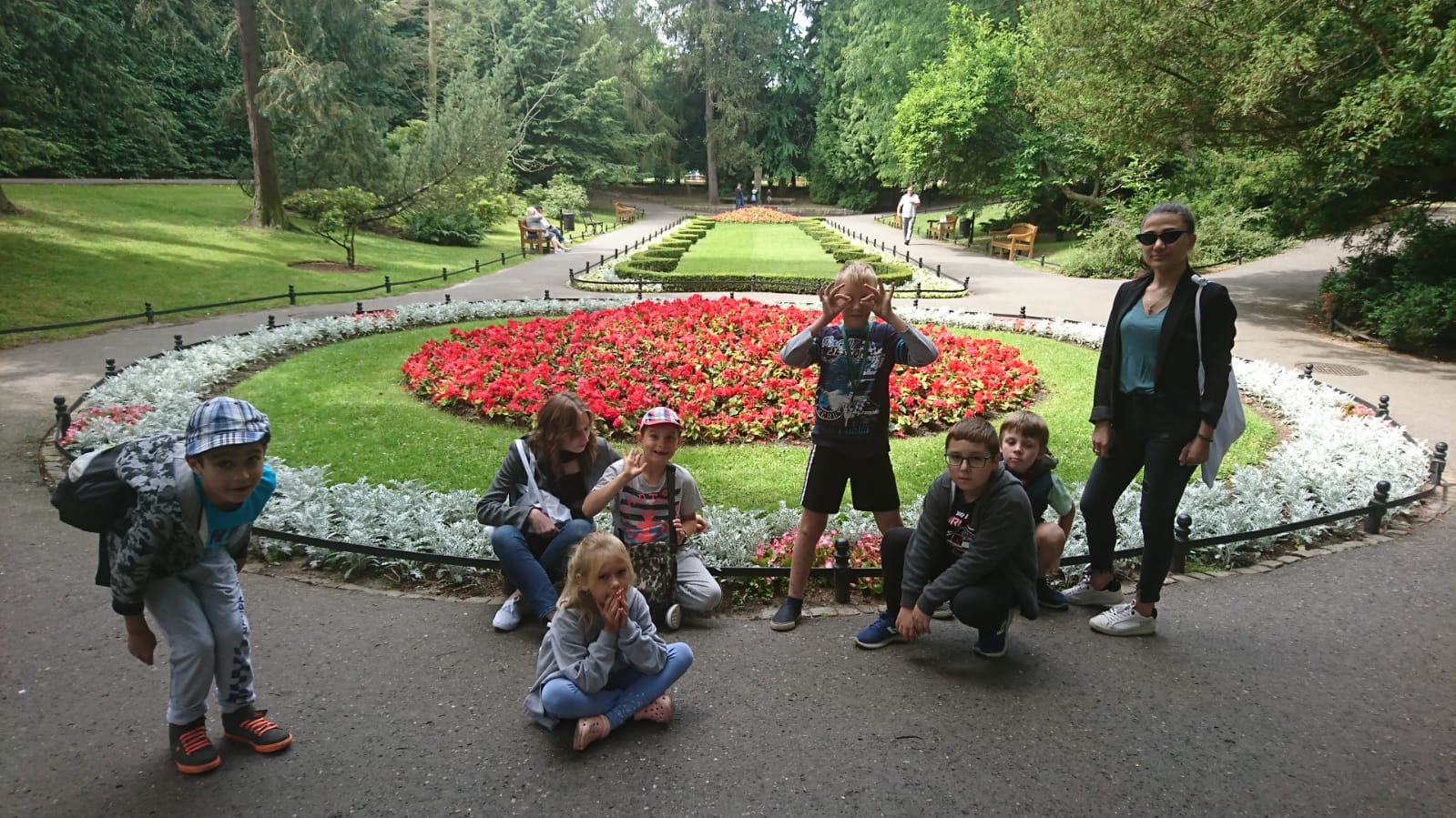 - Grupa dzieci pozuje do zdjęcia na tle czerwonych kwiatów w Parku Oliwskim.