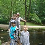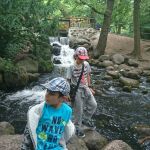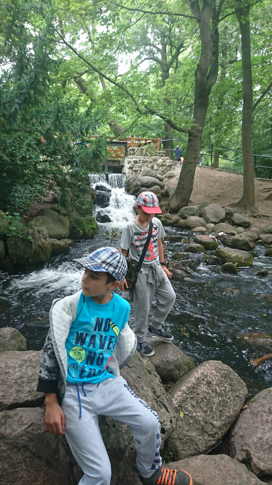 - Dwóch chłopców chodzi po kamieniach, w tle spływa wodospad.