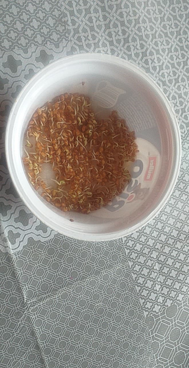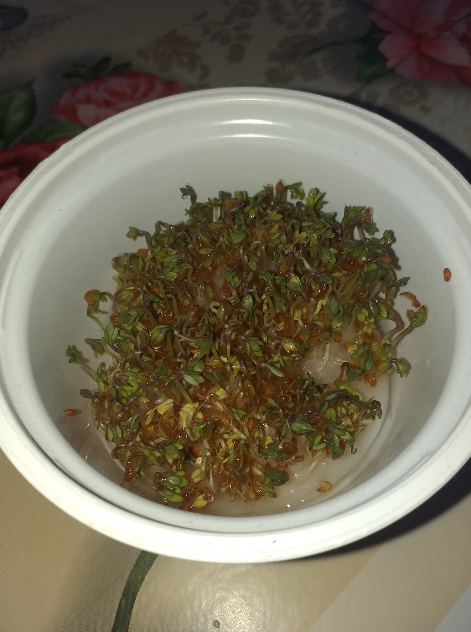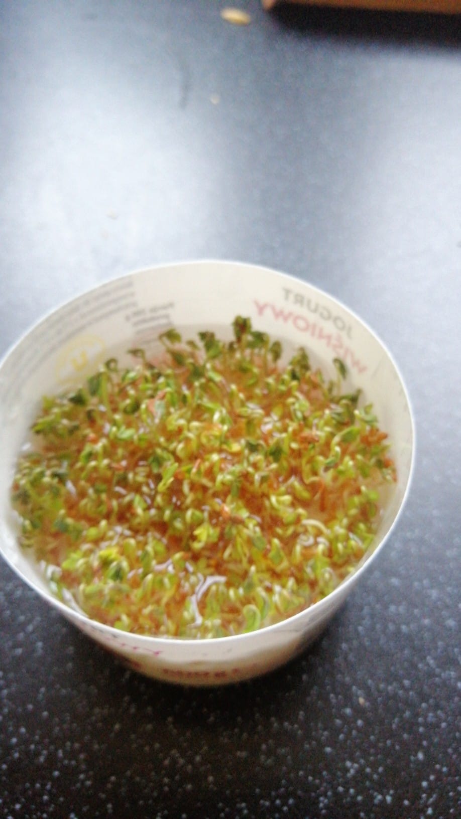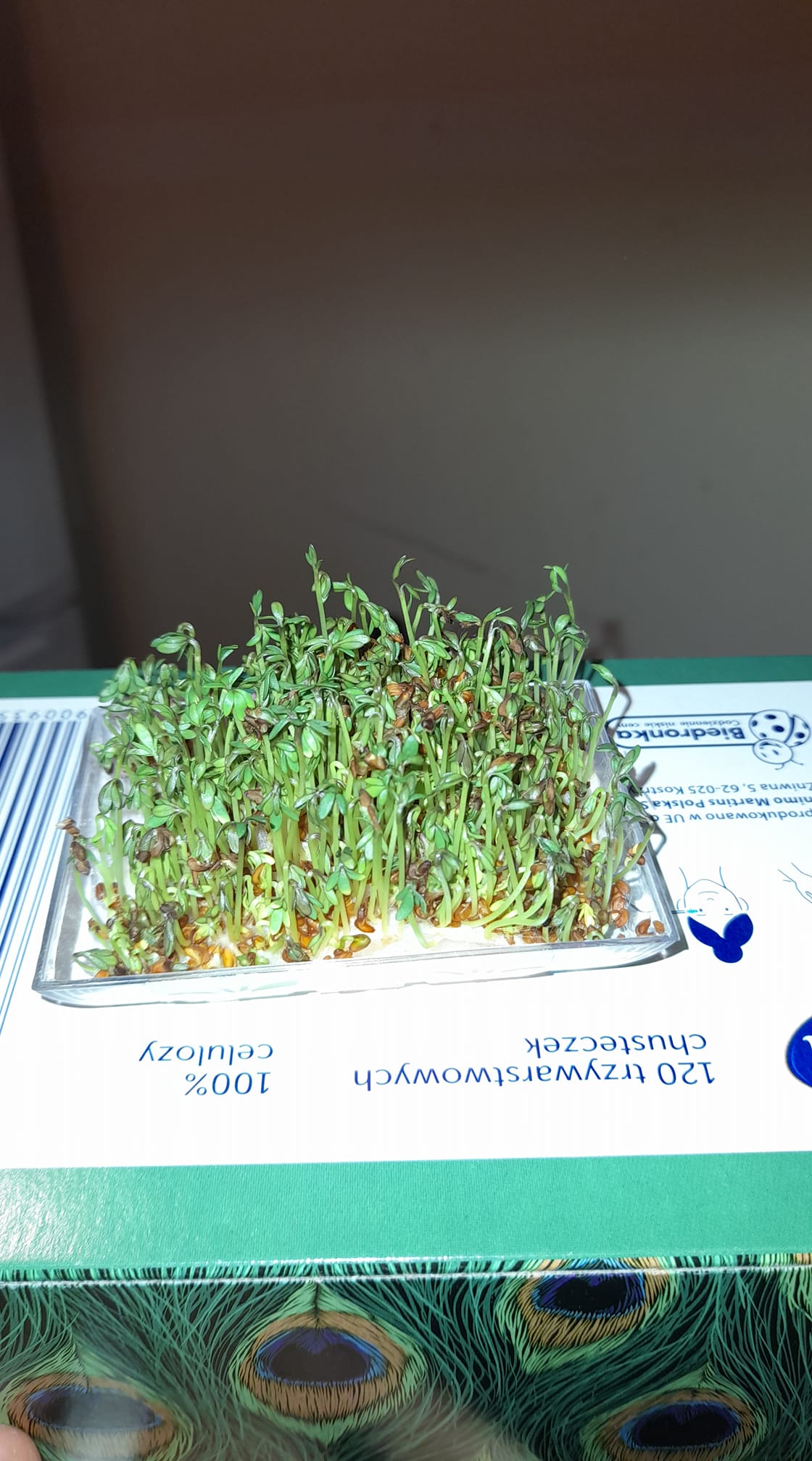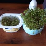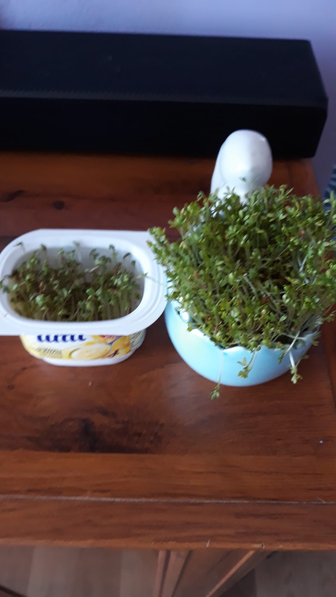 - Rosnąca rzeżucha w szklanej miseczce. Obok drewniana ozdoba Wielkanocna.