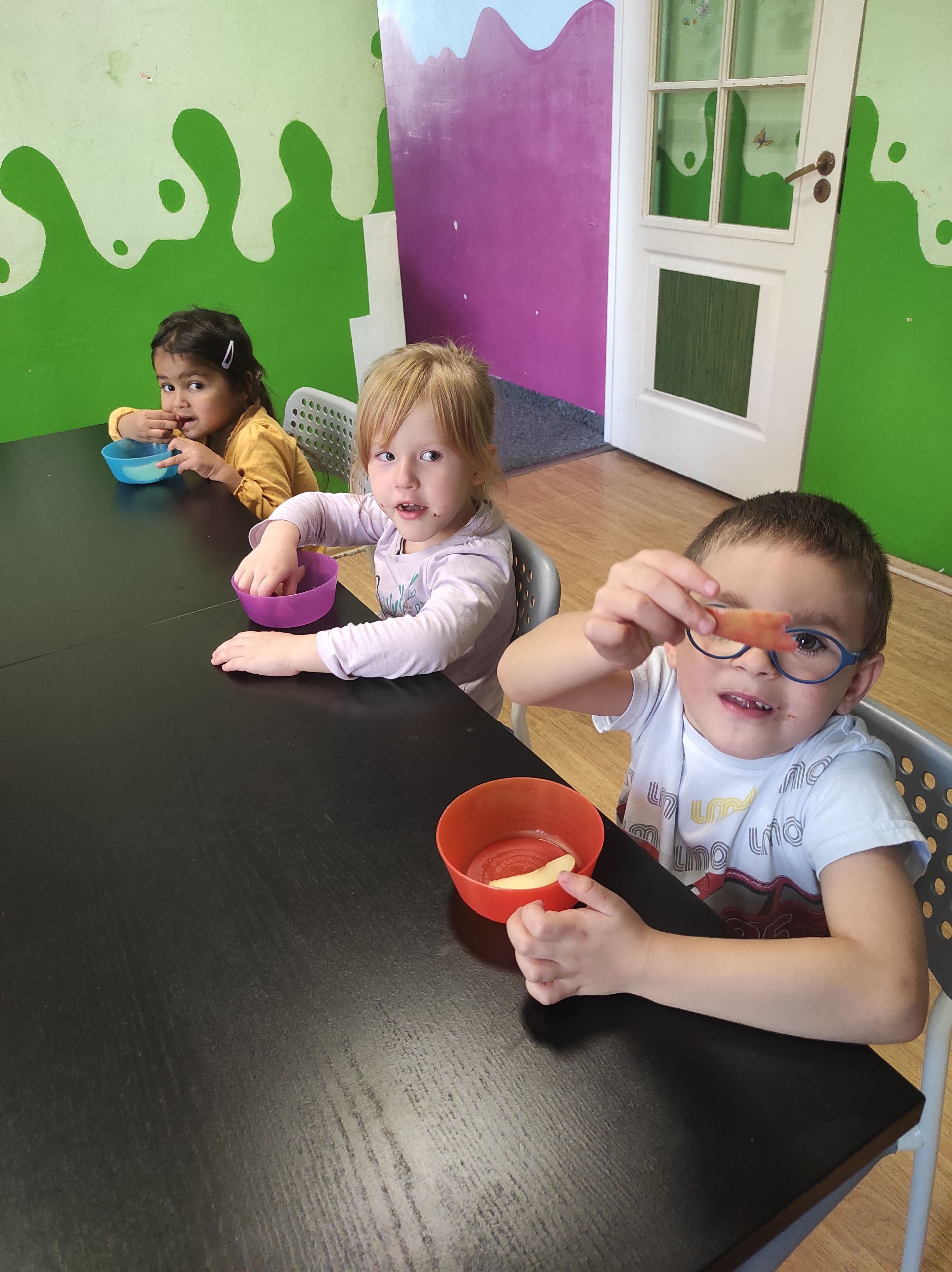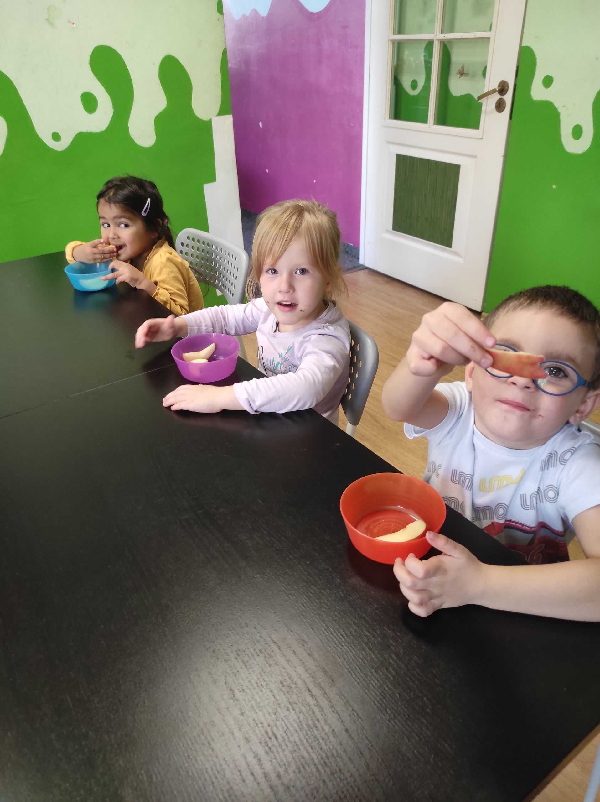 26.10.2021r. na deser w naszym Centrum podano jabłka. Dzieci ze wszystkich grup opisywały ich kolory oraz fakturę, okazało się, że każde jabłko nieco się różniło. Podczas zajęć rozmawialiśmy o tym skąd w ogóle biorą się jabłka i doszliśmy do odkrycia ich niesamowitego cyklu rozwoju. Dziękujemy, że dzięki Kulczyk Foundation możemy uczyć się nowych rzeczy i odkrywać otaczający nas świat.