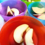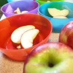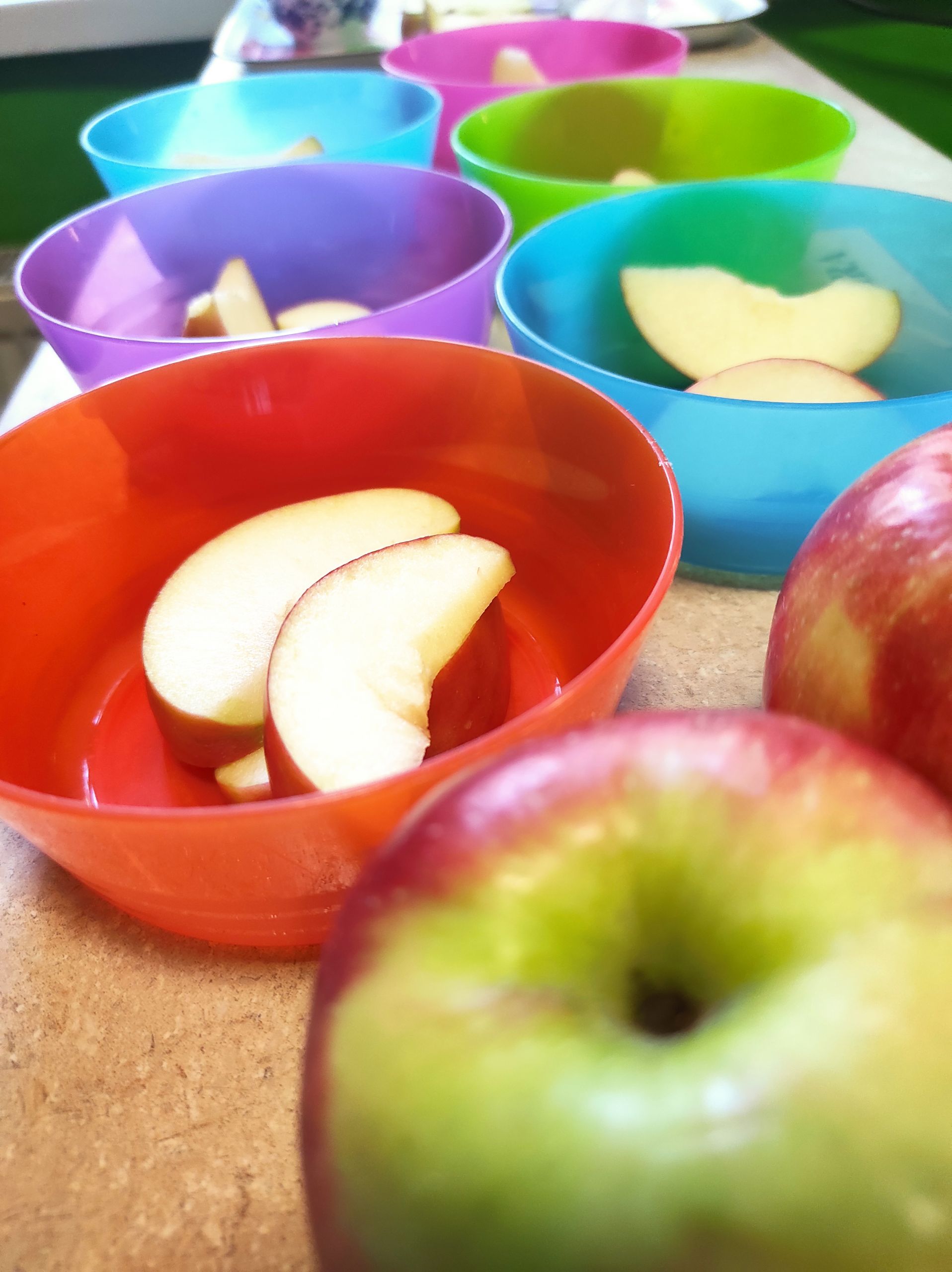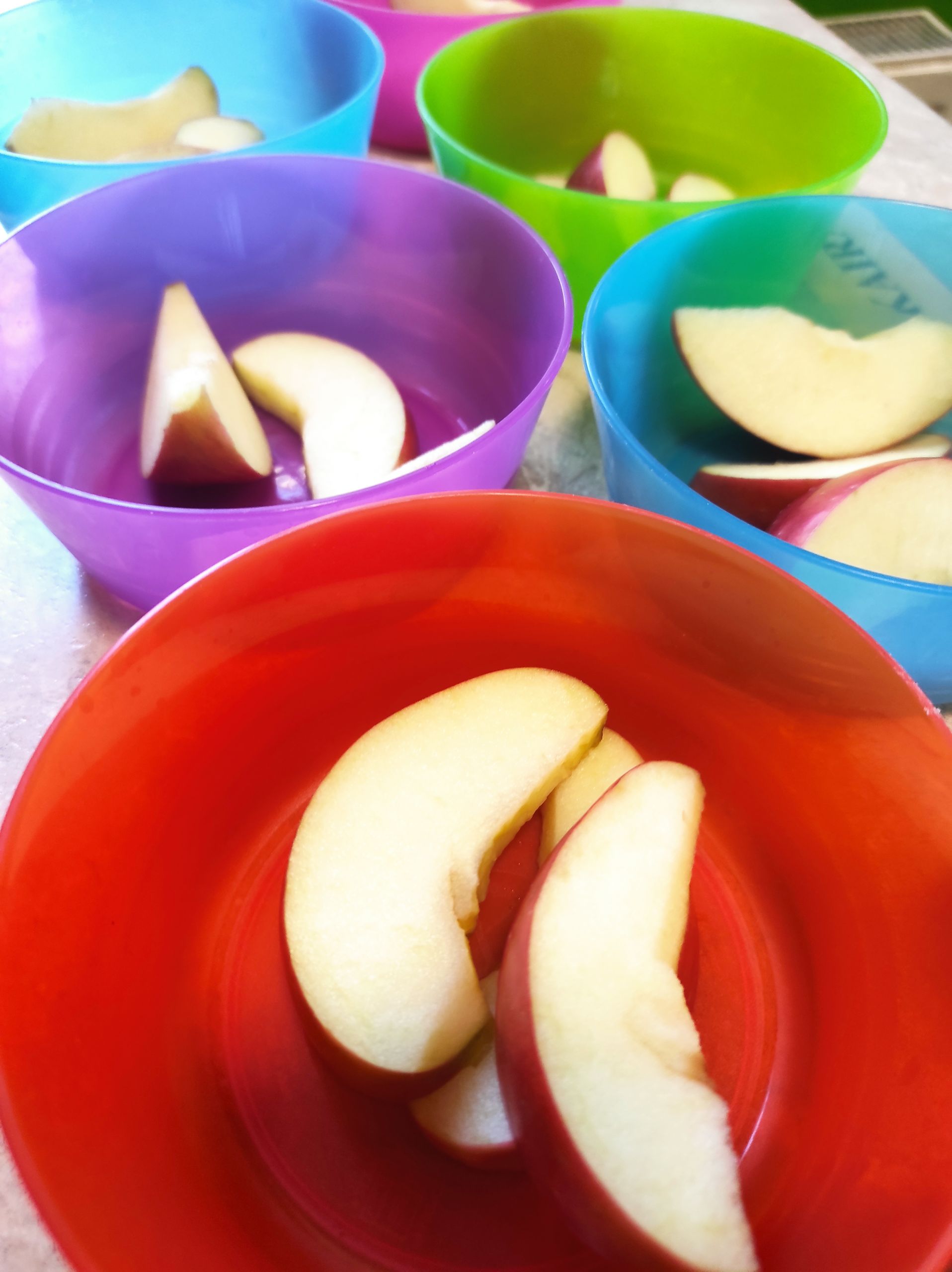 - Na pierwszym planie jabłko, w tle kolorowe miseczki z pokrojonymi kawałkami jabłka.