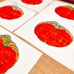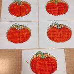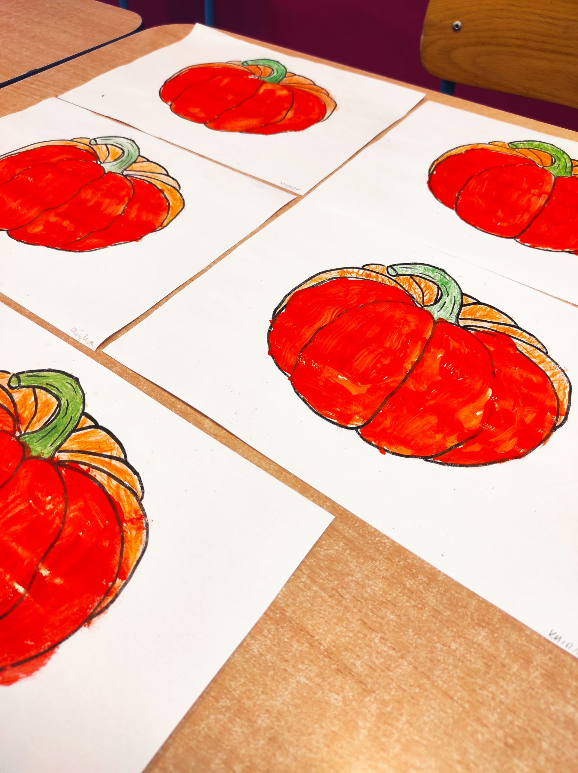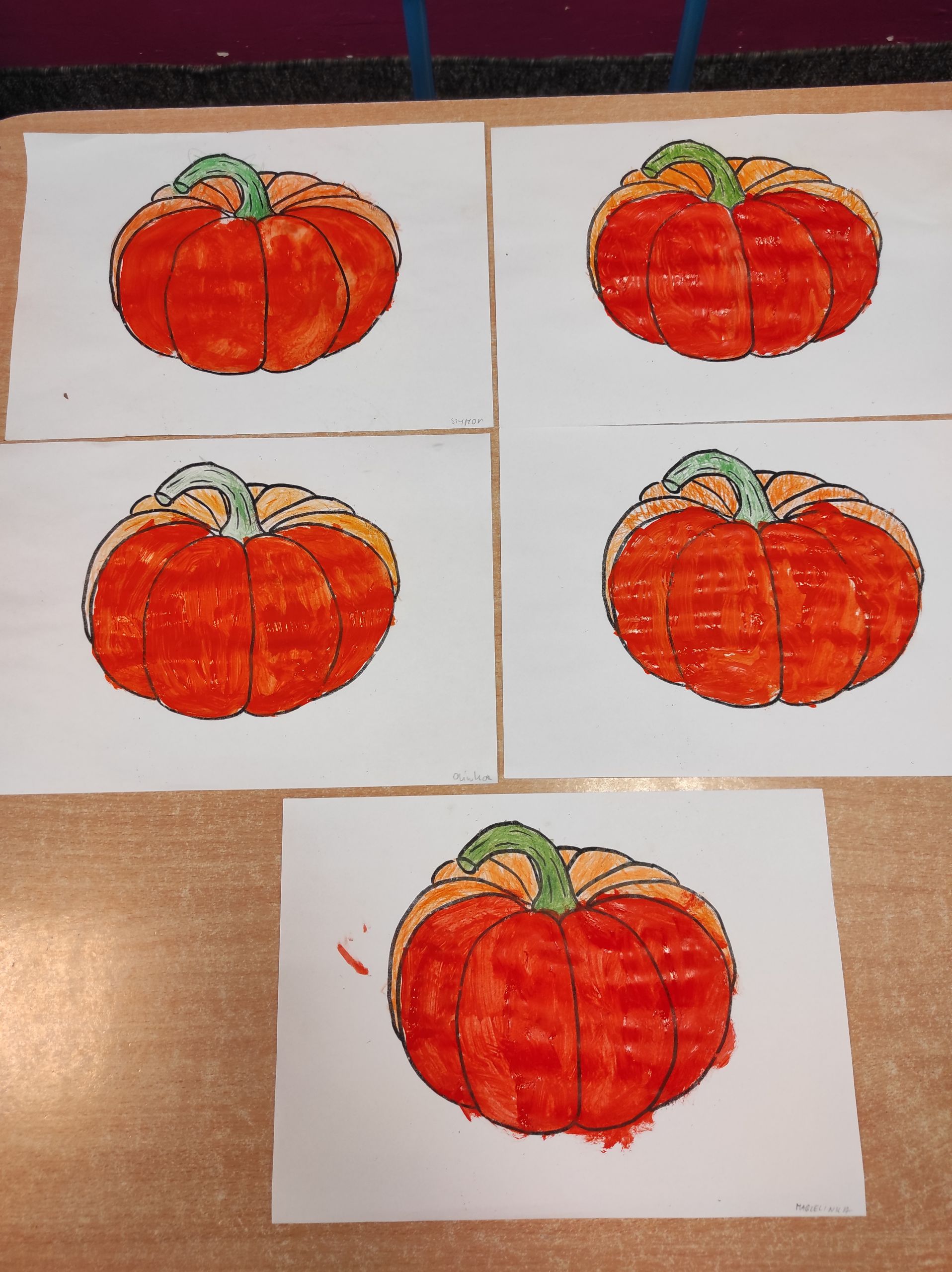 - Prace plastyczne przedstawiające dynie leżą obok siebie na stoliku.