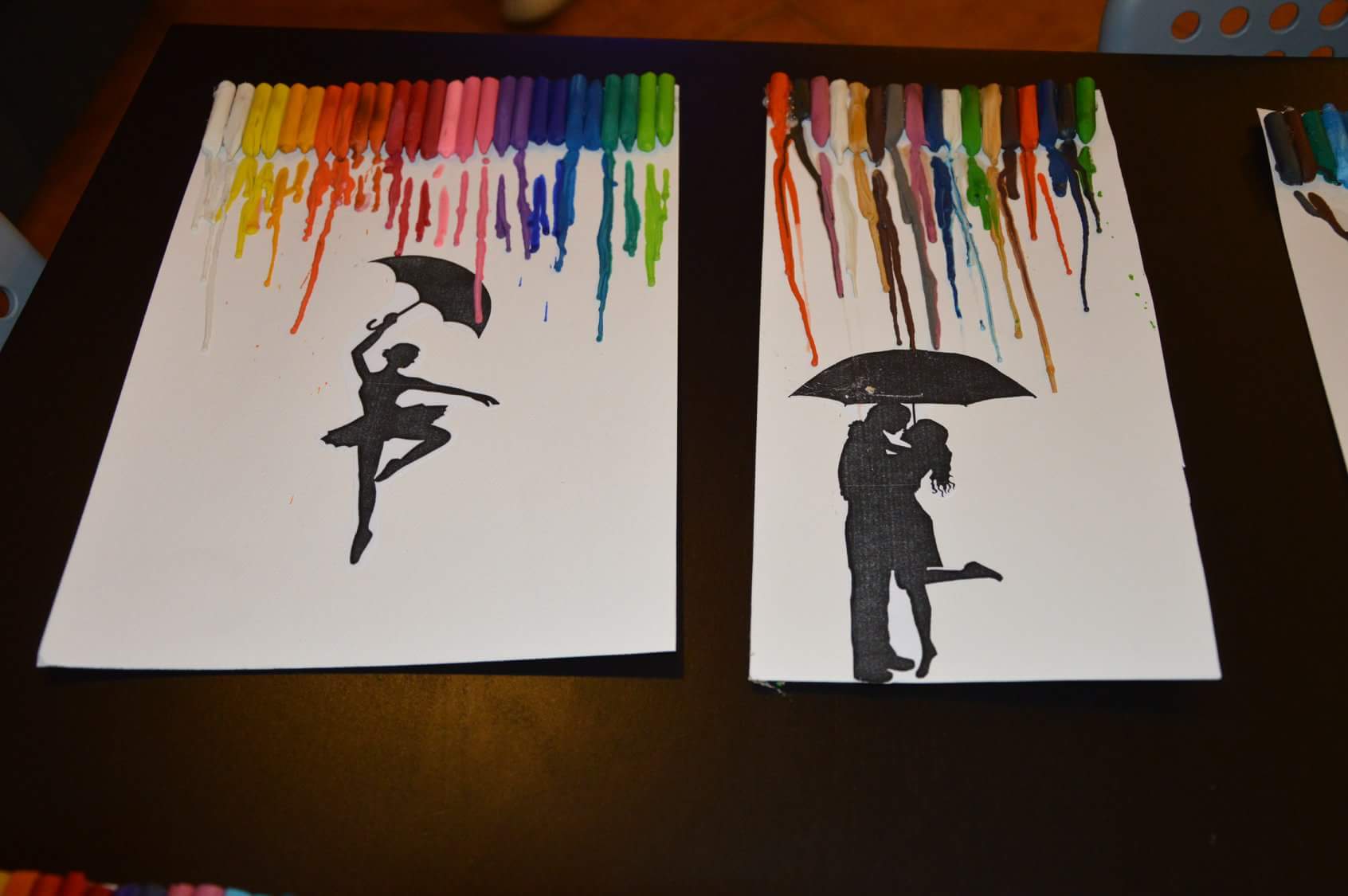 W poniedziałek, 09.07., zainspirowani deszczem, który padał za oknami Centrum Frassati,  podopieczni z grupy „Sparta” przygotowali prace w ramach zajęć plastycznych. Przy użyciu sylwetek postaci z parasolami oraz starych kredek świecowych, które po  przyklejeniu do kartki topiliśmy, wykonaliśmy jedyne w swoim rodzaju „deszczowe kolaże”.