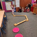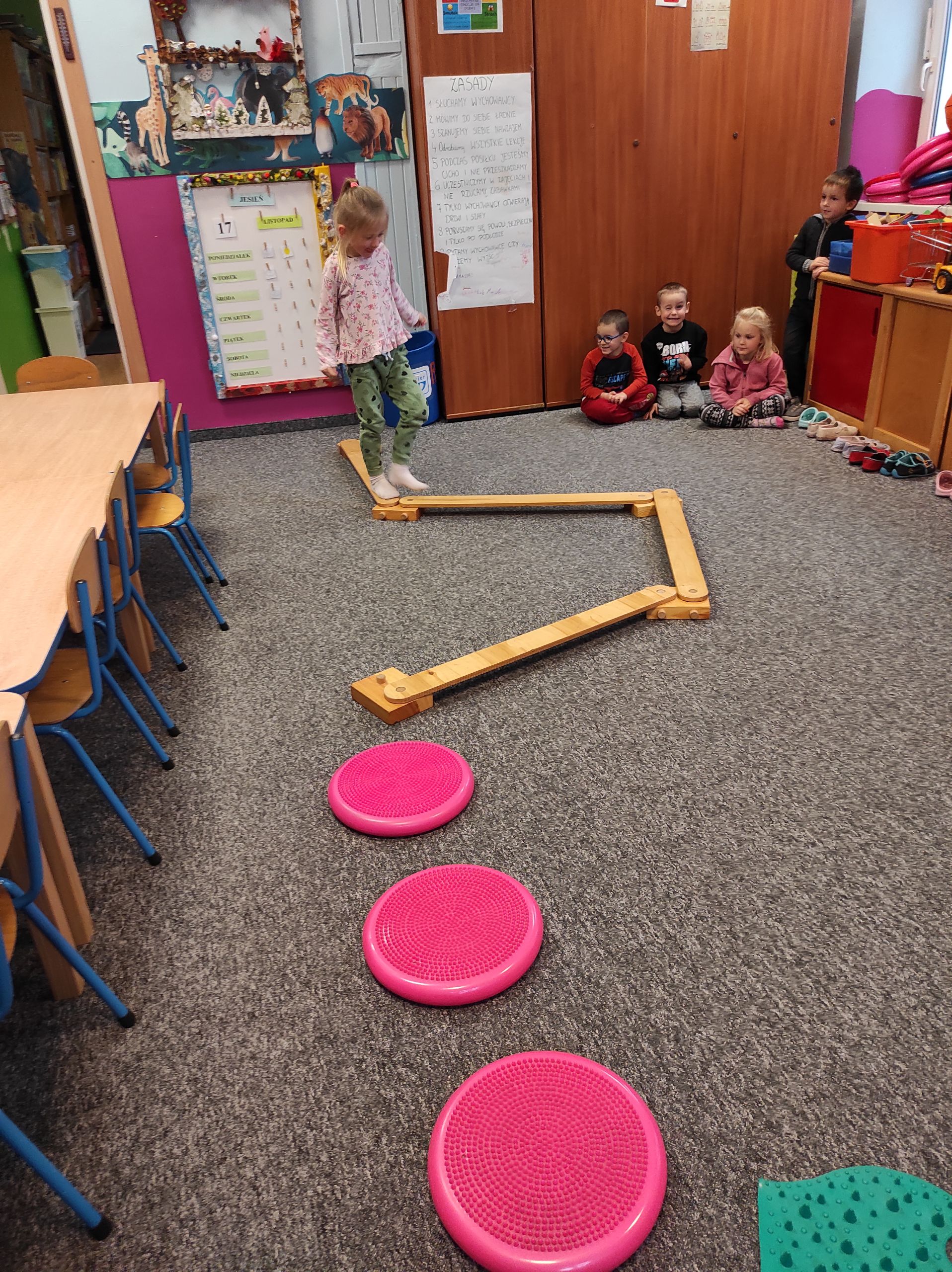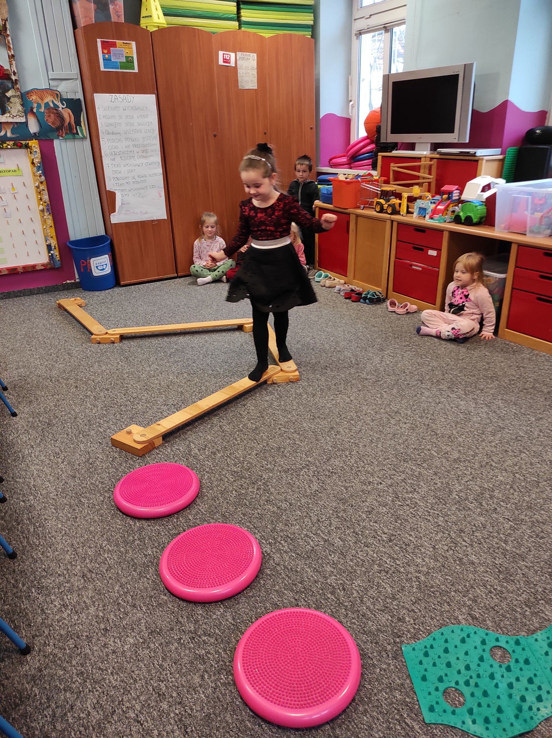 - Dziewczynka w sukience chodzi po różowych kołach próbując utrzymać rónowagę. W tle siedzą dzieci, które obserwują jej zmagania.