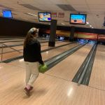 - Dziewczyna trzyma kulę i szykuje się do zbicia kręgli.