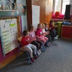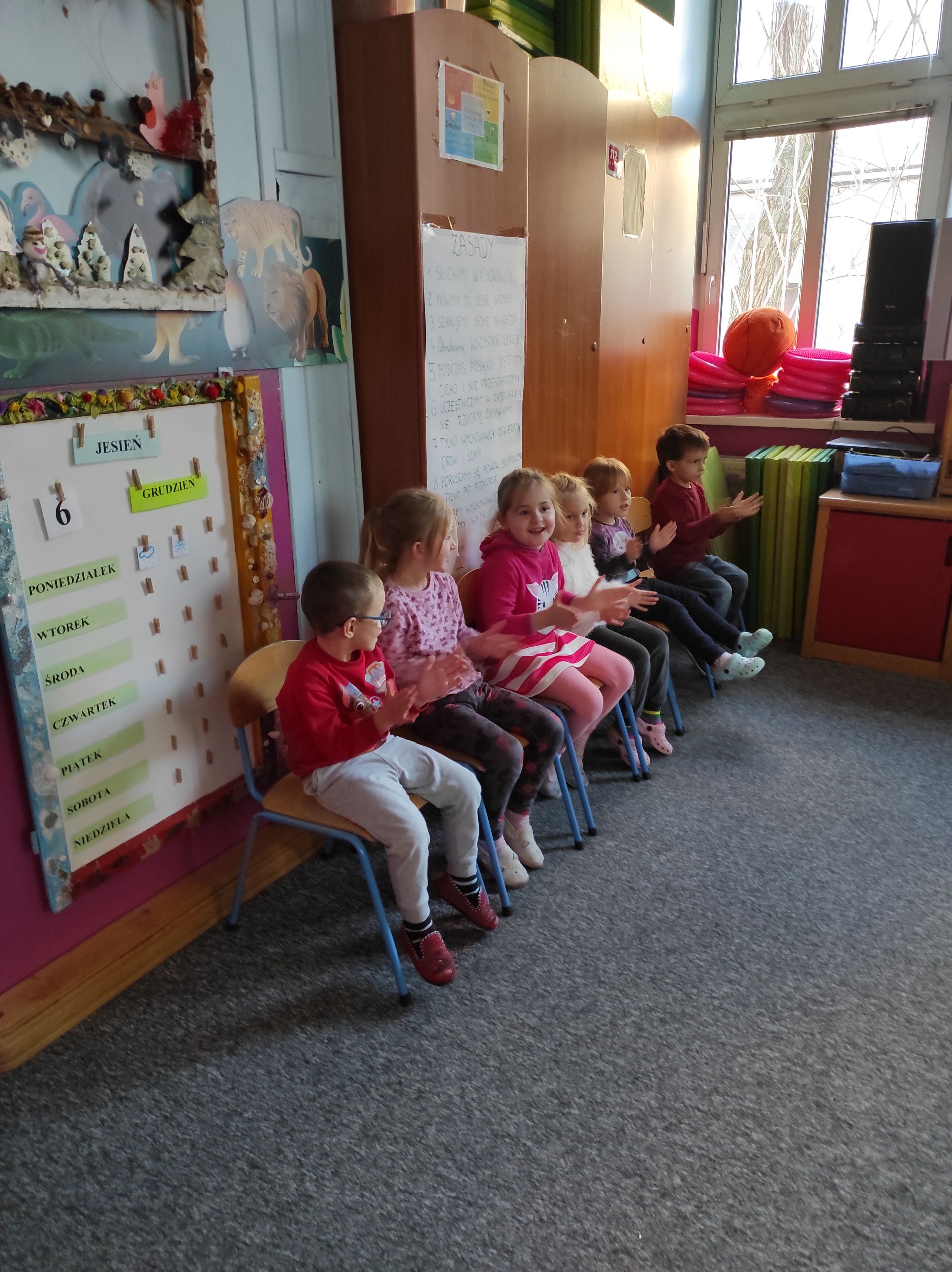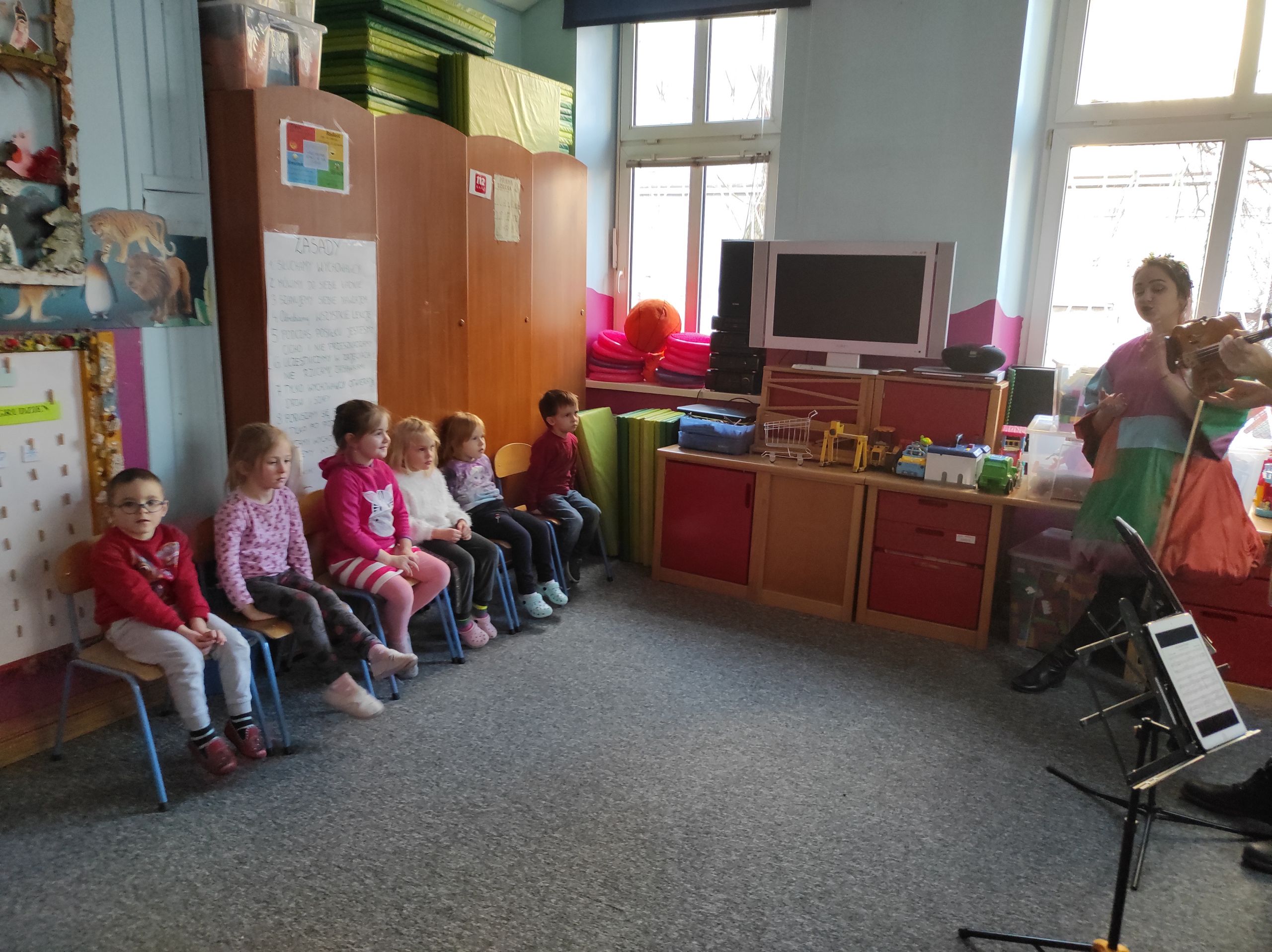 - Dzieci siedzą na krzesłach słuchając koncertu i klaszcząc.