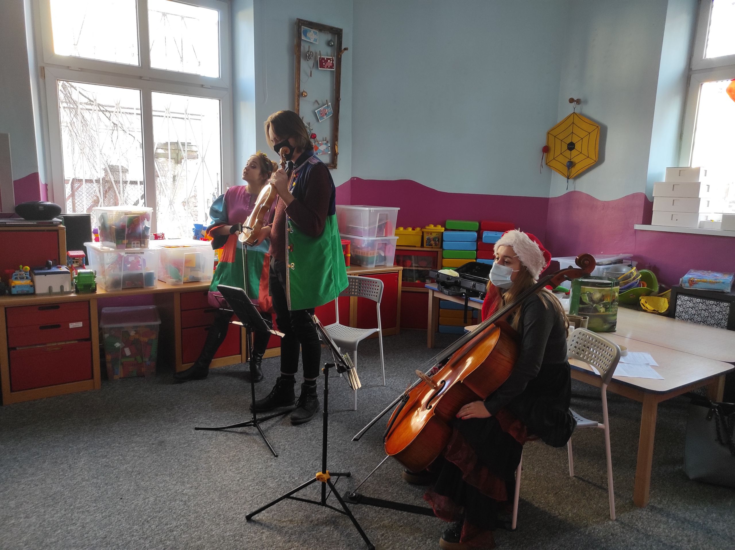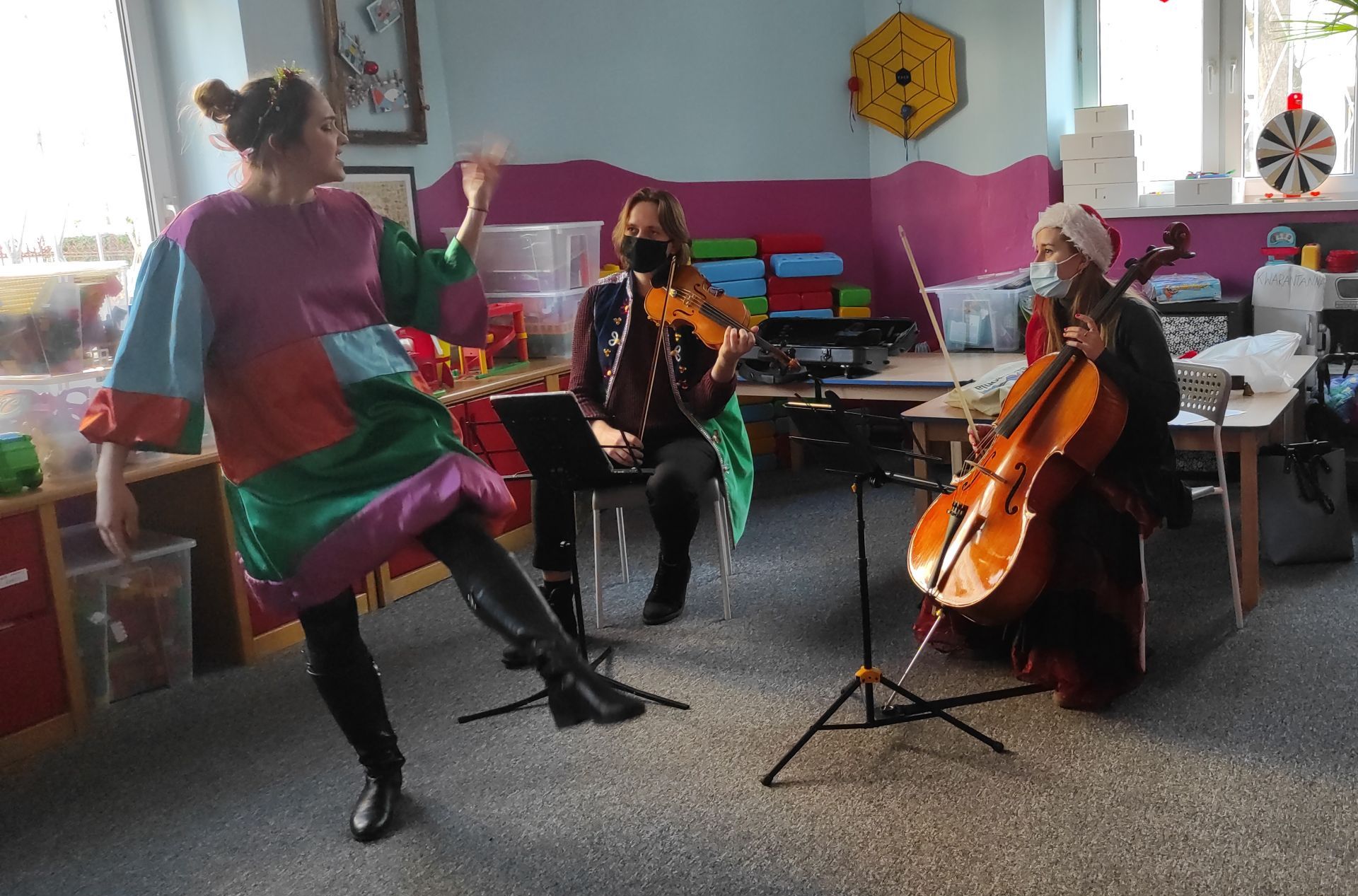 07.12.2021r. odwiedzili nas artyści z grupy artystycznej Pro Musica. Tym razem przedstawili nam muzyczną opowieść o Królowej Śniegu, która momentami była przerażająca, ale oczywiście skończyła się bardzo dobrze. Podczas koncertu poznaliśmy nazwy oraz budowę instrumentów muzycznych i usłyszeliśmy wiele znanych nam kolęd. To spotkanie wprawiło nas w iście świąteczny nastrój, a to dobrze, bo Święta zbliżają się wielkimi krokami! Dziękujemy naszym artystom za odwiedziny i do zobaczenia w nowym roku! 🙂