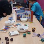 - Dzieci siedzą przy stole. Na stole kasztany, miseczki oraz plastelina – wszystko co potrzebne do zajęć plastycznych.