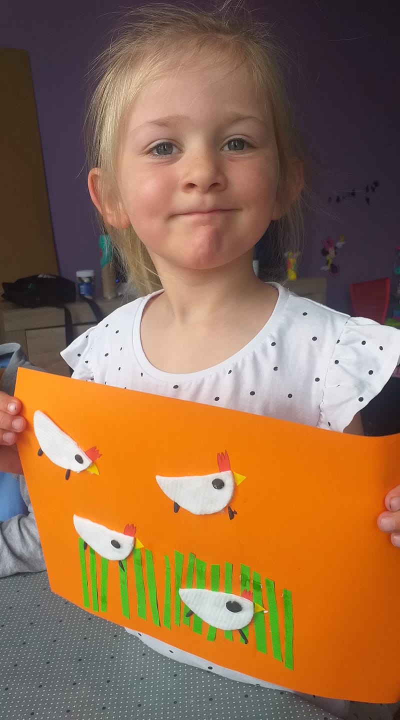 Pomimo odległości nasze dzieciaki cały czas wywołują uśmiechy na naszych twarzach. Tym razem dostałyśmy zdjęcia od Marcelinki i Szymona, którzy wykonali zaproponowaną przez nas pracę plastyczną – kurki na zielonej trawce 😉 Cieszymy się, że nasi podopieczni są z nami w stałym kontakcie oraz że czerpią z zajęć, które dla nich przygotowujemy!
