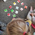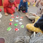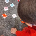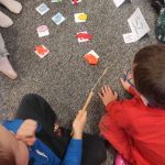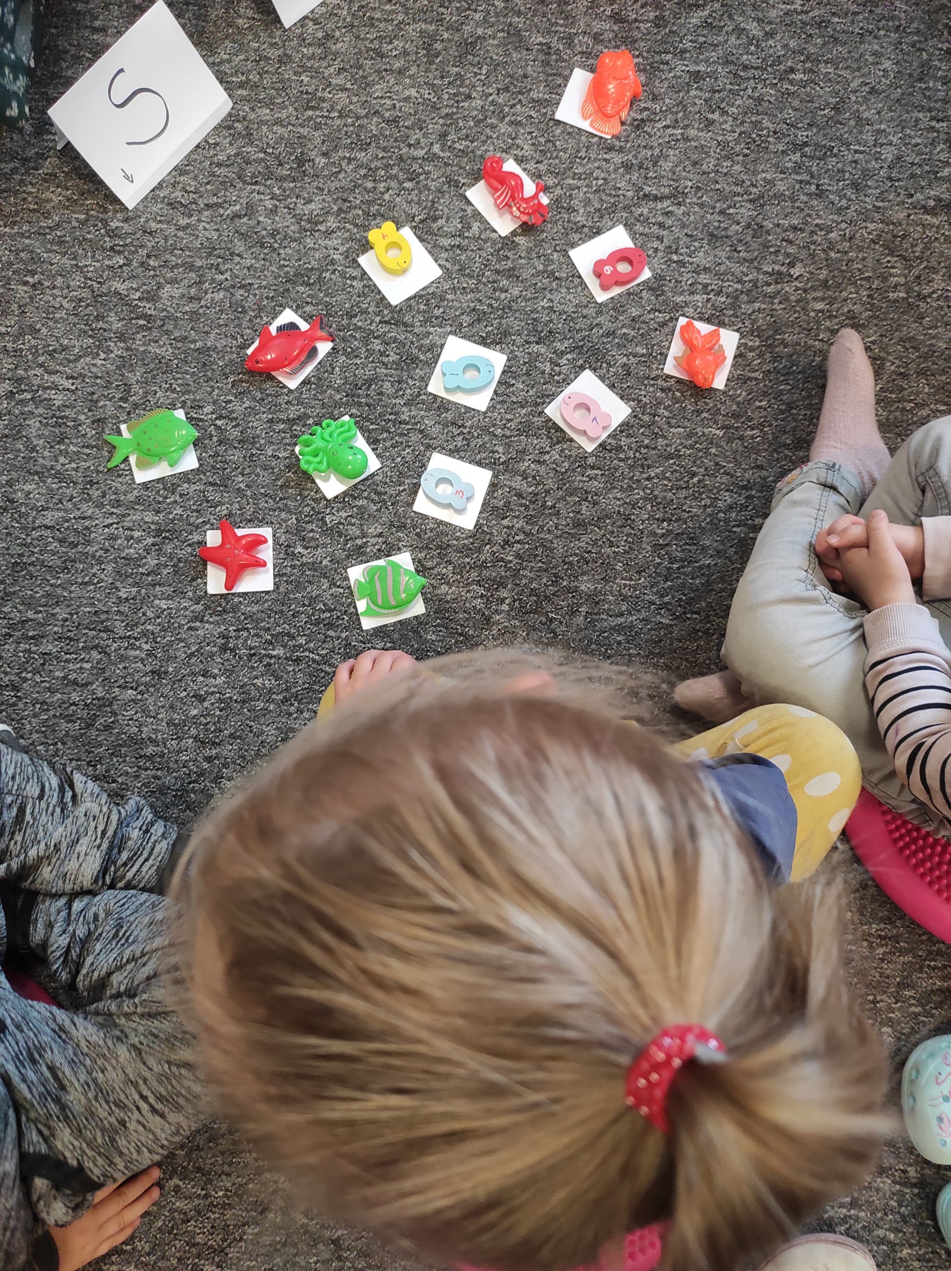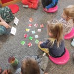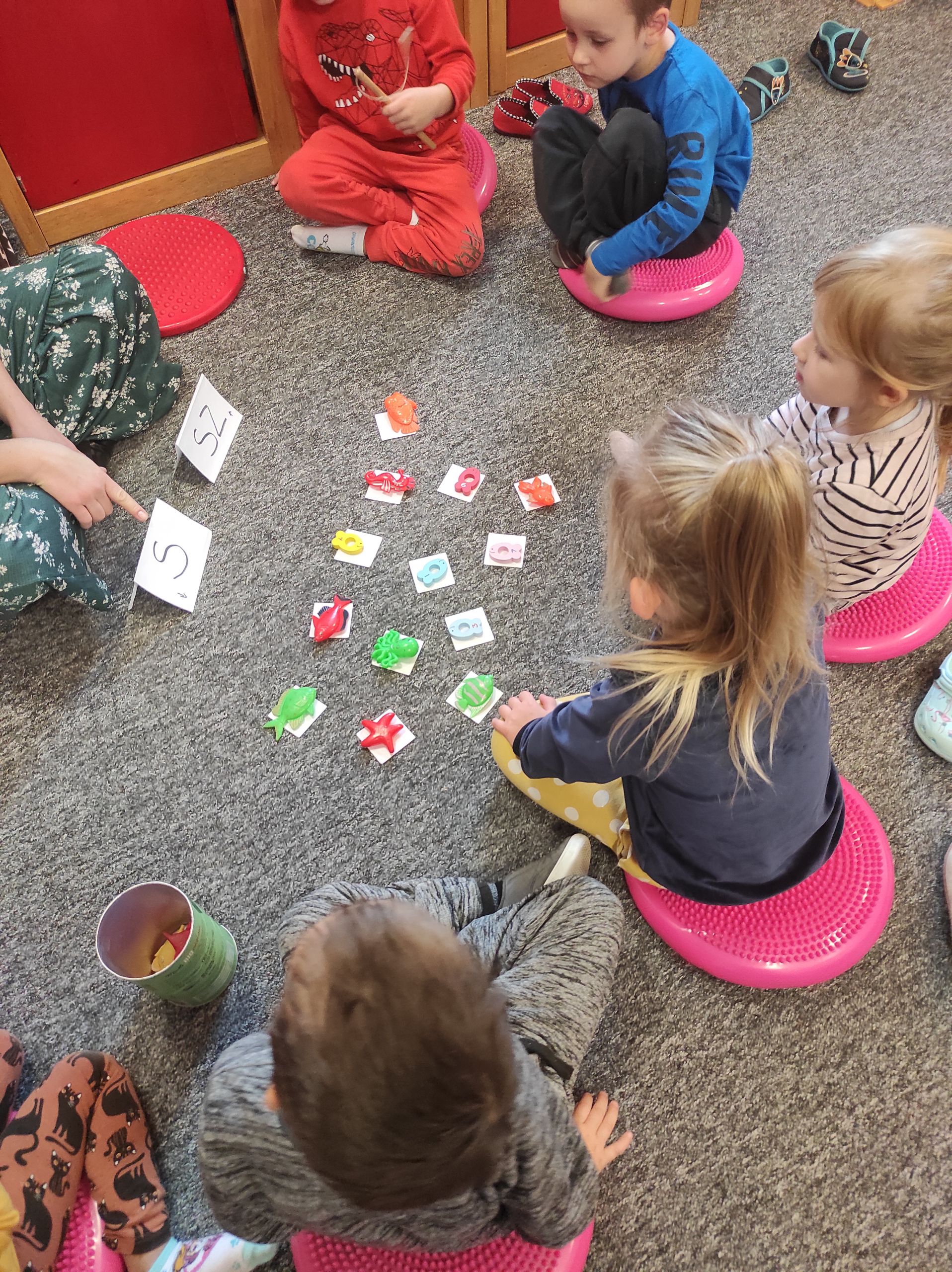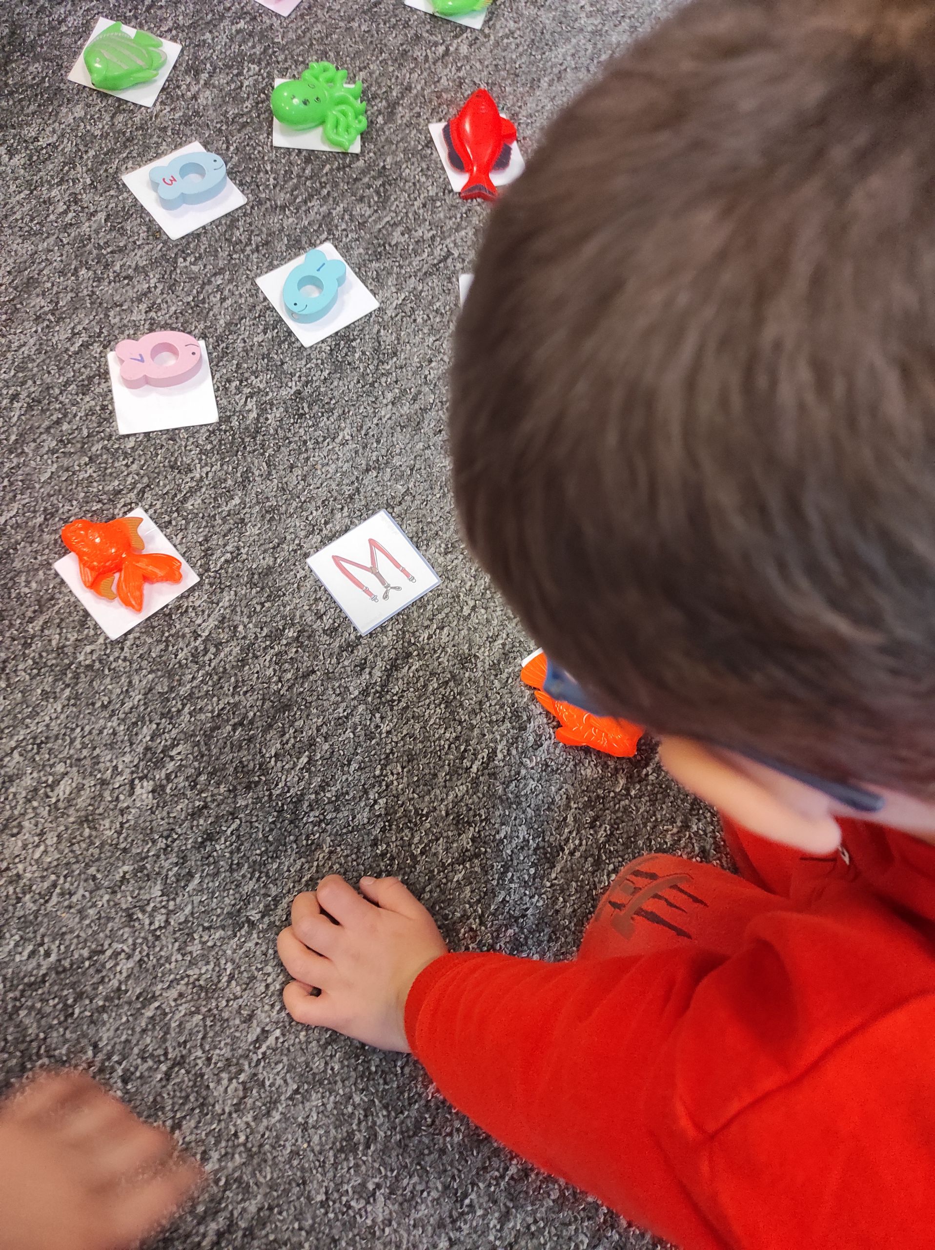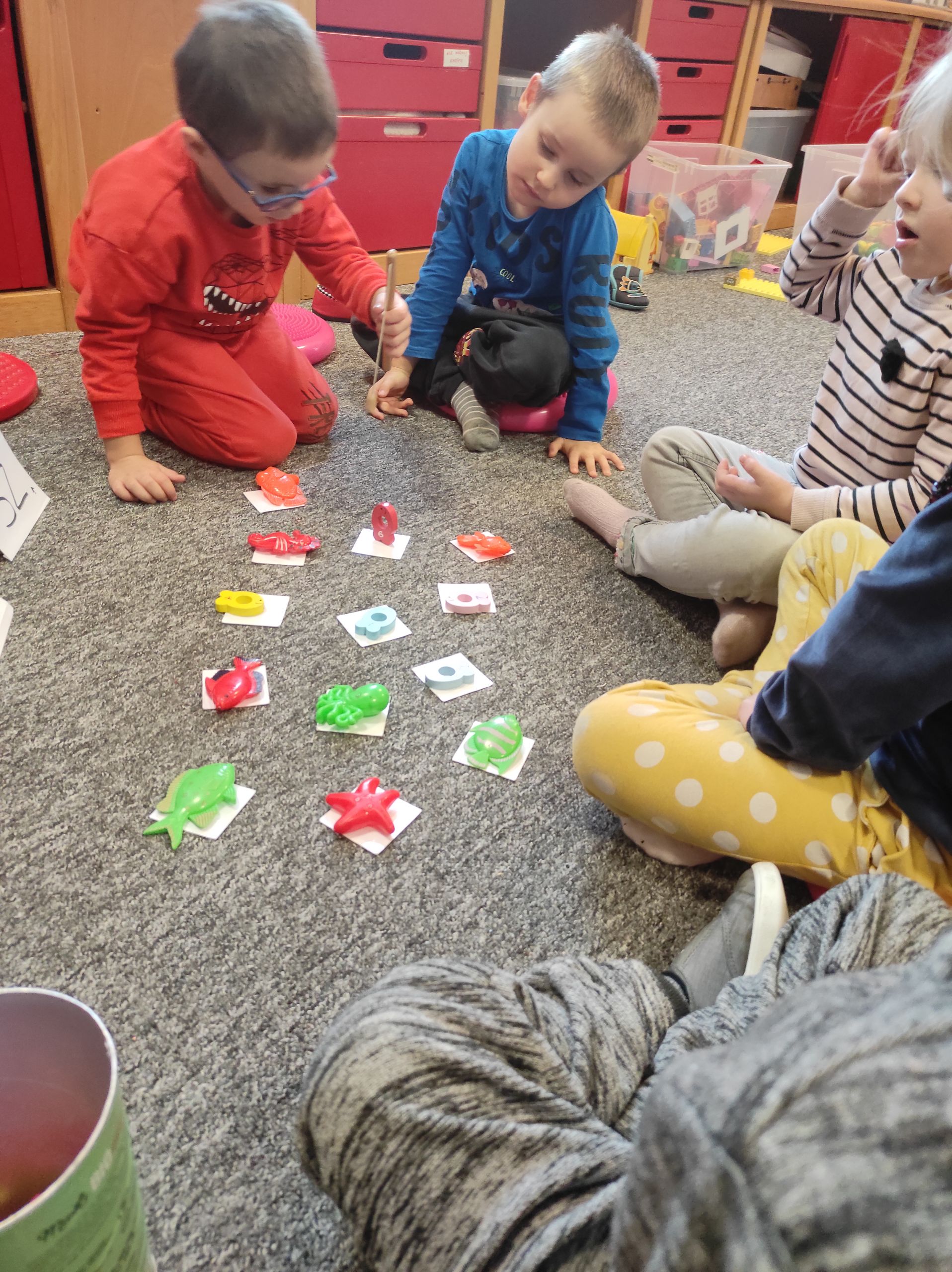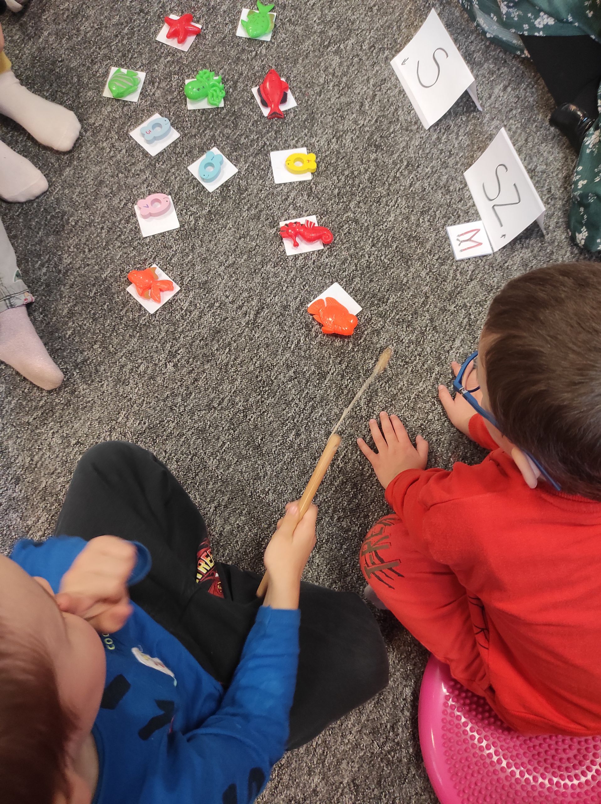 - Grupa dzieci siedzi na wykładzinie, przed nimi leżą kartki zasłonięte przez zabawkowe rybki. Jeden z chłopców łopwi rybkę na drewnianą wędkę.