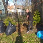 - Mężczyzna trzyma w dłoniach grabie i grabi liście w ogródku. Obok stoją czarne worki wypełnione liśćmi oraz skoszoną trawą.