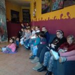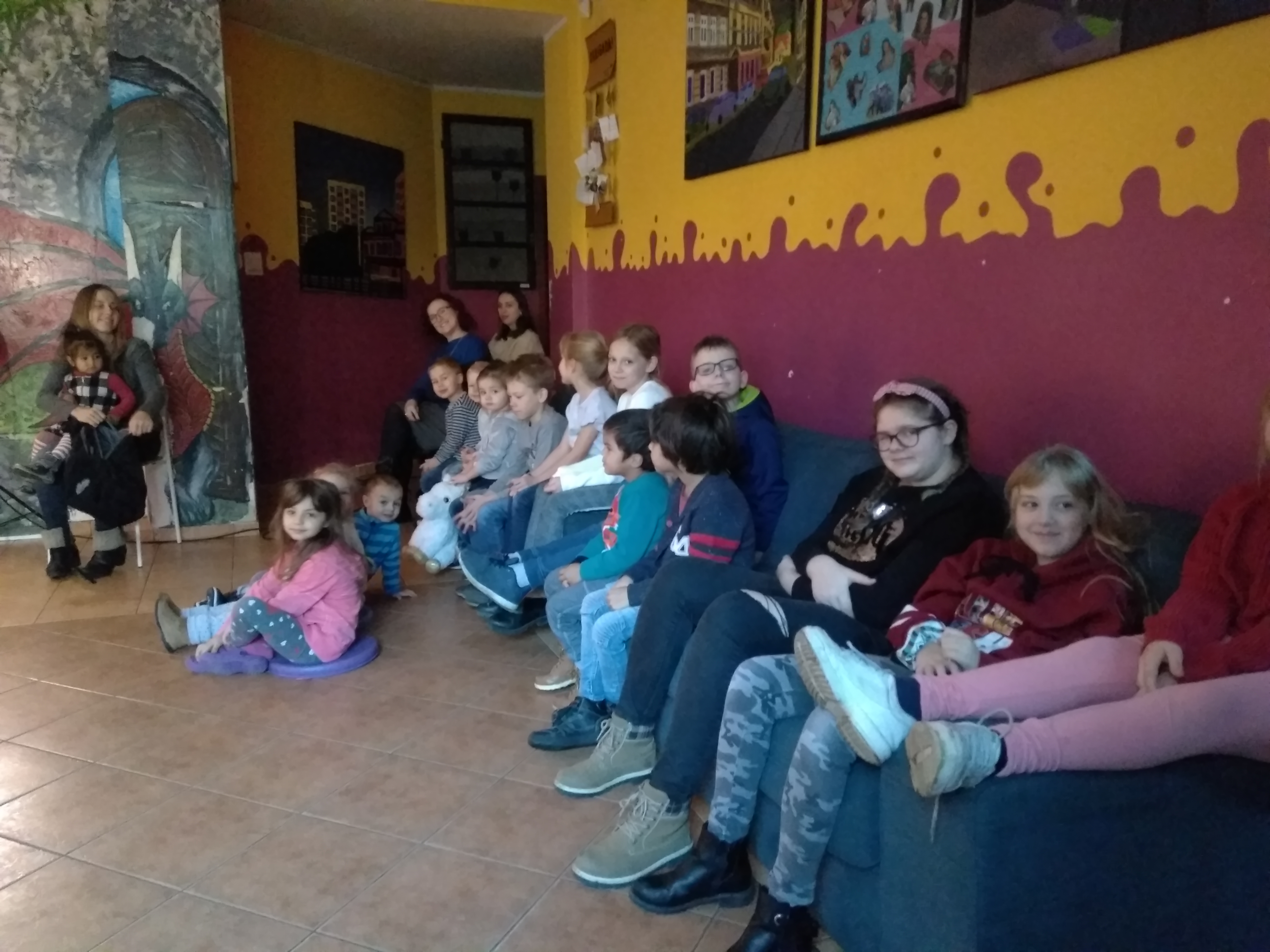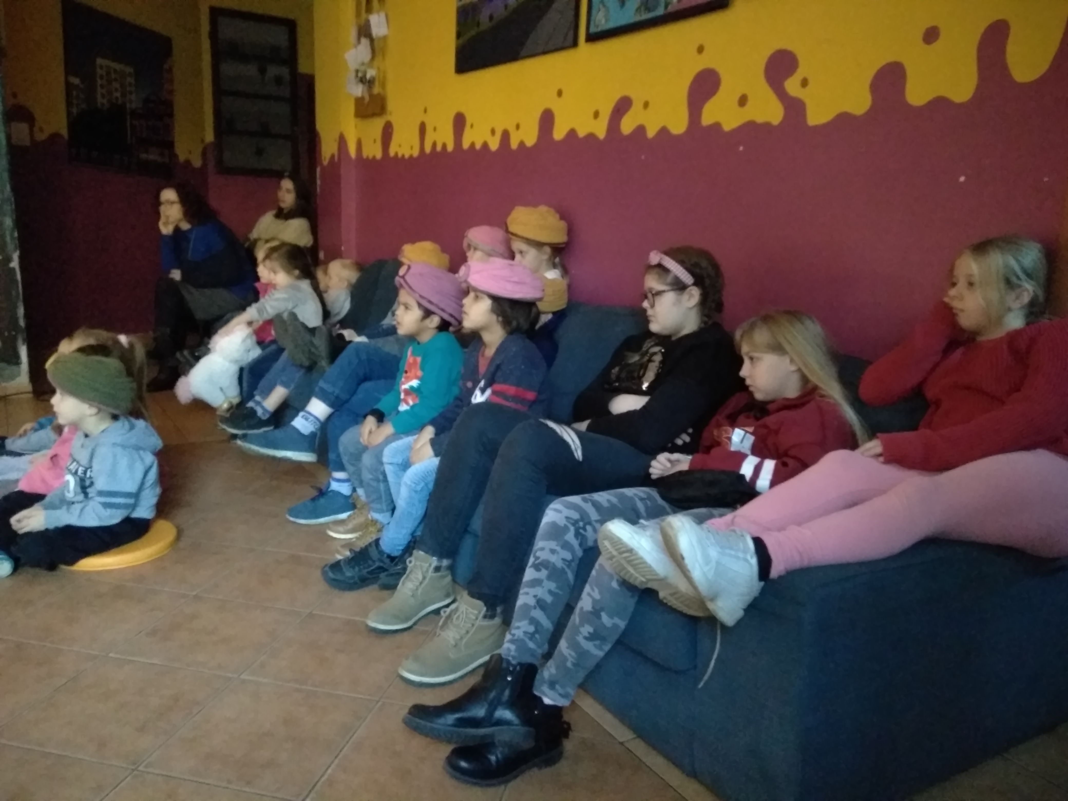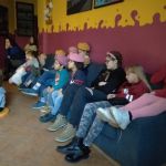 - Grupa dzieci i wychowawców siedzi na kanapach w oczekiwaniu na przedstawienie.