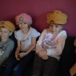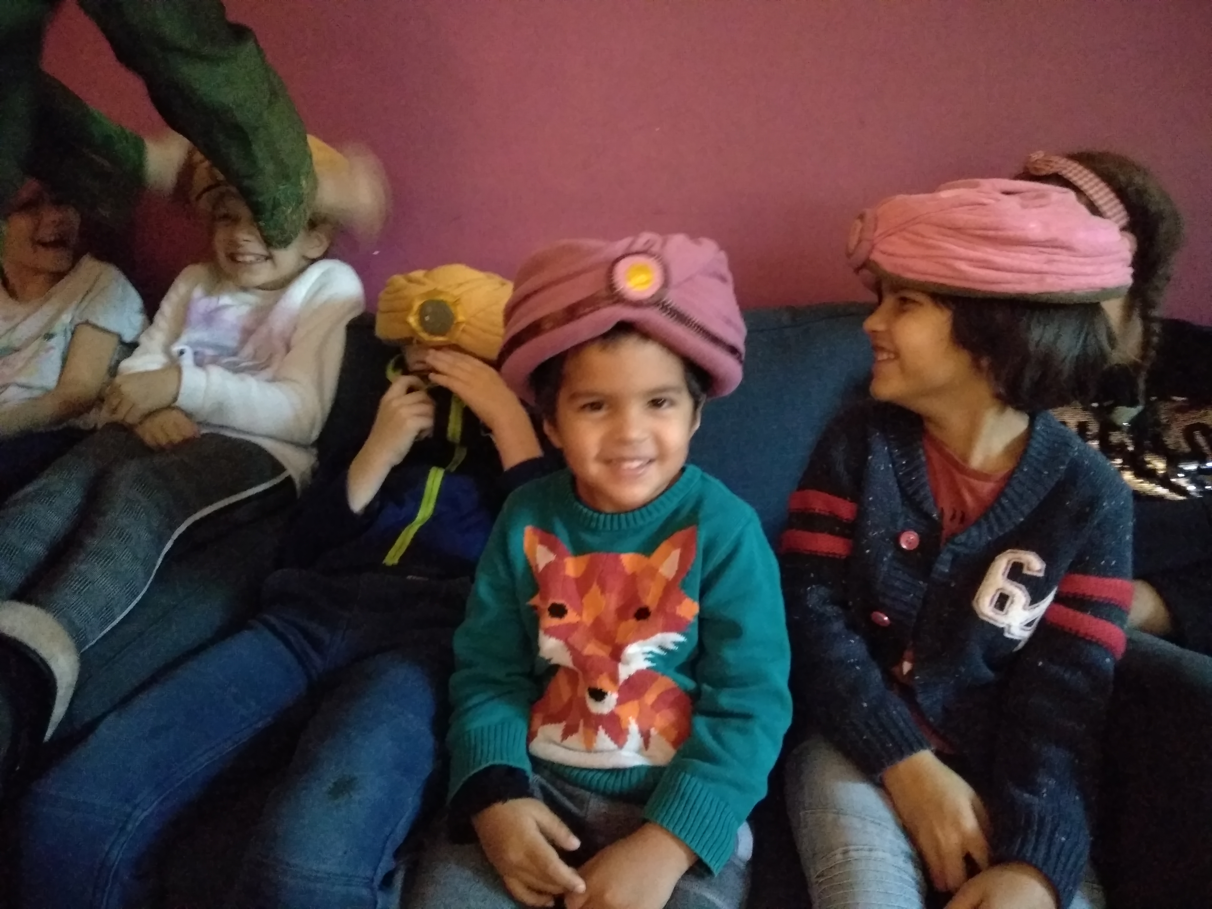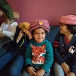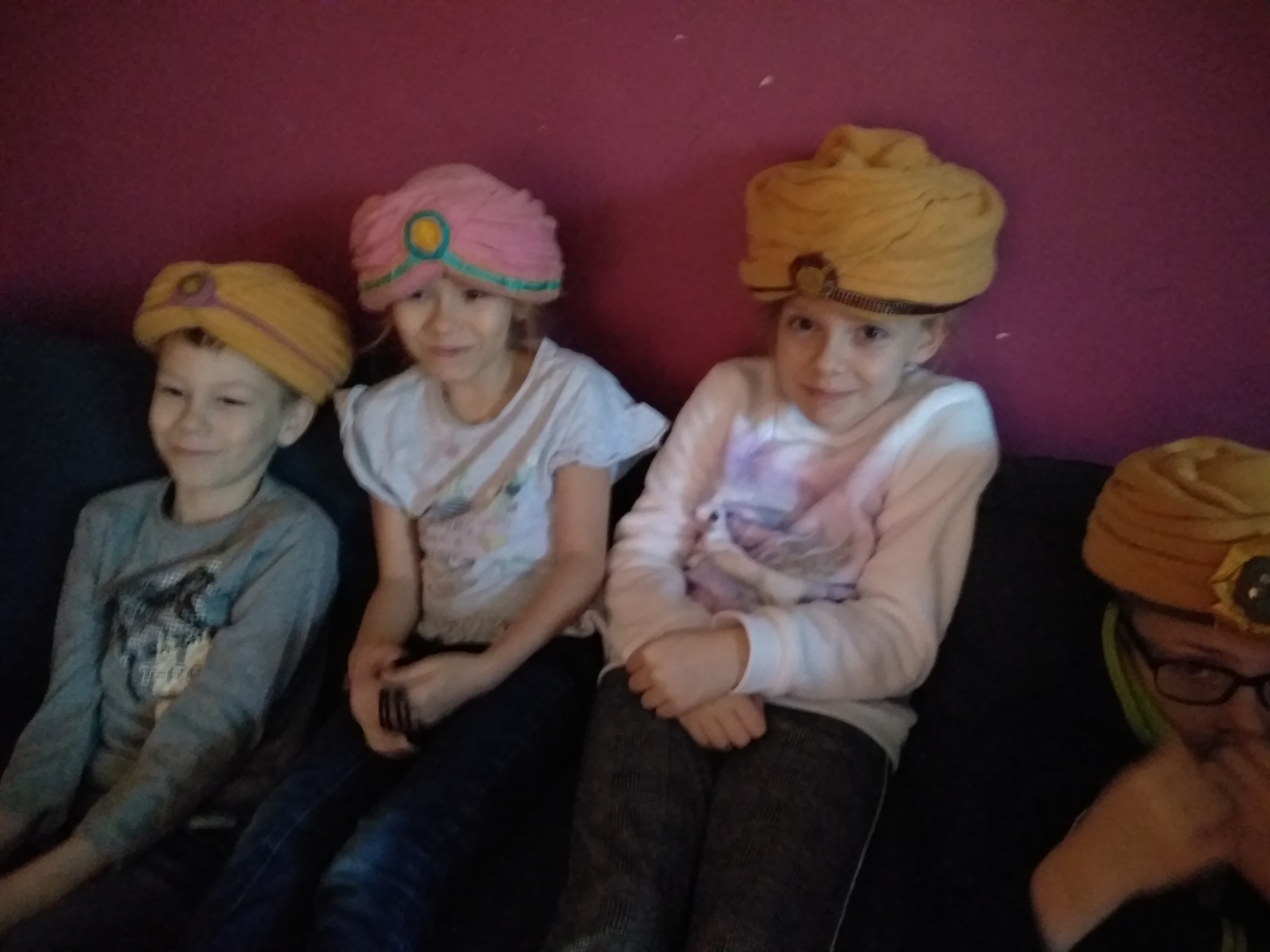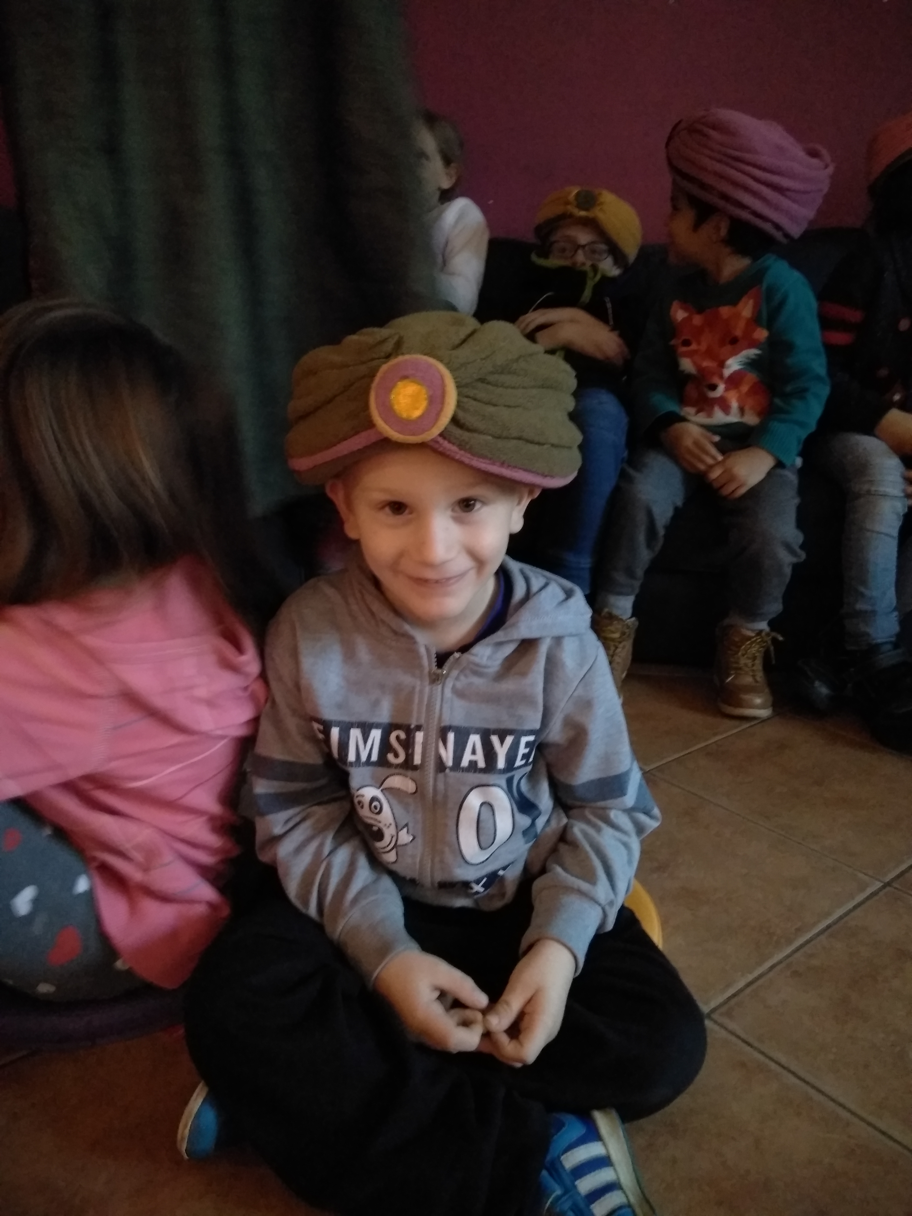 - Uśmiechnięty chłopiec z turbanem na głowie.