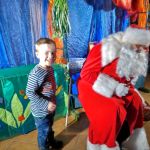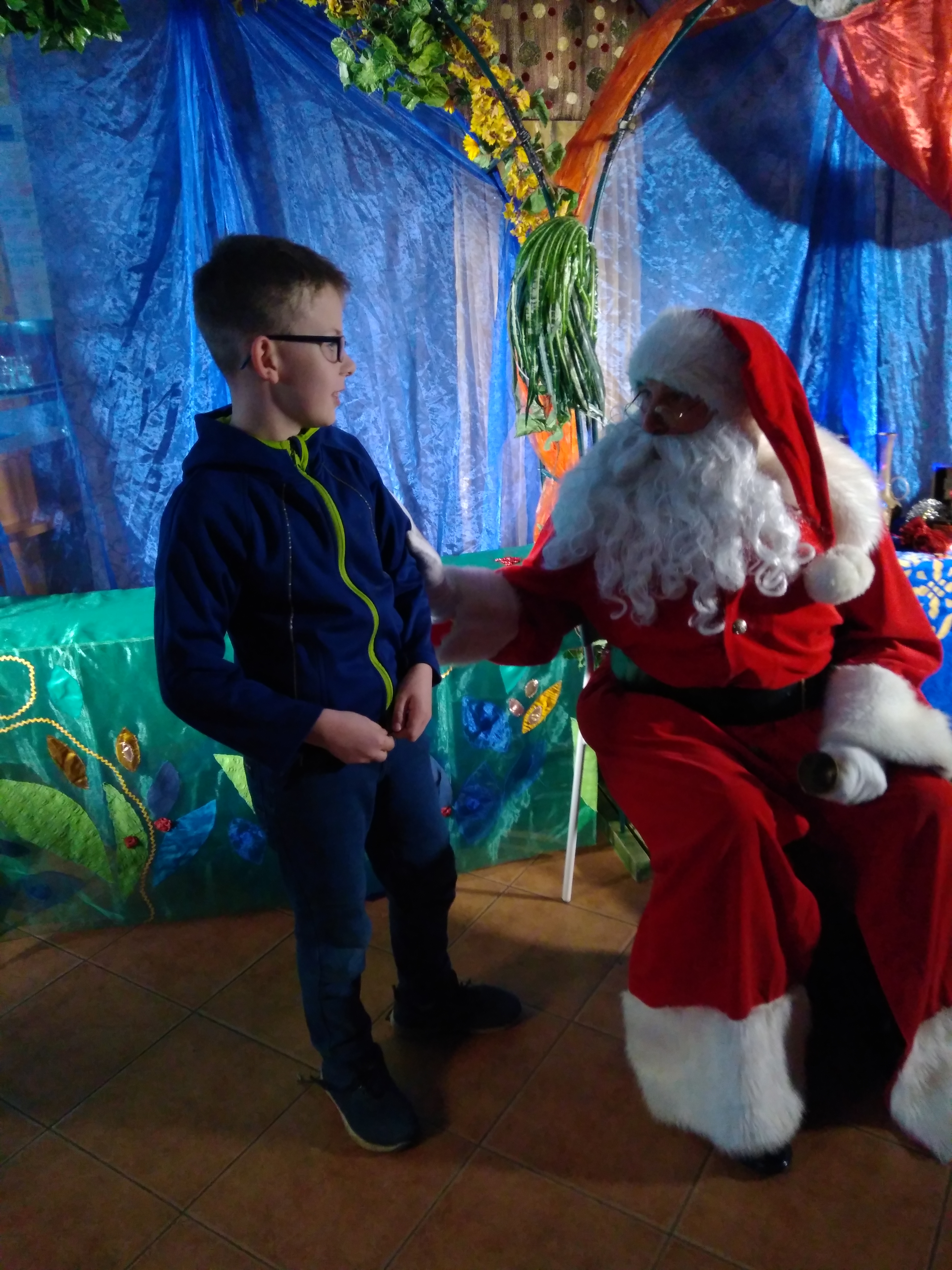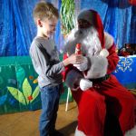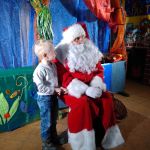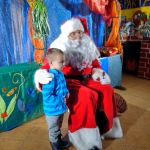 - Mikołaj siedzący na krześle jedną ręką obejmuje stojącego obok chłopca.