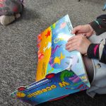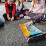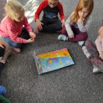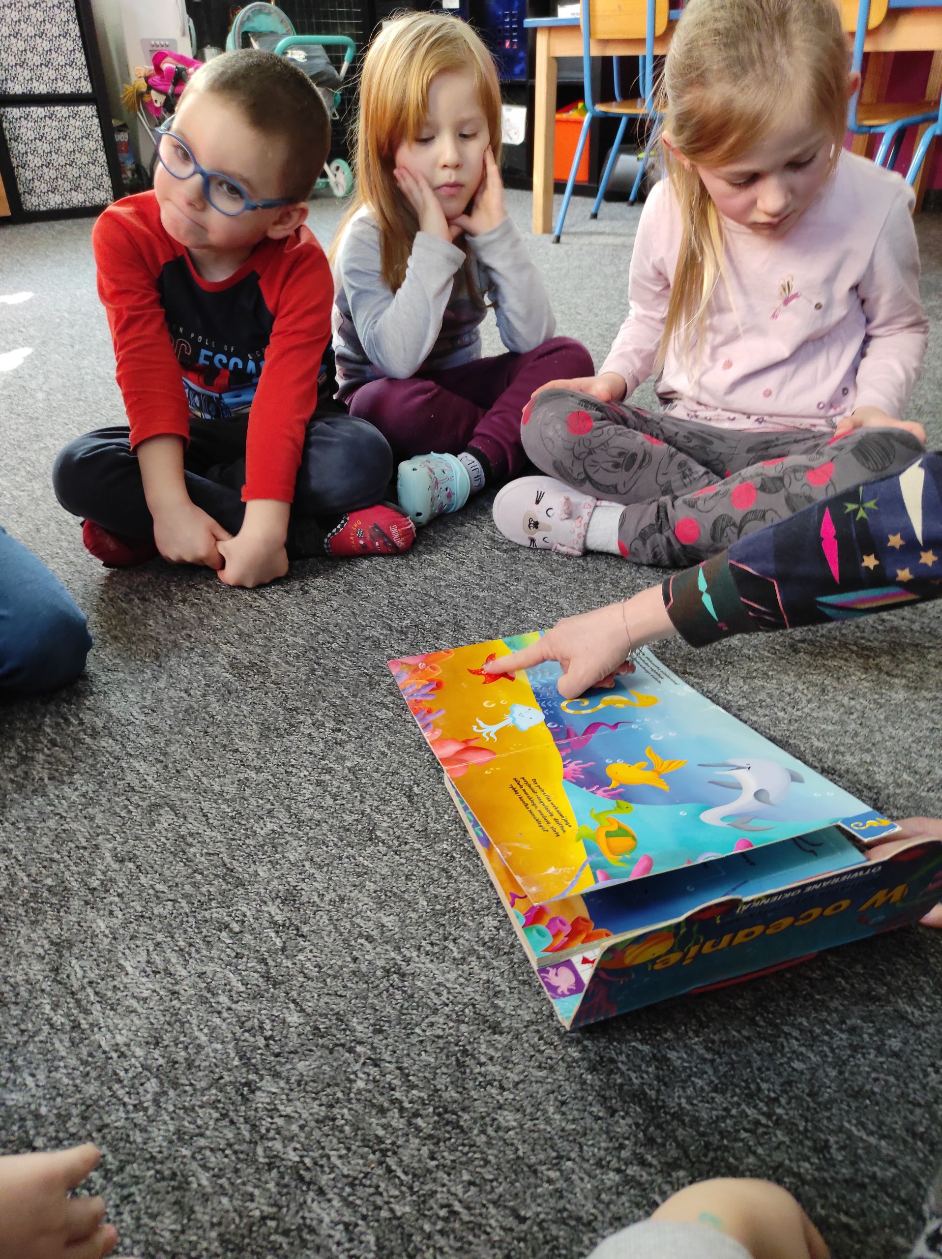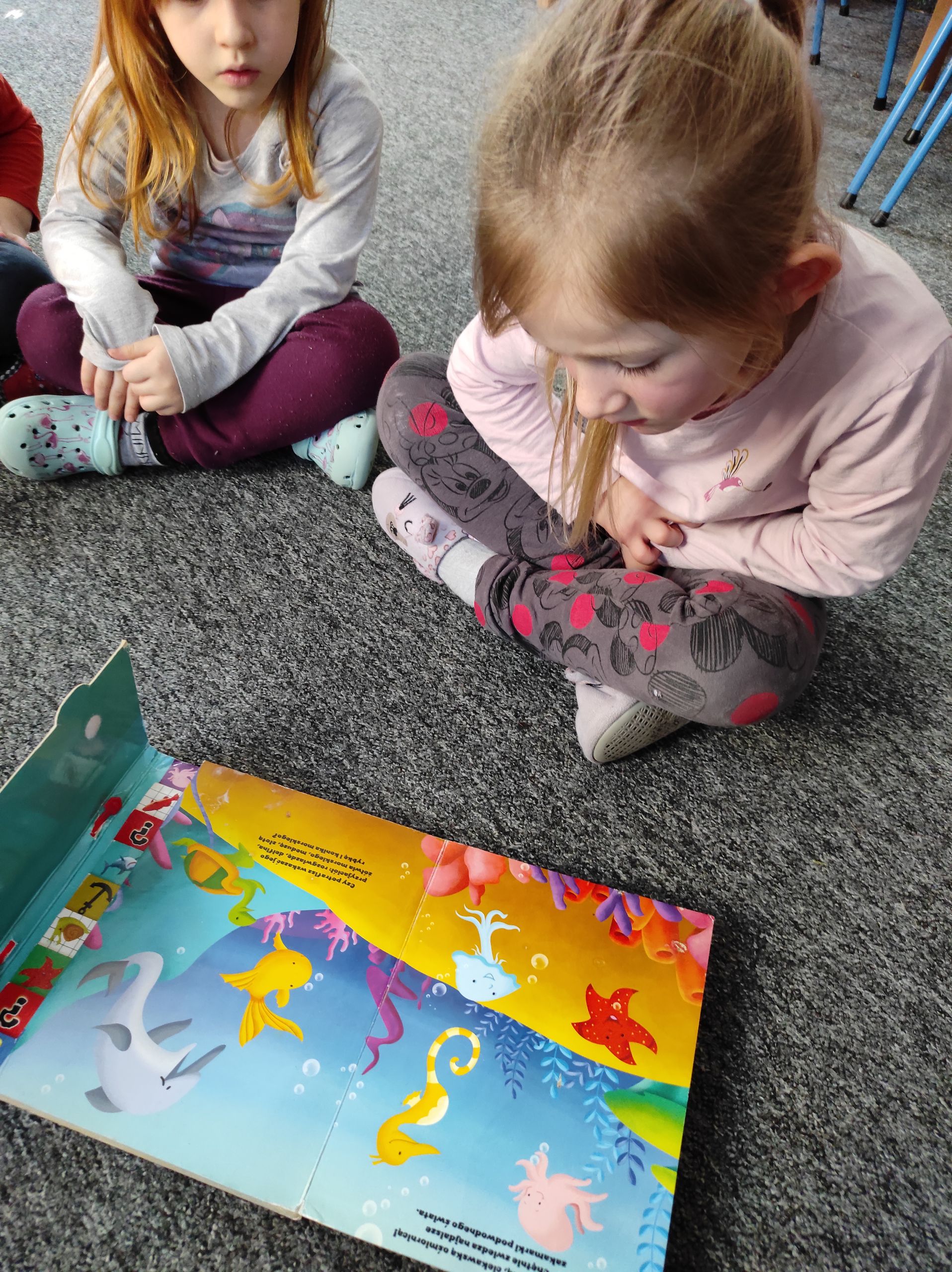 - Dzieci siedzą po turecku na wykładzinie i pracują z kolorową książeczką przedstawiającą życie w morzu.