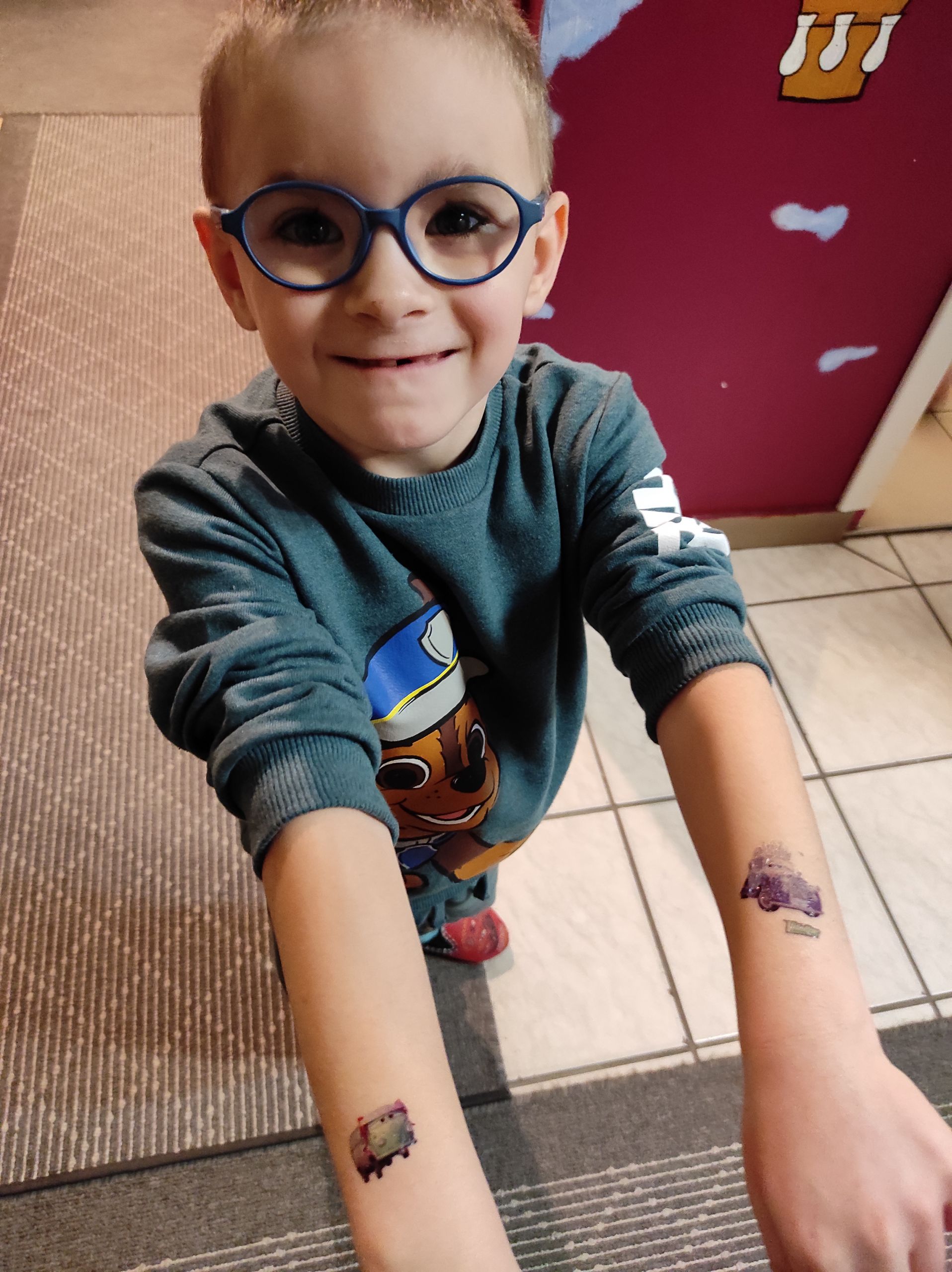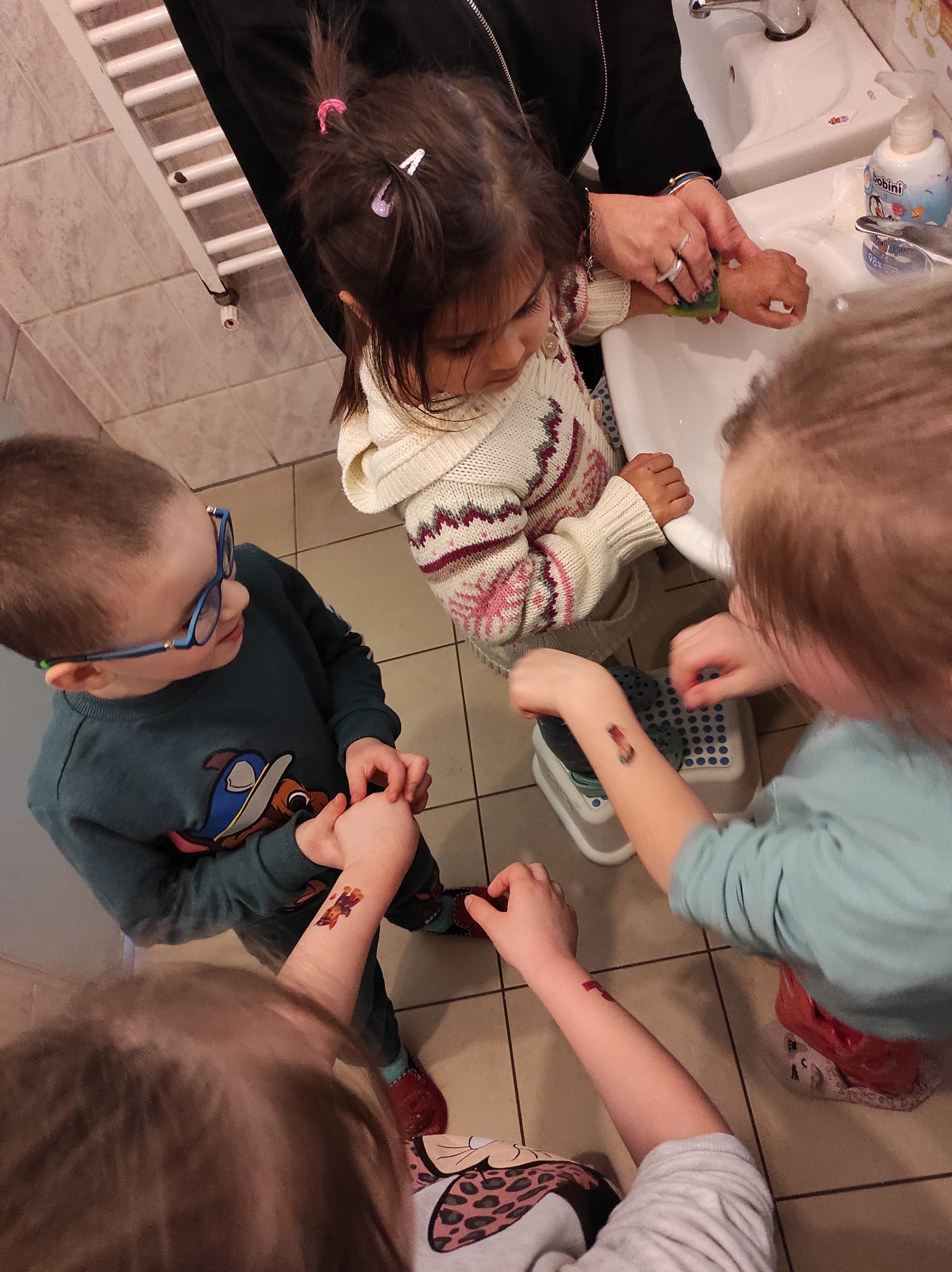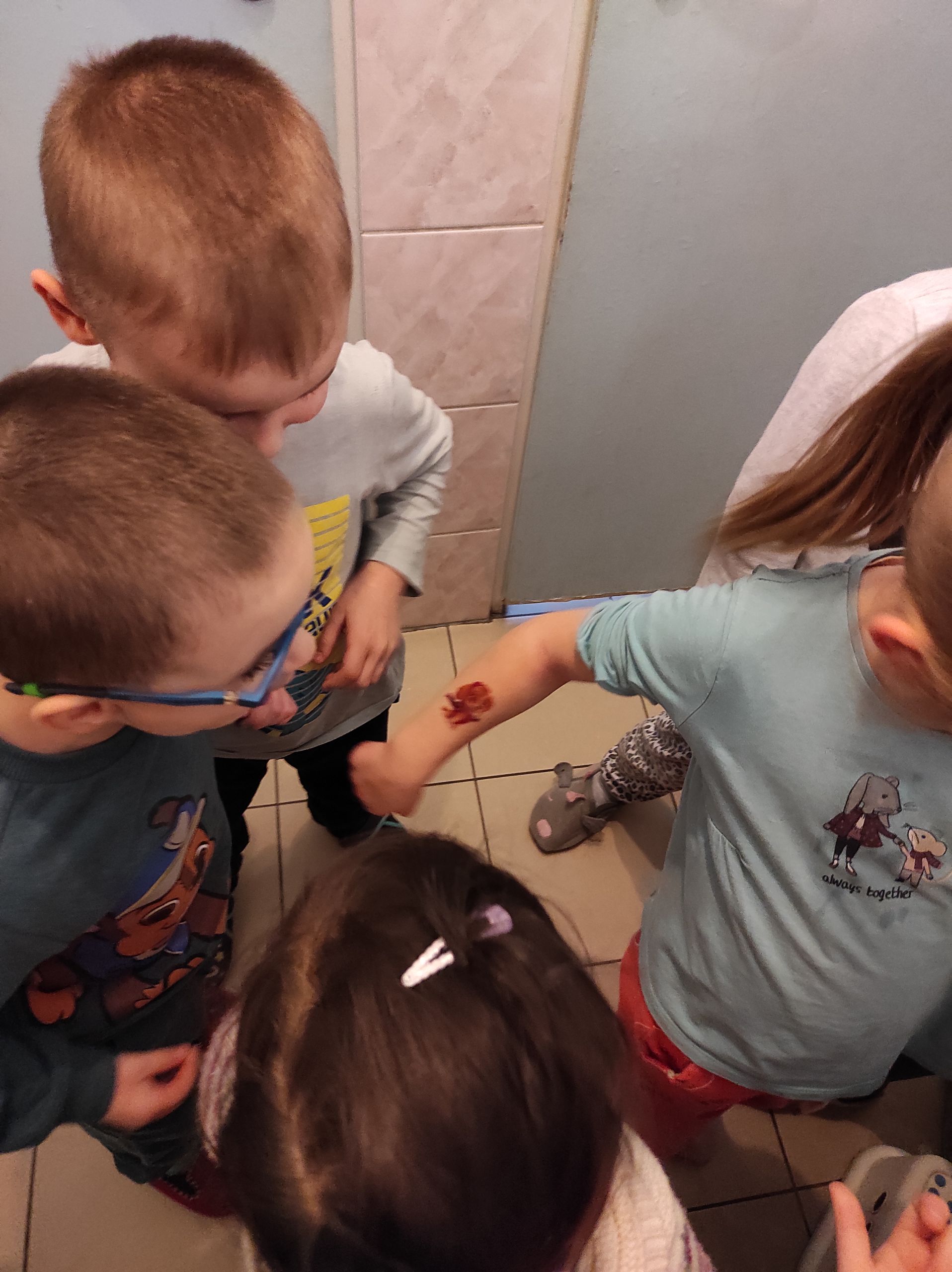 22.03.2022r. „Radosne Krasnale” zostały zaskoczone przez swoje wychowawczynie kolorowymi tatuażami! Radość i fascynacja maluchów przerosła nasze najśmielsze oczekiwania. Każdy z Krasnali mógł wybrać sobie dwa zmywalne tatuaże, które najbardziej mu się podobały. Takie niespodzianki to my lubimy, a nasze dzieciaki najwyraźniej jeszcze bardziej 🙂