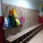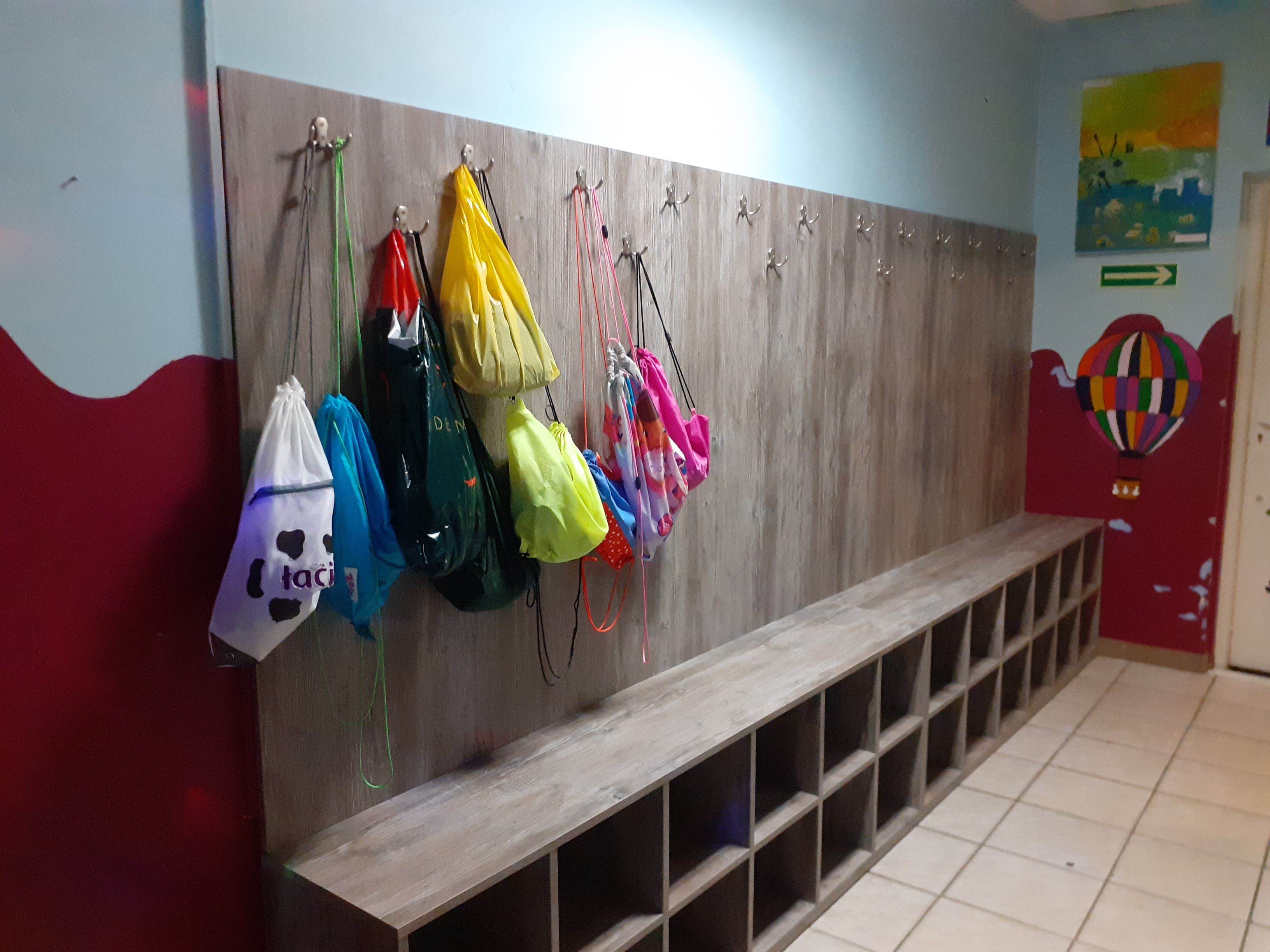 - Nowe szafki w szatni w Centrum Frassati. Na wieszakach wiszą worki dziecięce.
