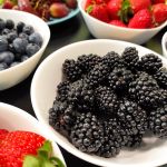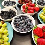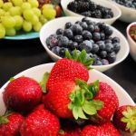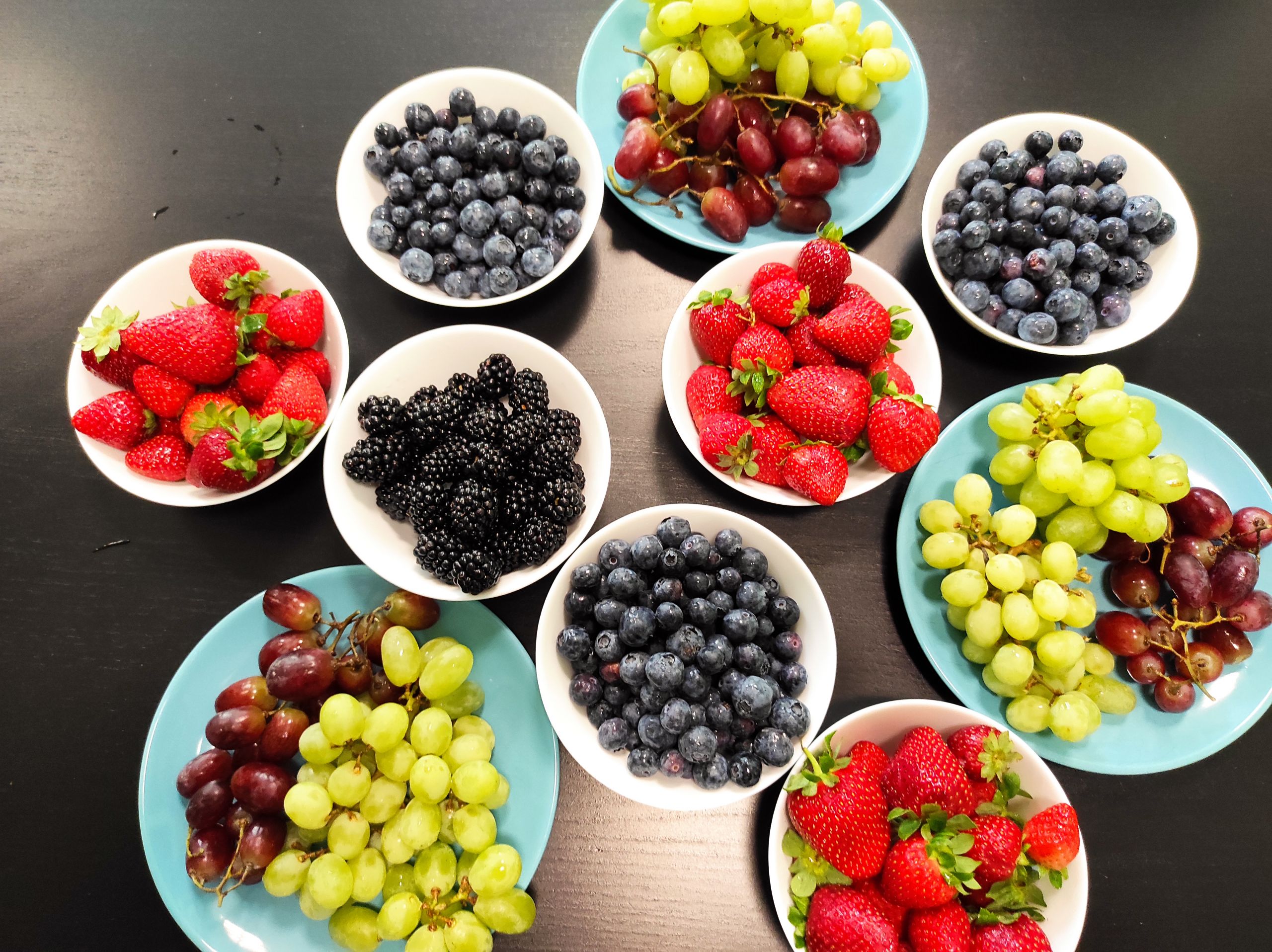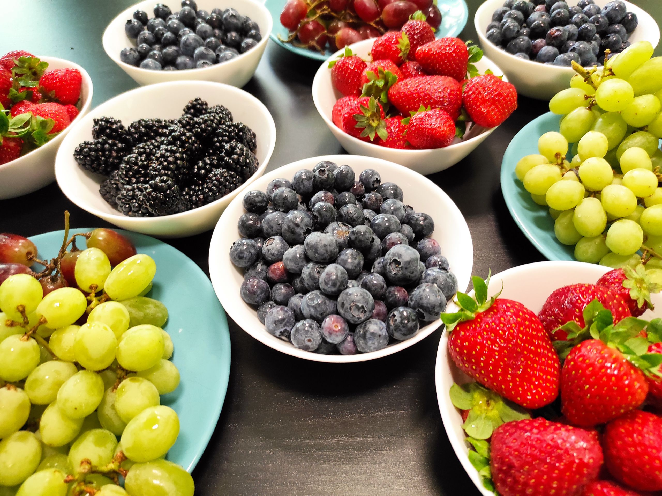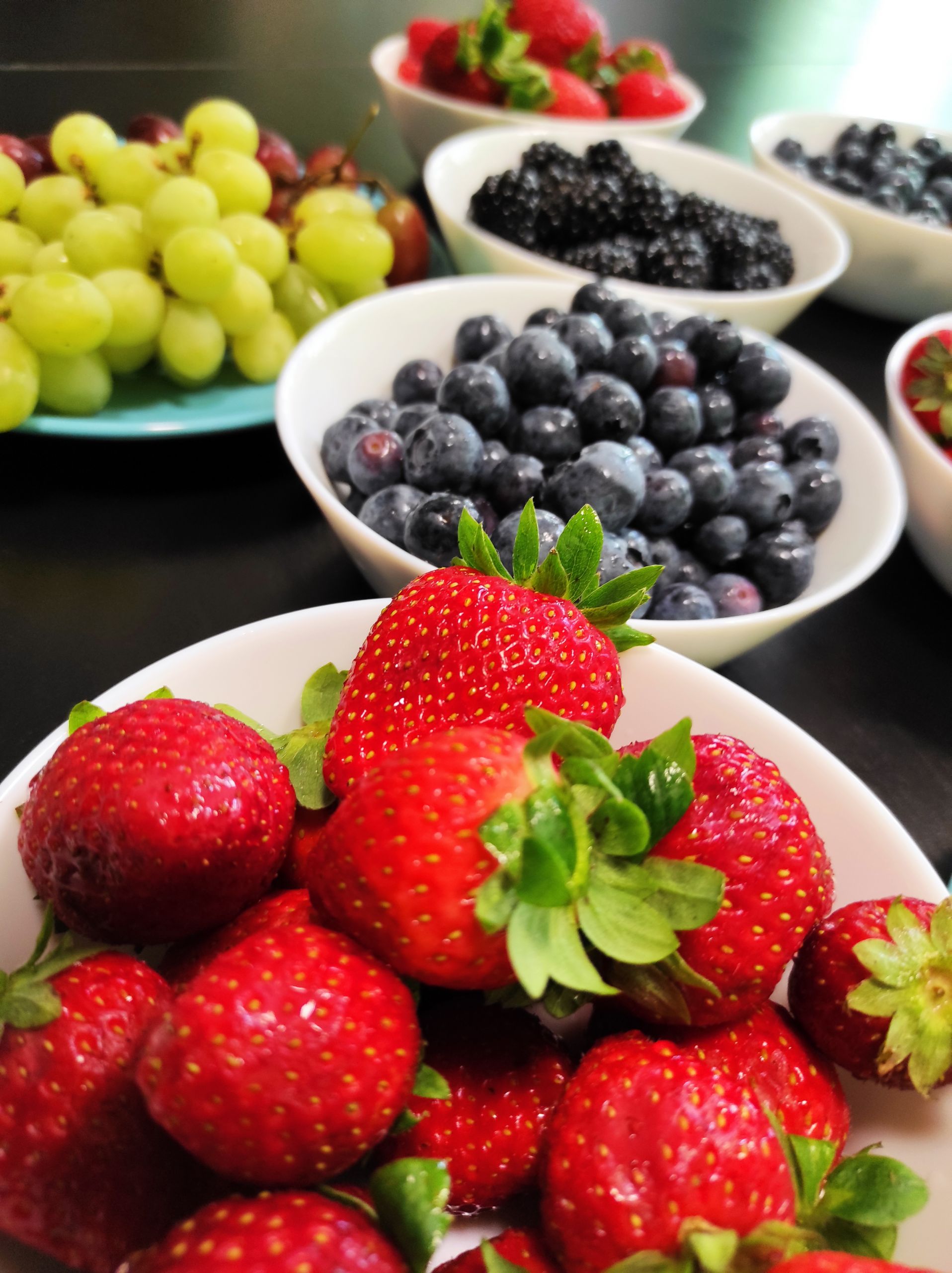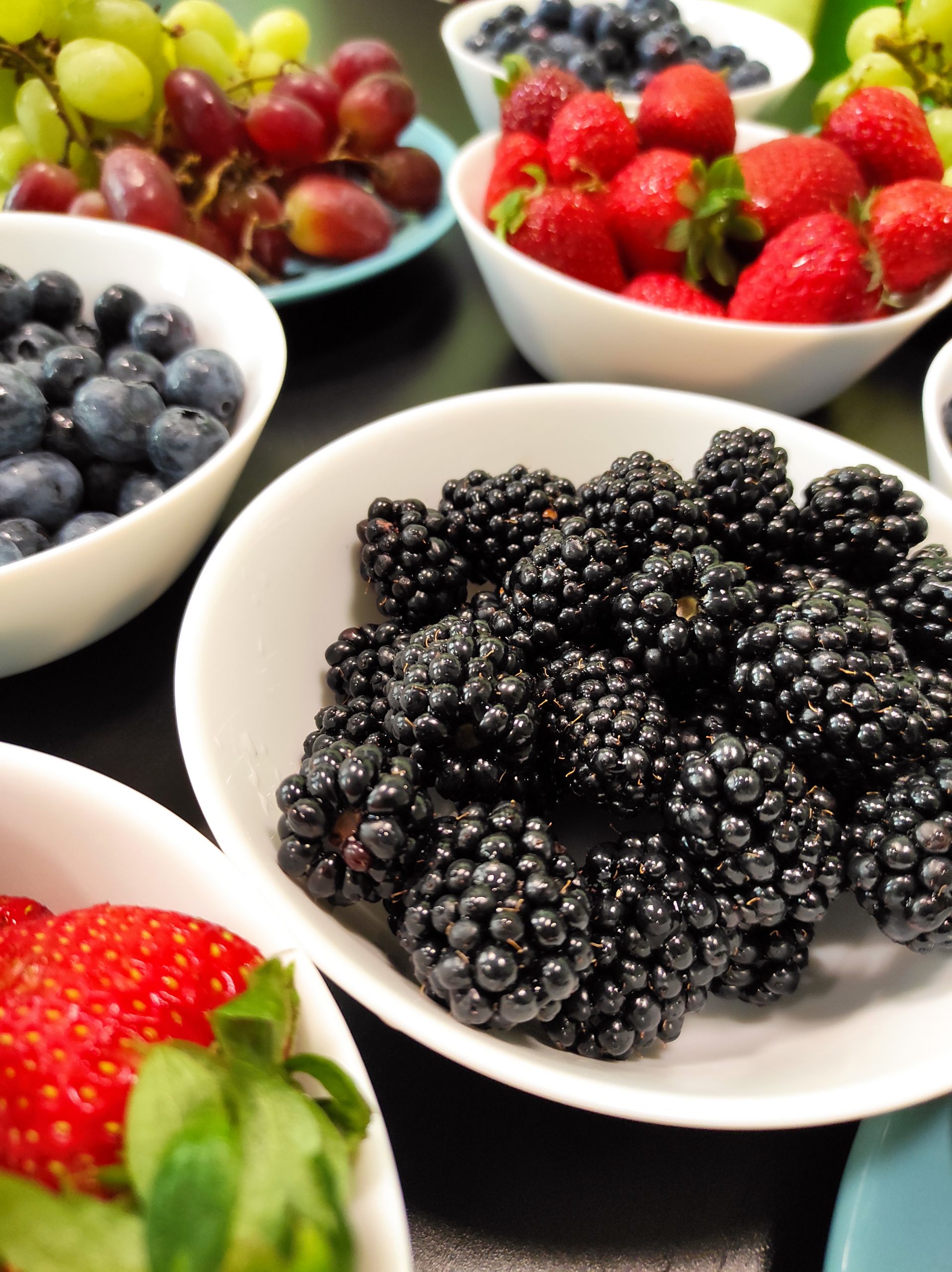- Na stole stoją miski wypełnione owocami – truskawkami, jeżynami, borówkami oraz zielonymi winogronami.