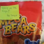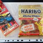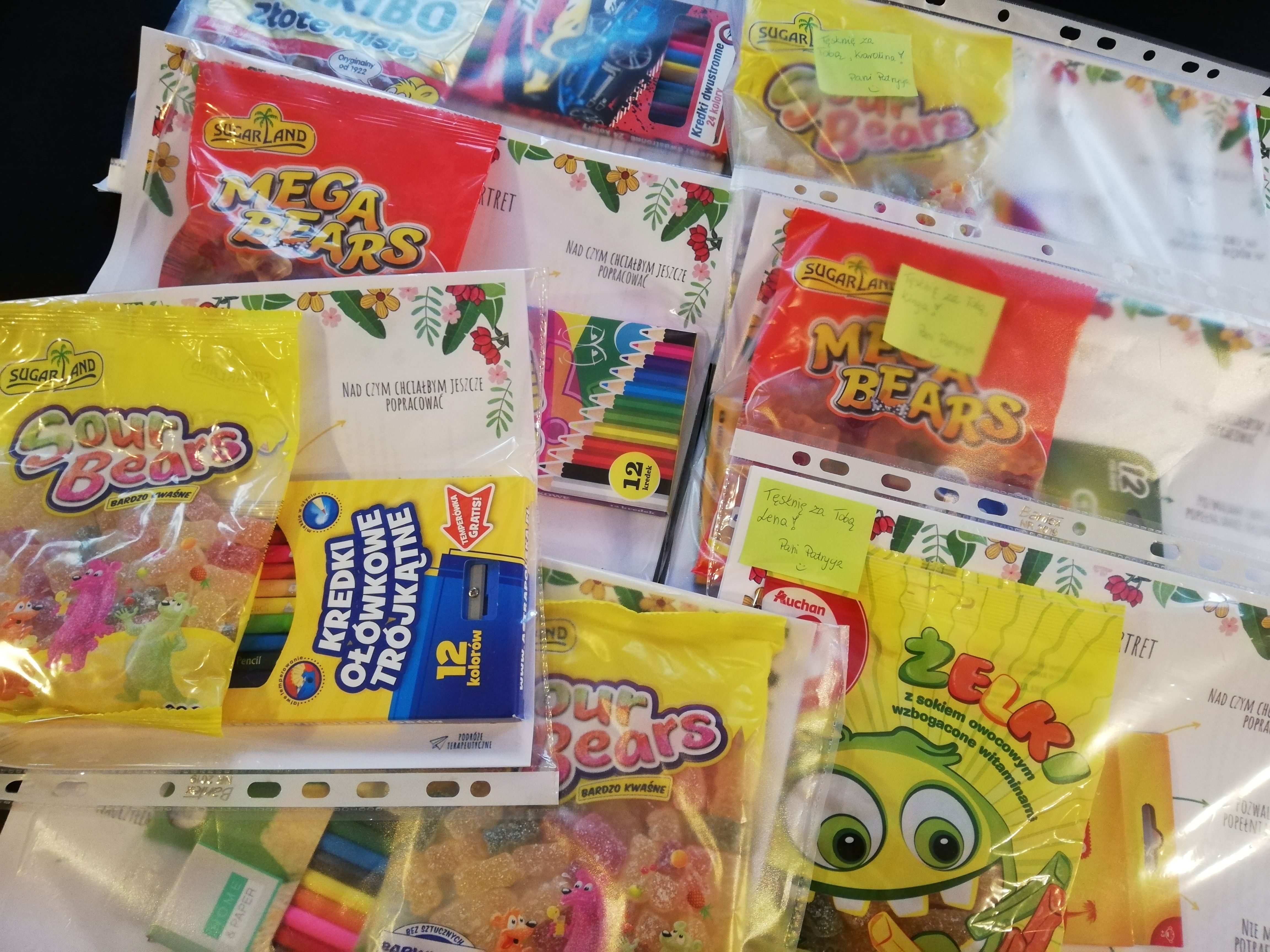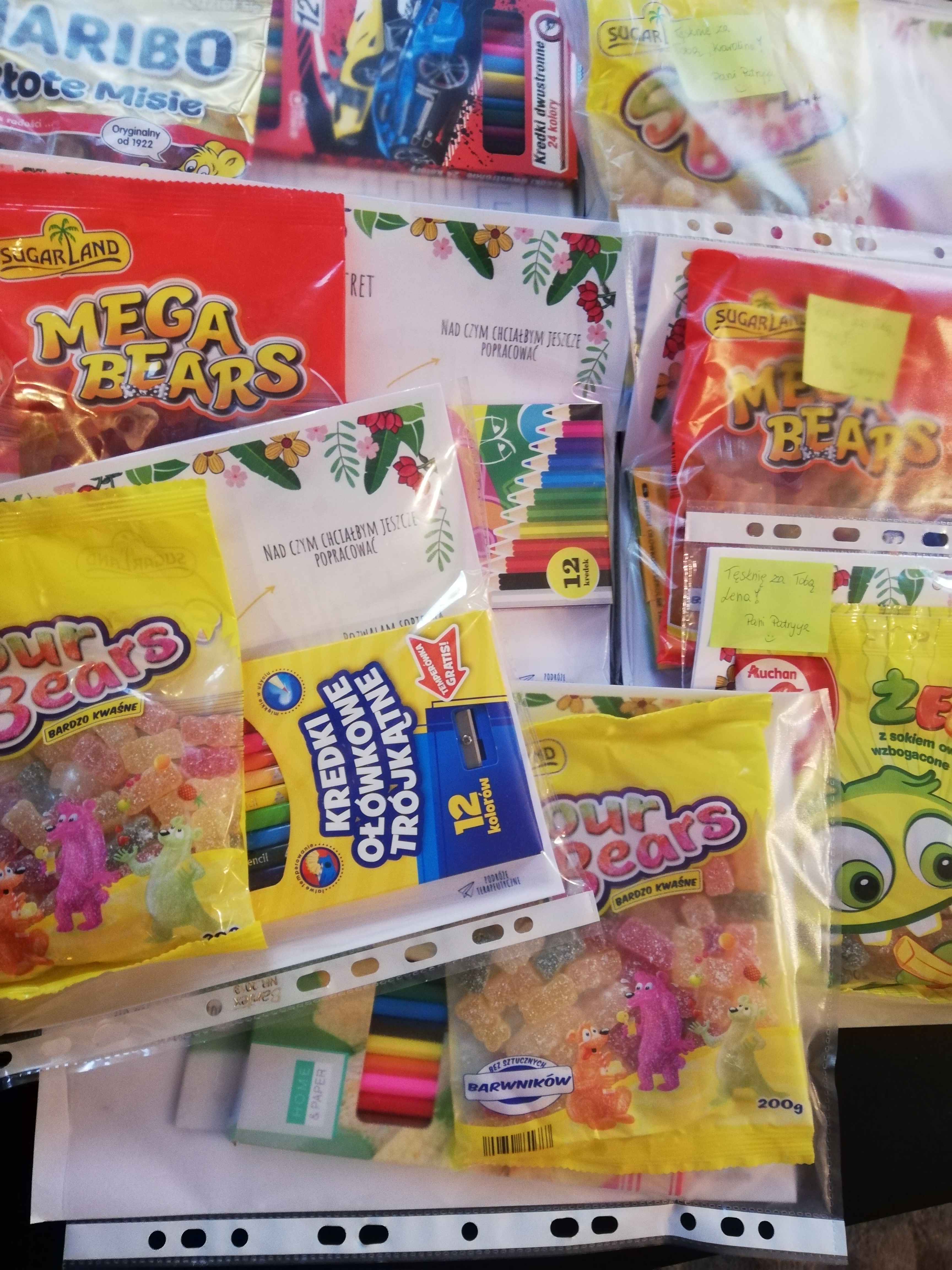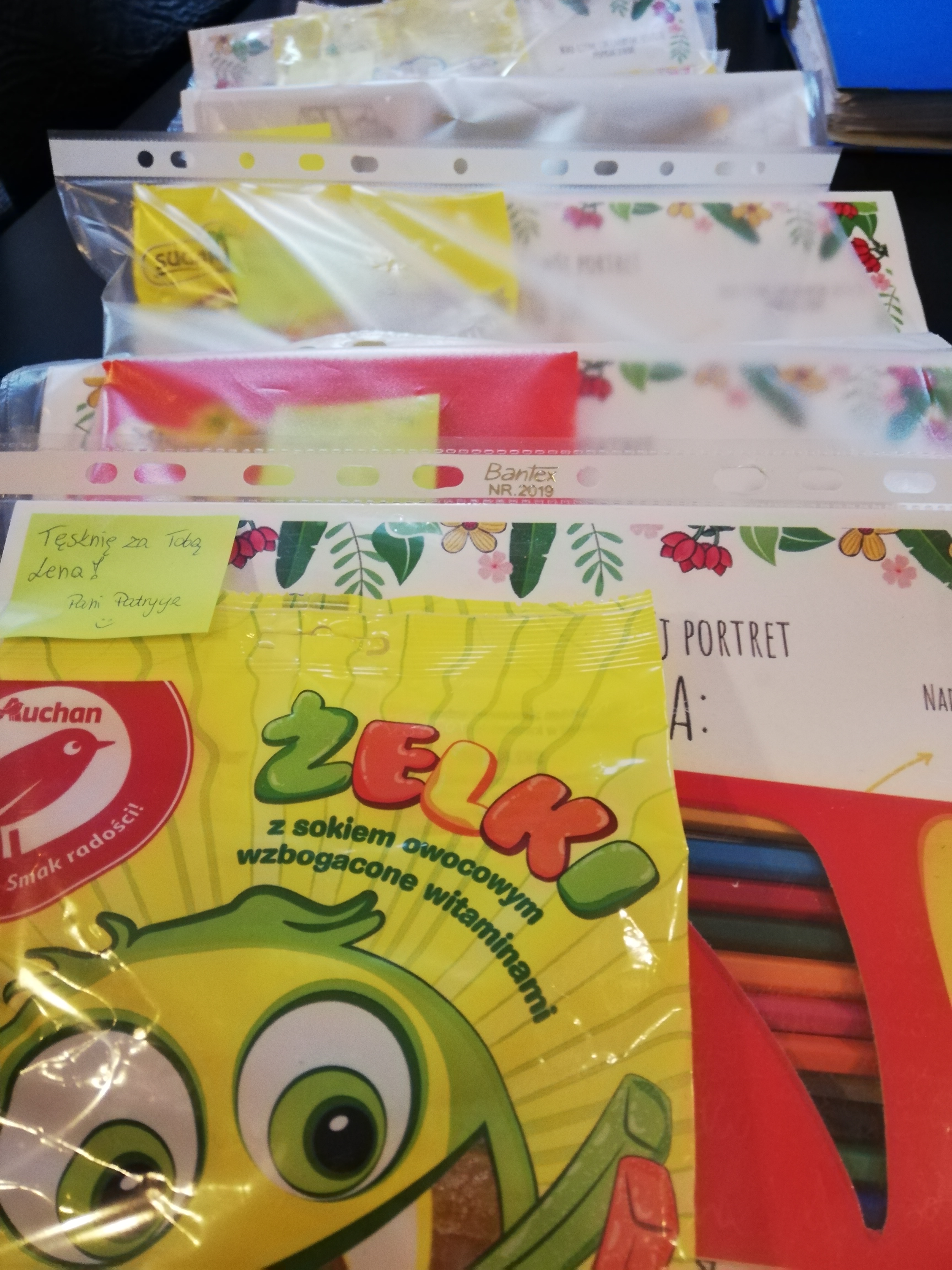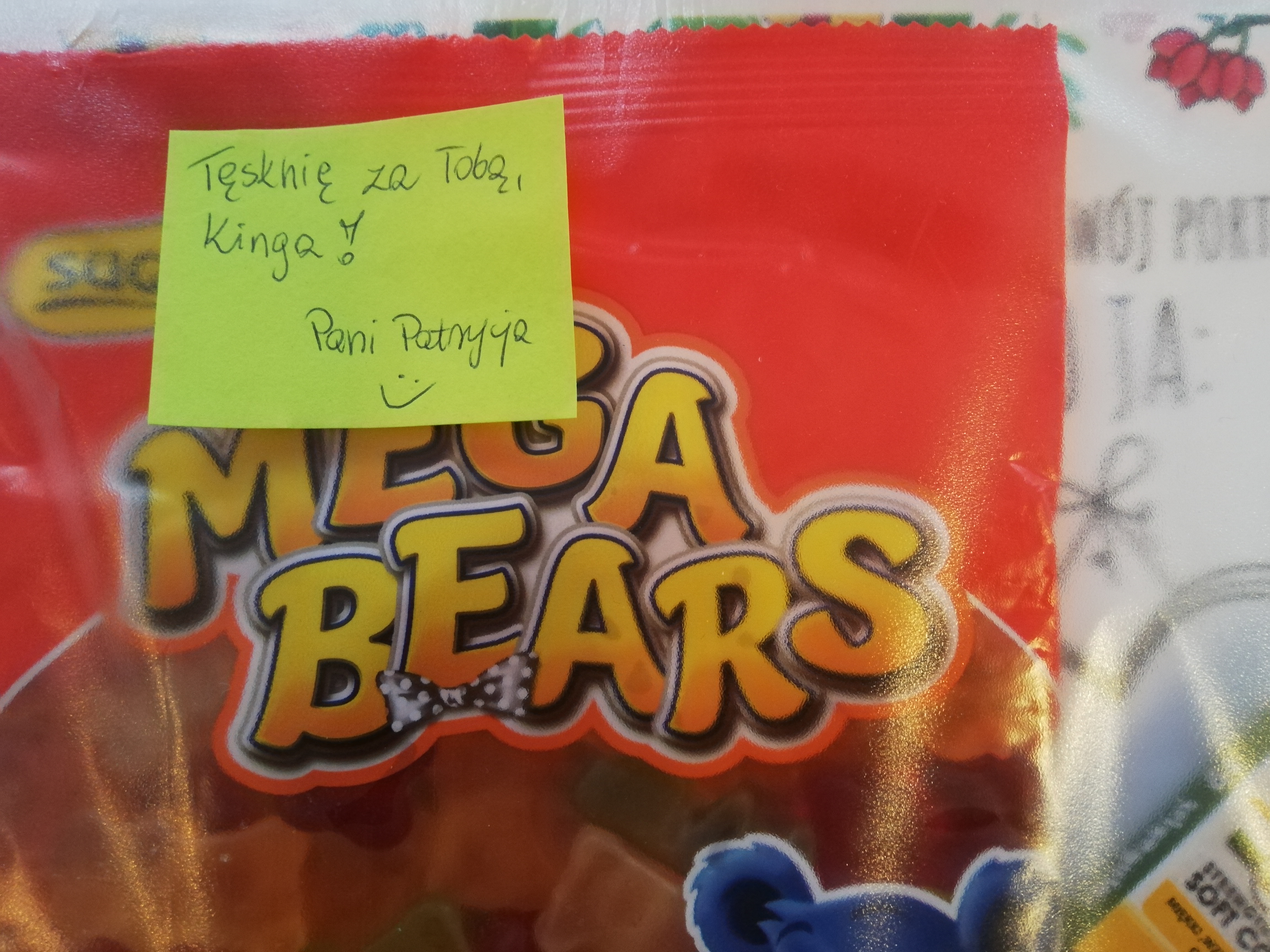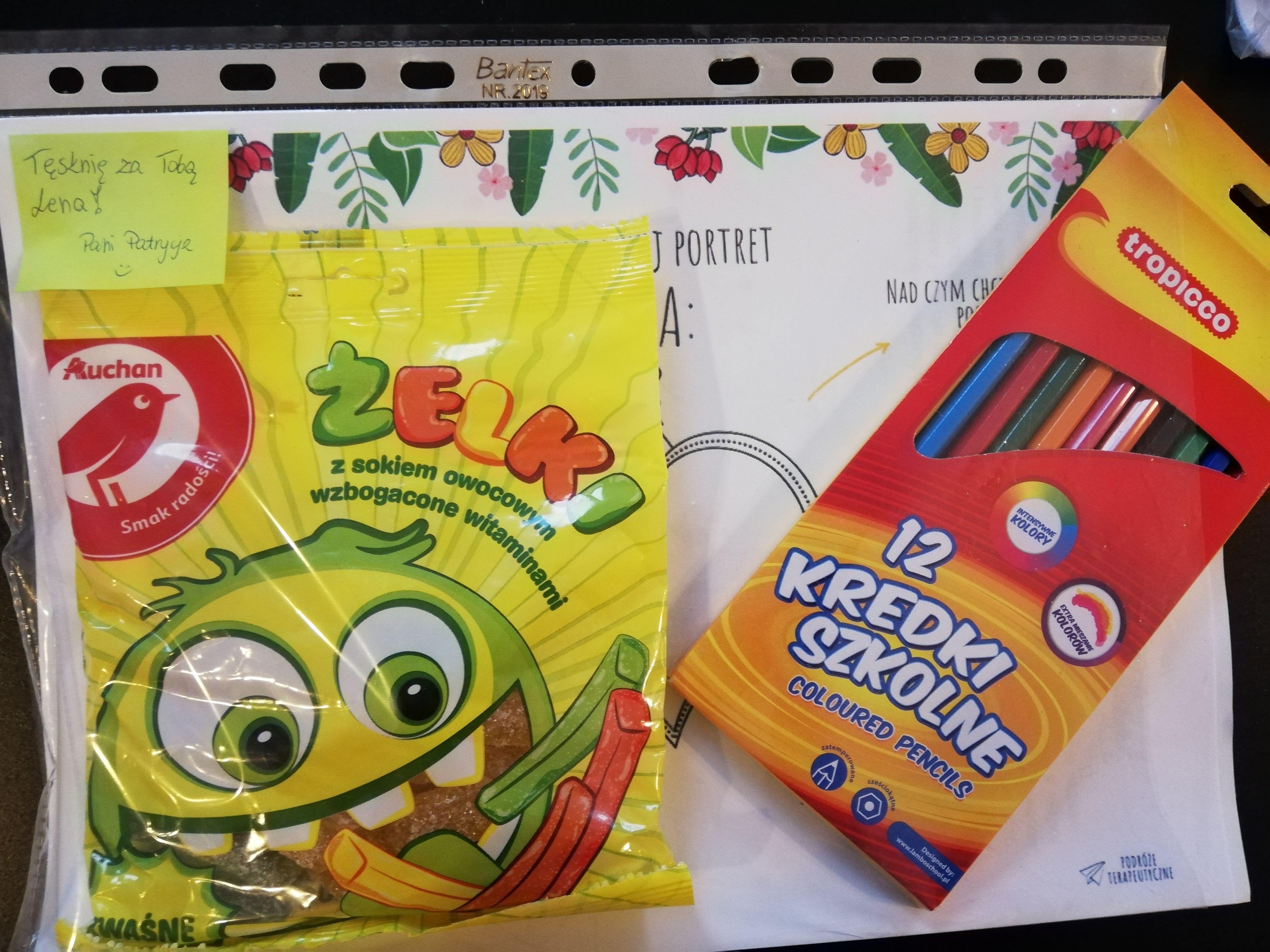 - Karty pracy oraz żelki w koszulce foliowej, z przyklejoną kartką dla dziecka „Tęsknie za Tobą, Kinga! Pani Patrycja”