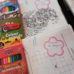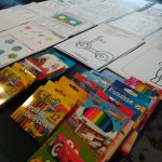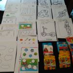 - Na stole leżą kartki z kolorowankami, pracami grafomotorycznymi, obok leżą pudełka z kredkami.