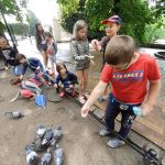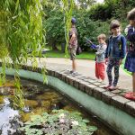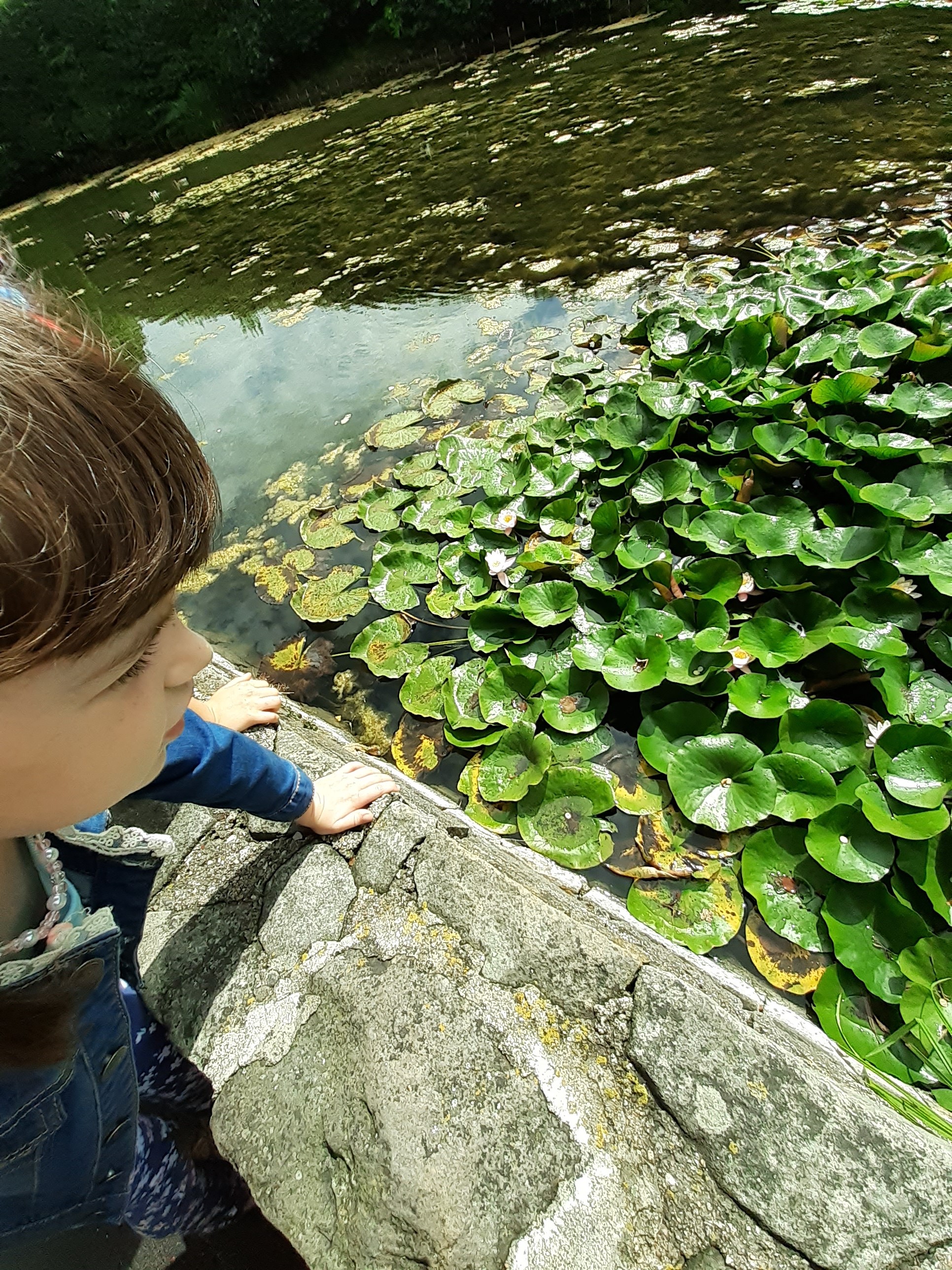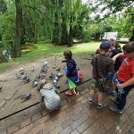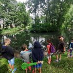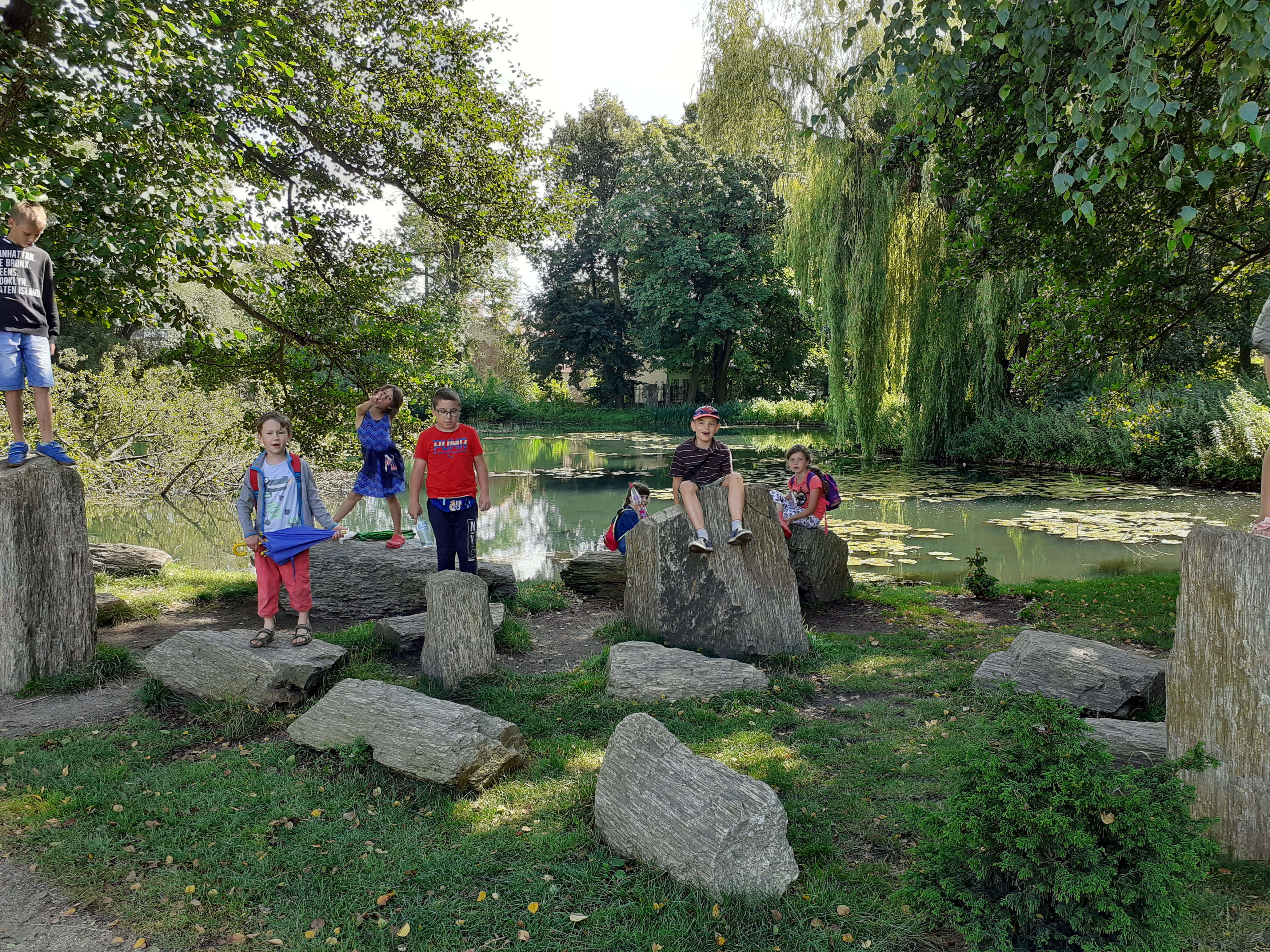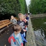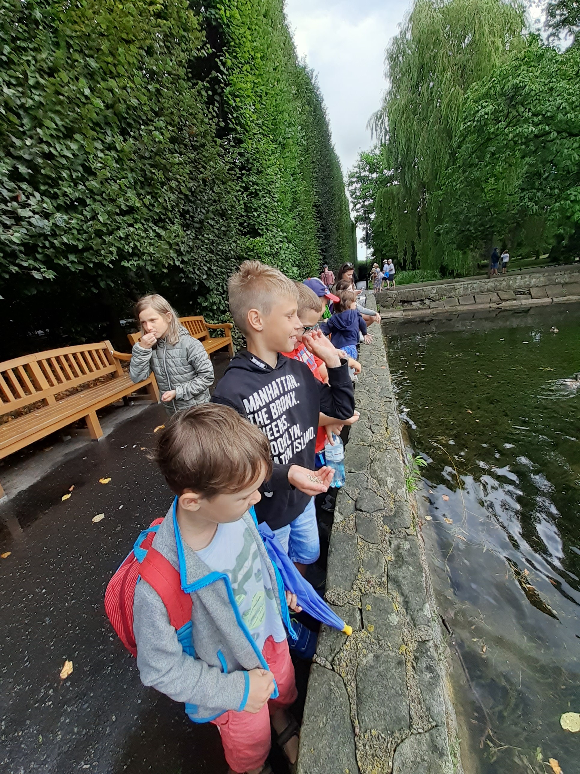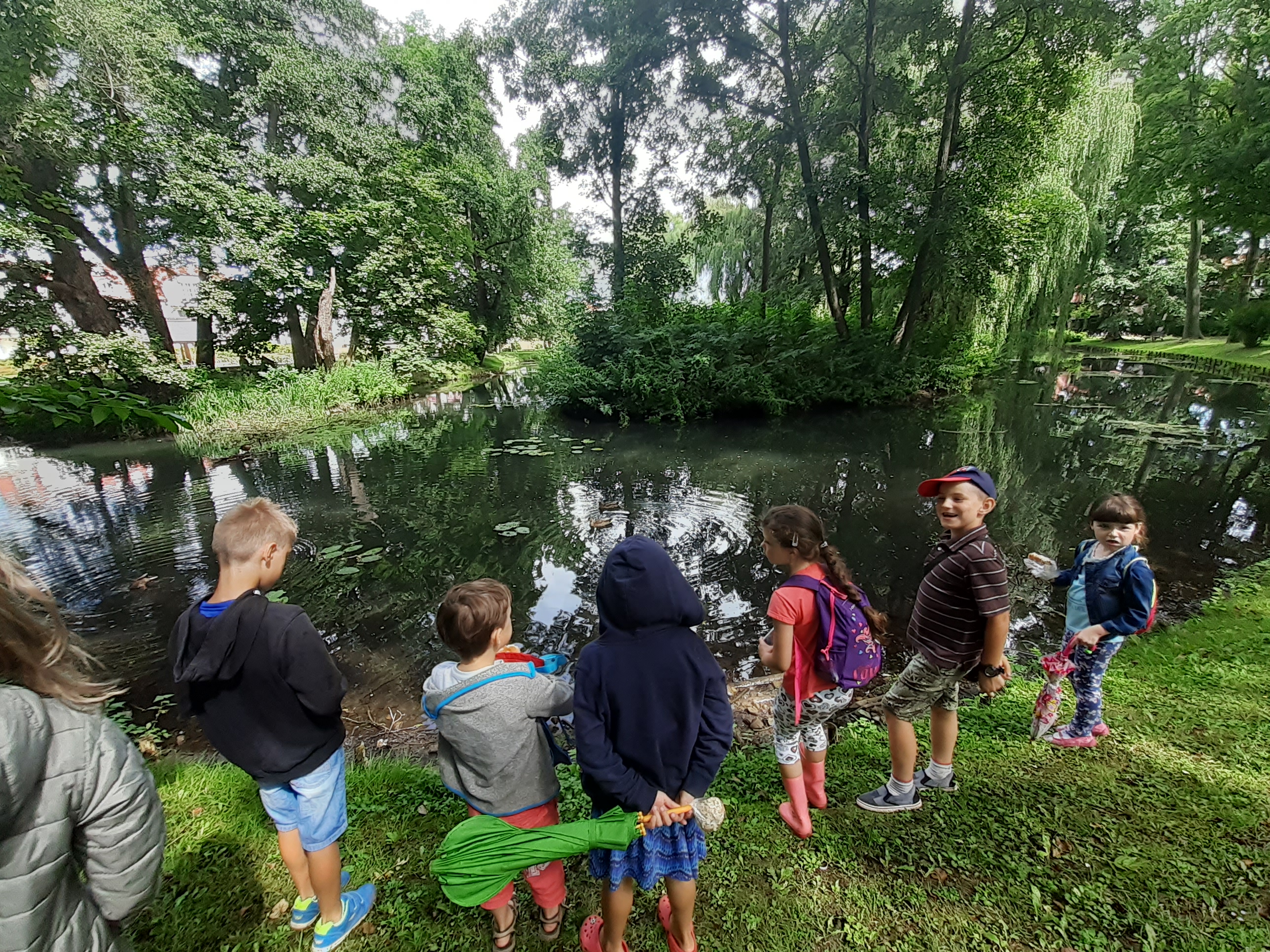 - Grupa dzieci przygląda się kaczkom pływającym w stawie.