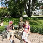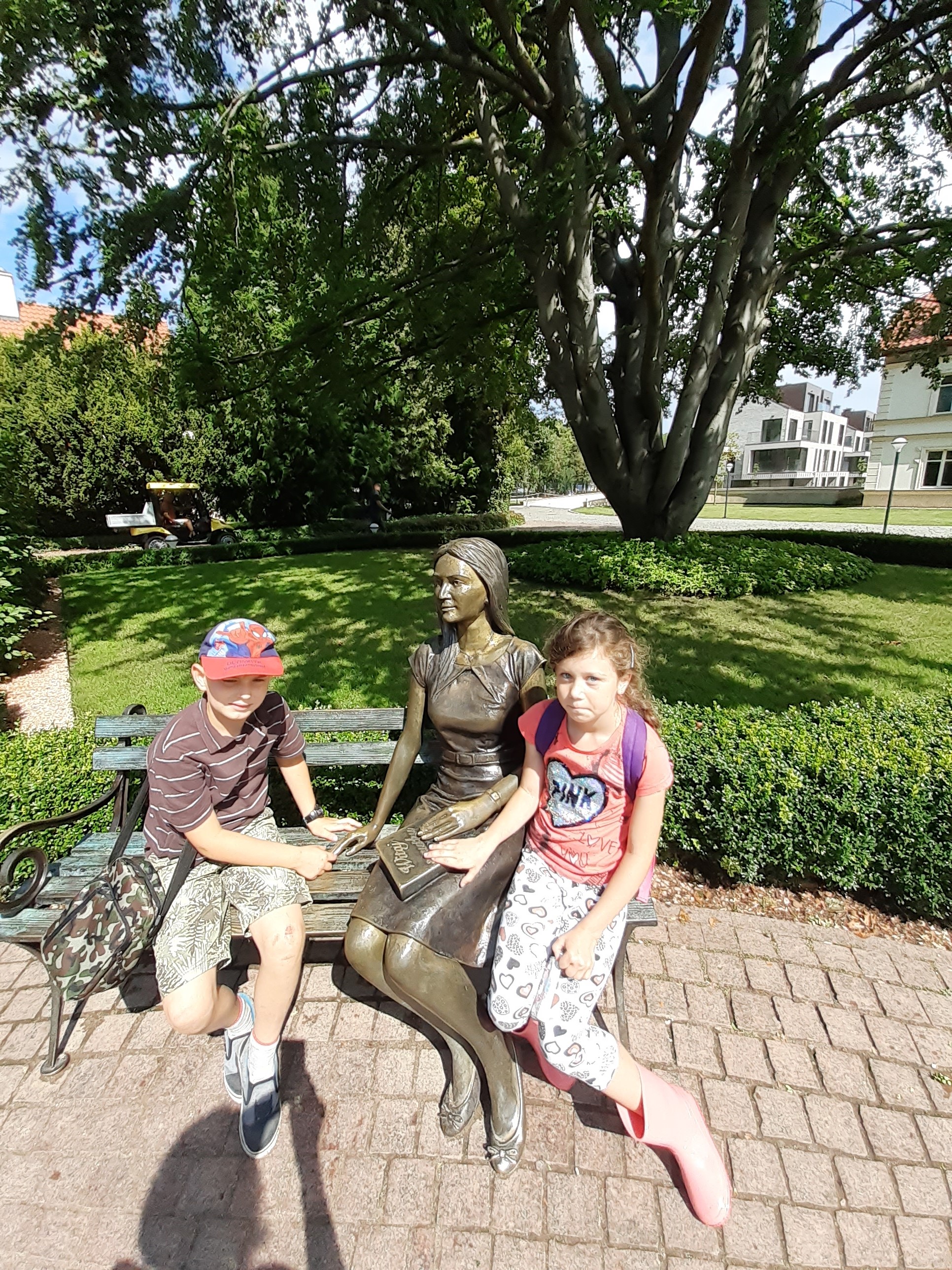 - Dziewczynka i chłopiec siedzą na ławeczce obok metalowej rzeźby przedstawiającej młodą kobietę.