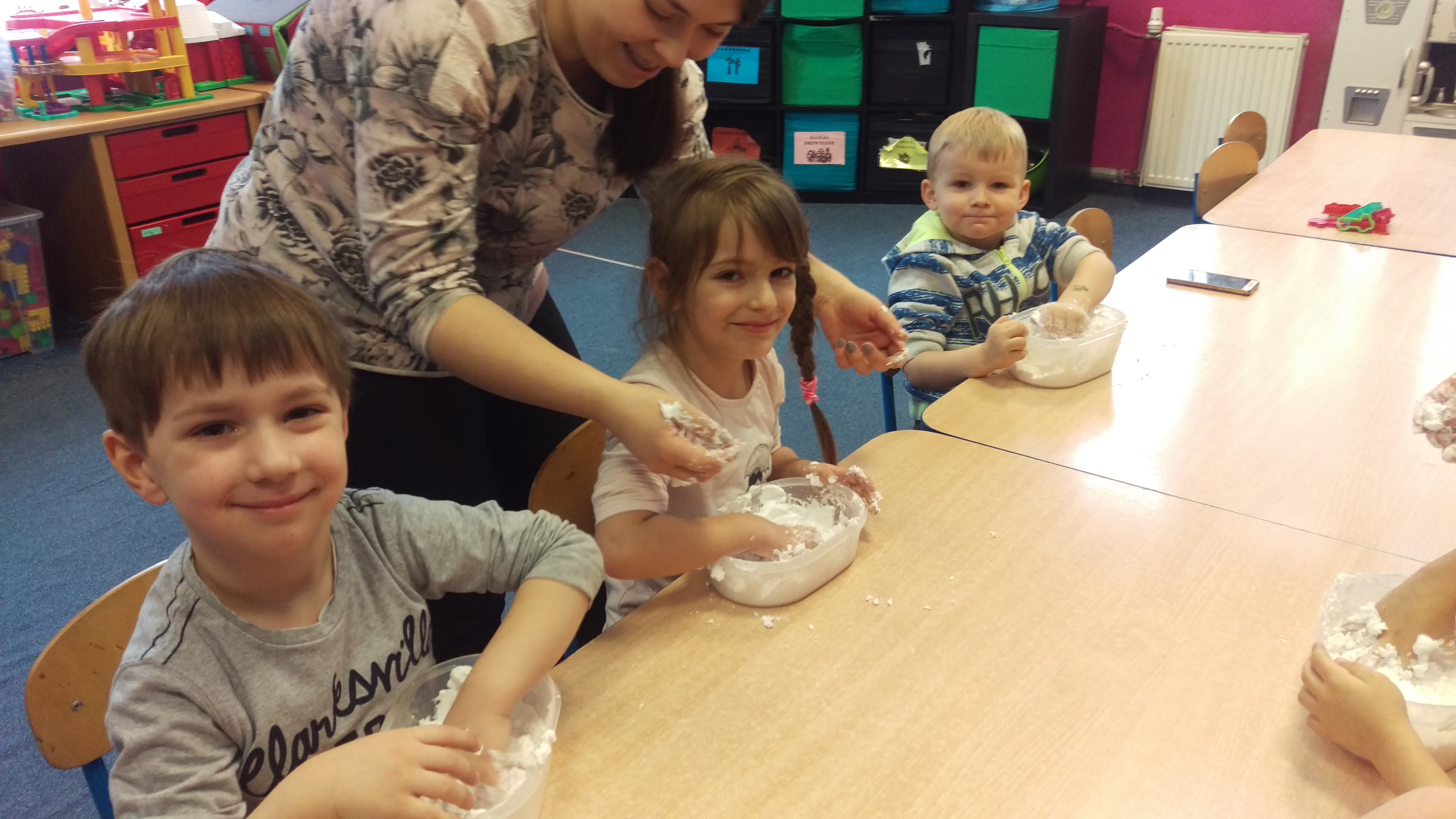 W środę 28.02 Krasnale wesoło zakończyly miesiąc. Z użyciem prostych składników ćwiczyły swoje rączki i wyrabiały mięciutką masę, która w dotyku przypomina nieco piasek kinetyczny. Wysiłek zaowocował wspaniałą zabawą z użyciem foremek, którą aż żal było skończyć. Na pewno jeszcze do niej wrócimy!