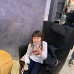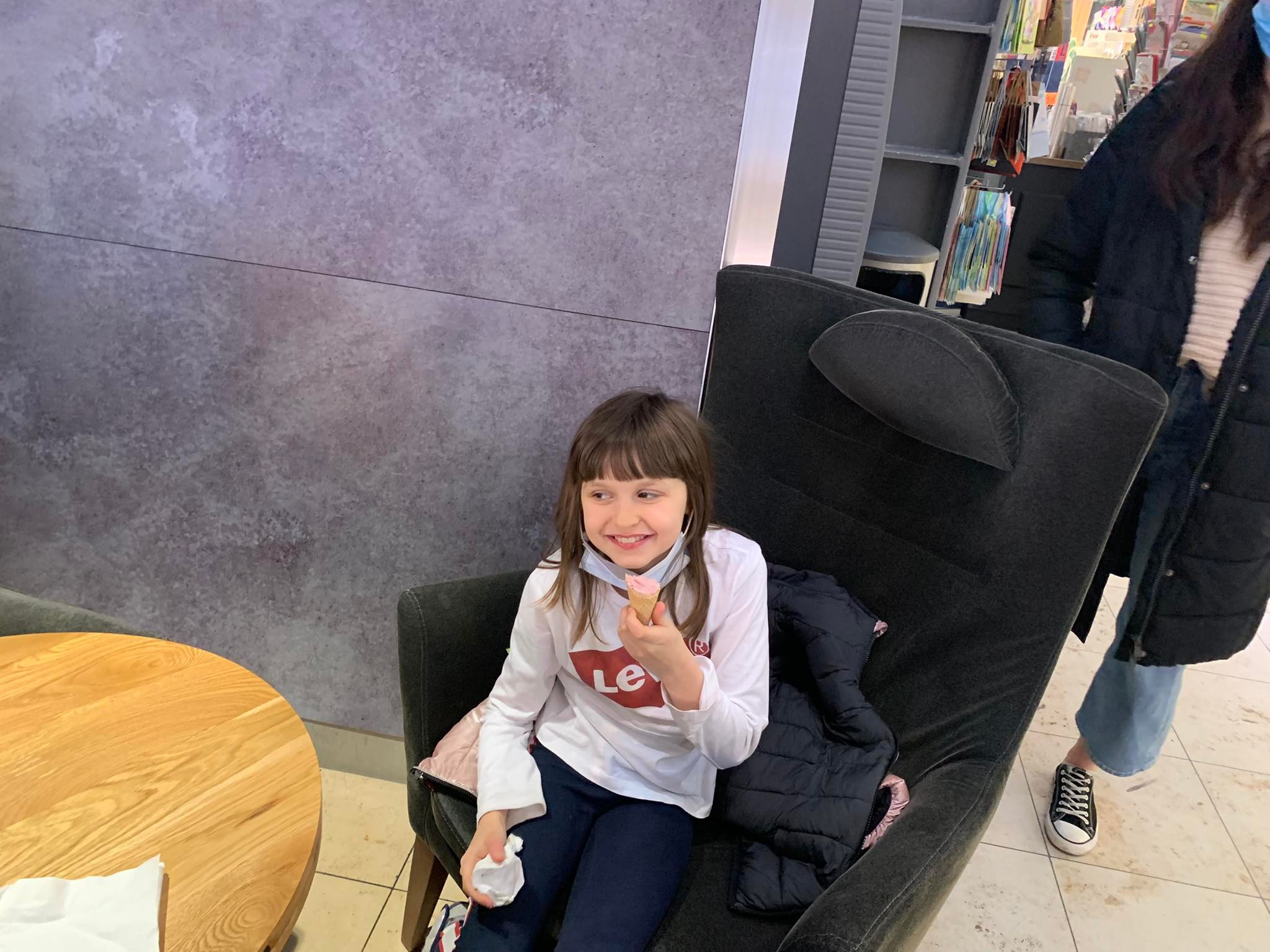 - Uśmiechnięta dziewczynka siedzi w lodziarni na fotelu i je loda.