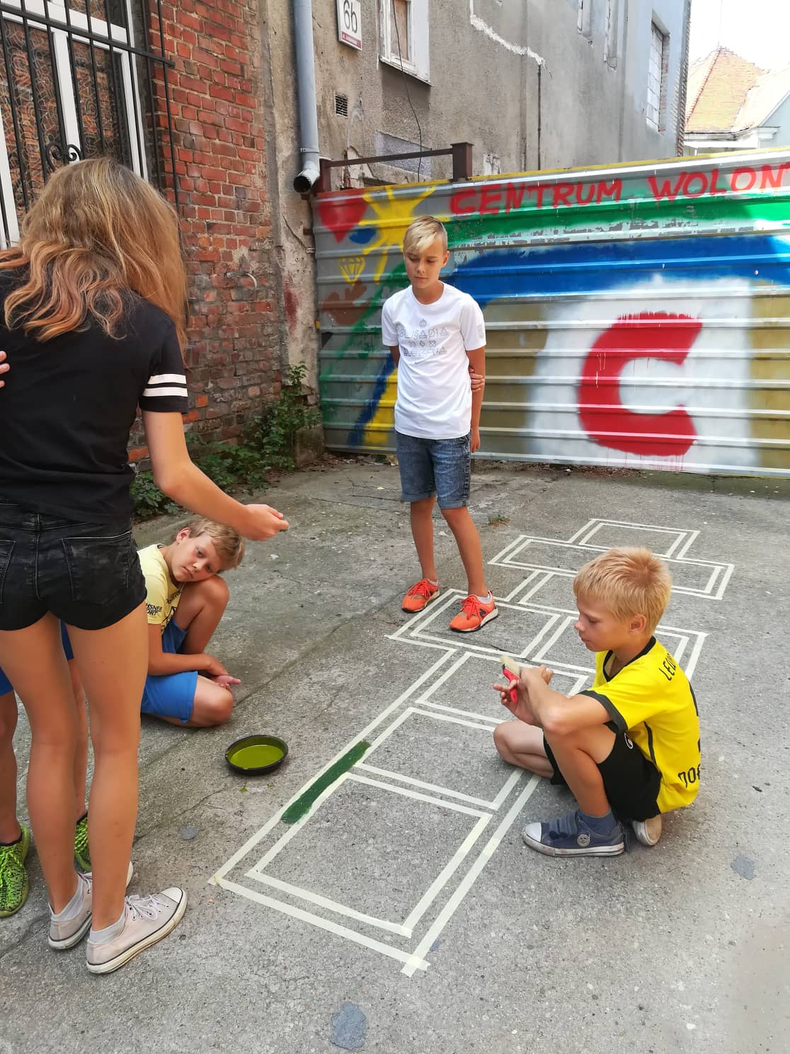 W ramach zajęć plastycznych młodzież z grupy „Sparta” zaangażowała się w przygotowanie dla swoich młodszych kolegów „placu dziecięcej aktywności”. W pocie czoła i pod czujnym okiem naszych wspaniałych wolontariuszek, Noemi i Mafaldy, naszej kreatywnej młodzieży udało się przygotować stanowiska do skoku w dal, gry w klasy oraz twistera. Po wykonanej pracy przystąpiliśmy do testowania naszego placu, który zyskał aprobatę młodszych i starszych podopiecznych Centrum.