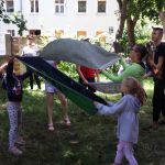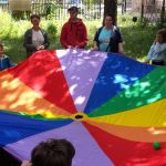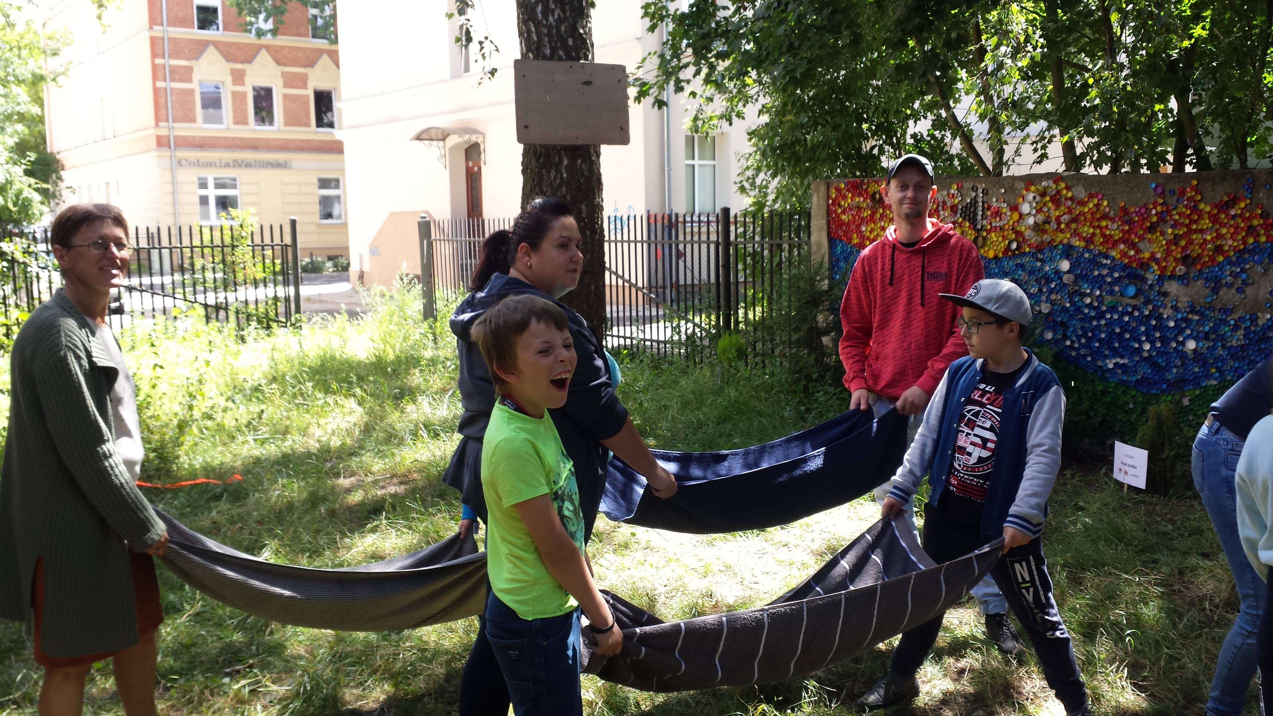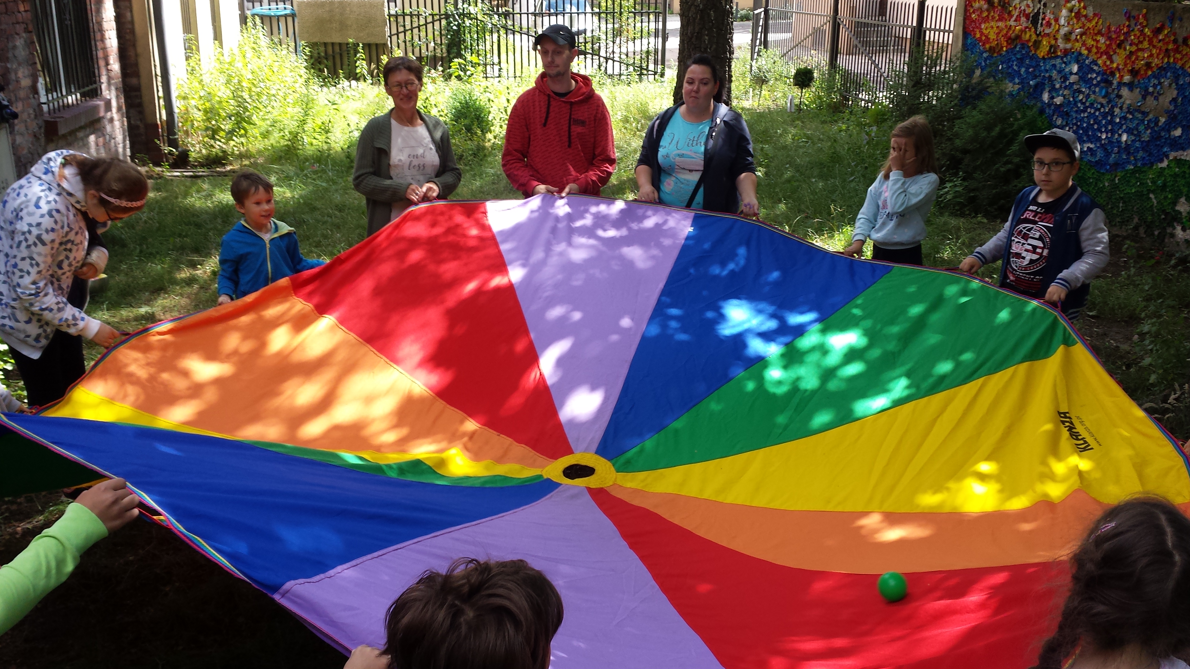 - Grupa dzieci i dorosłych trzyma kolorową chustę animacyjną.