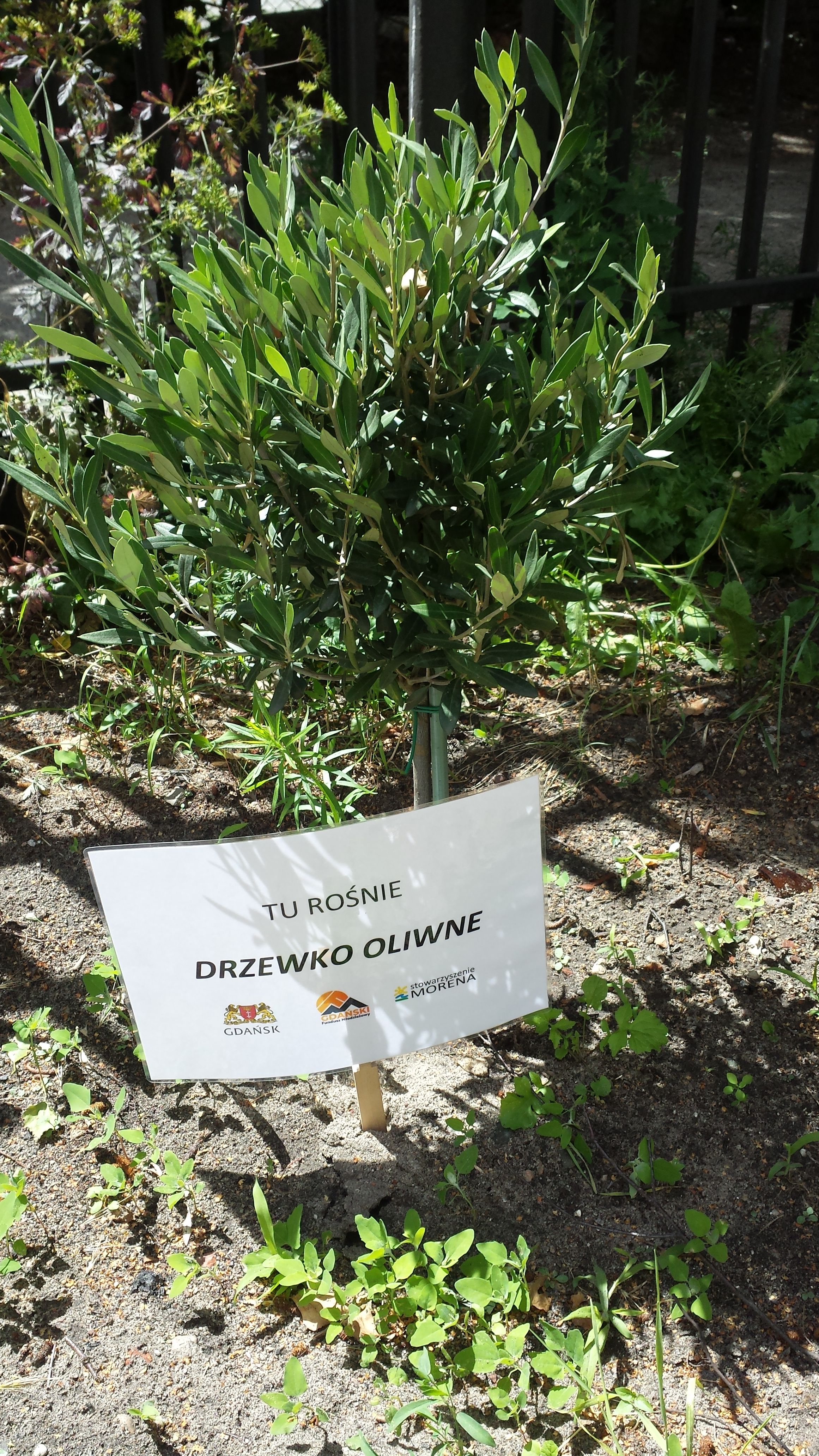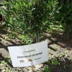 - Zdjęcie przedstawia zielony krzew z podpisem „Tu rośnie drzewko oliwne”.
