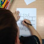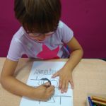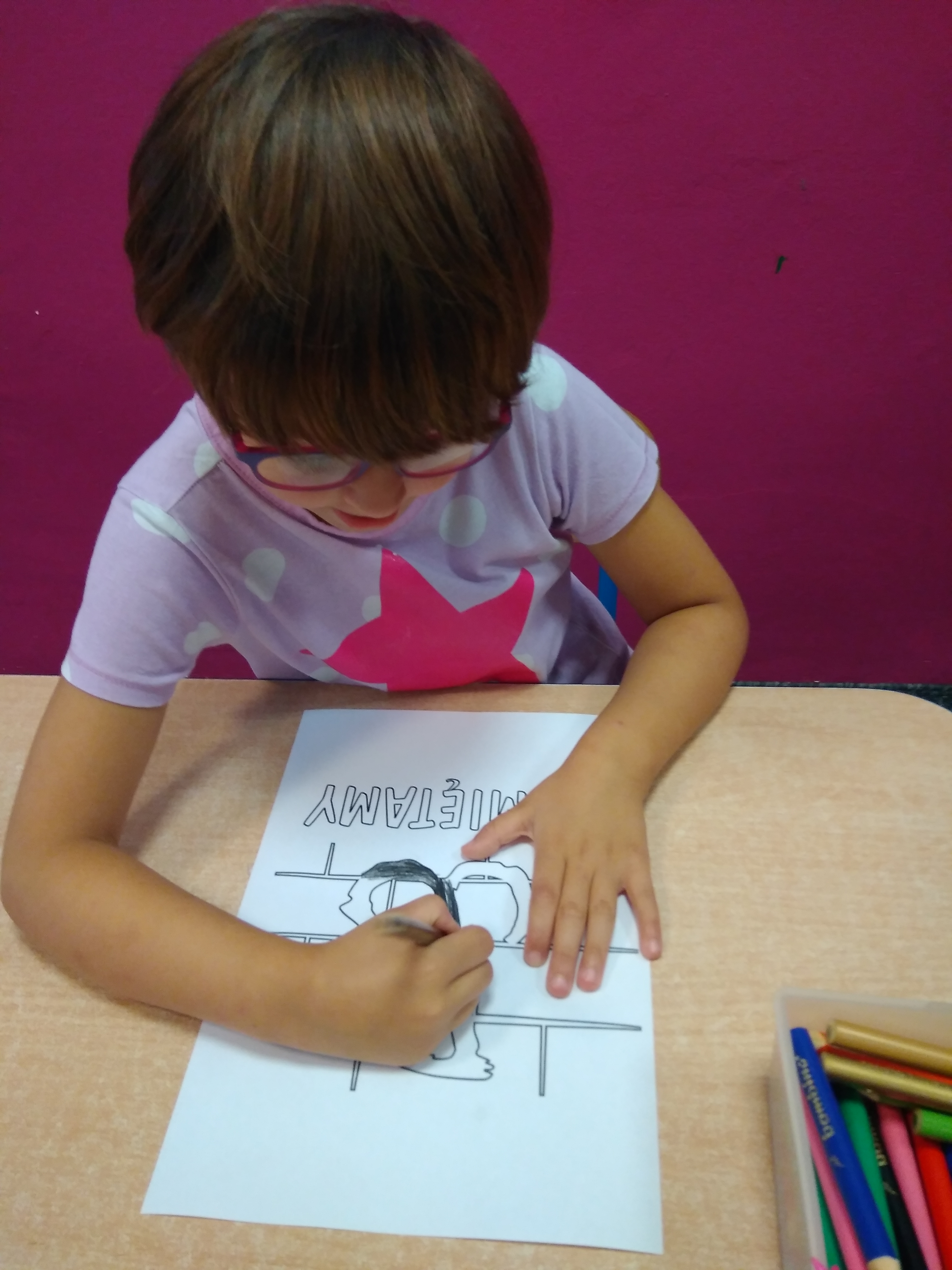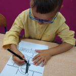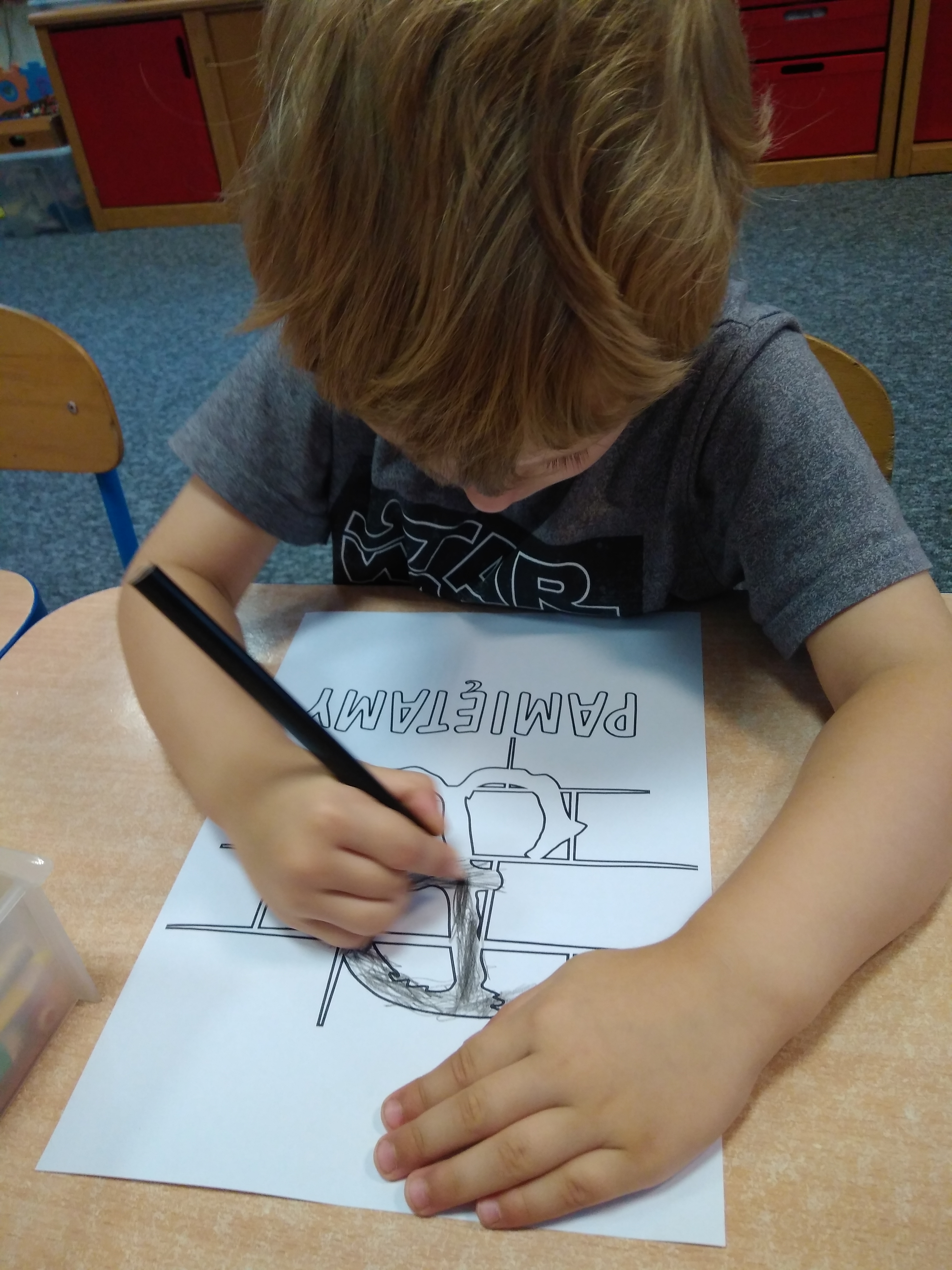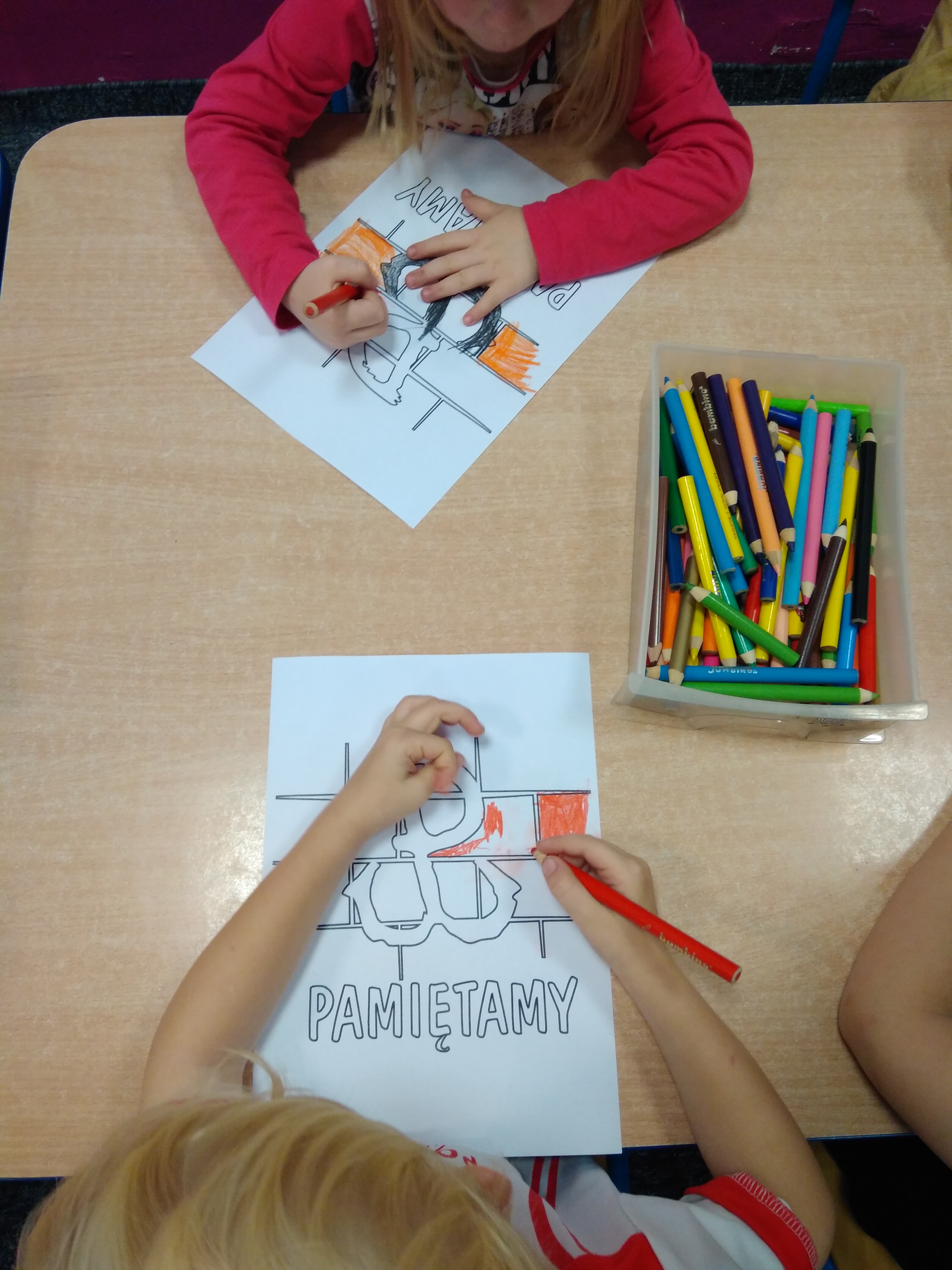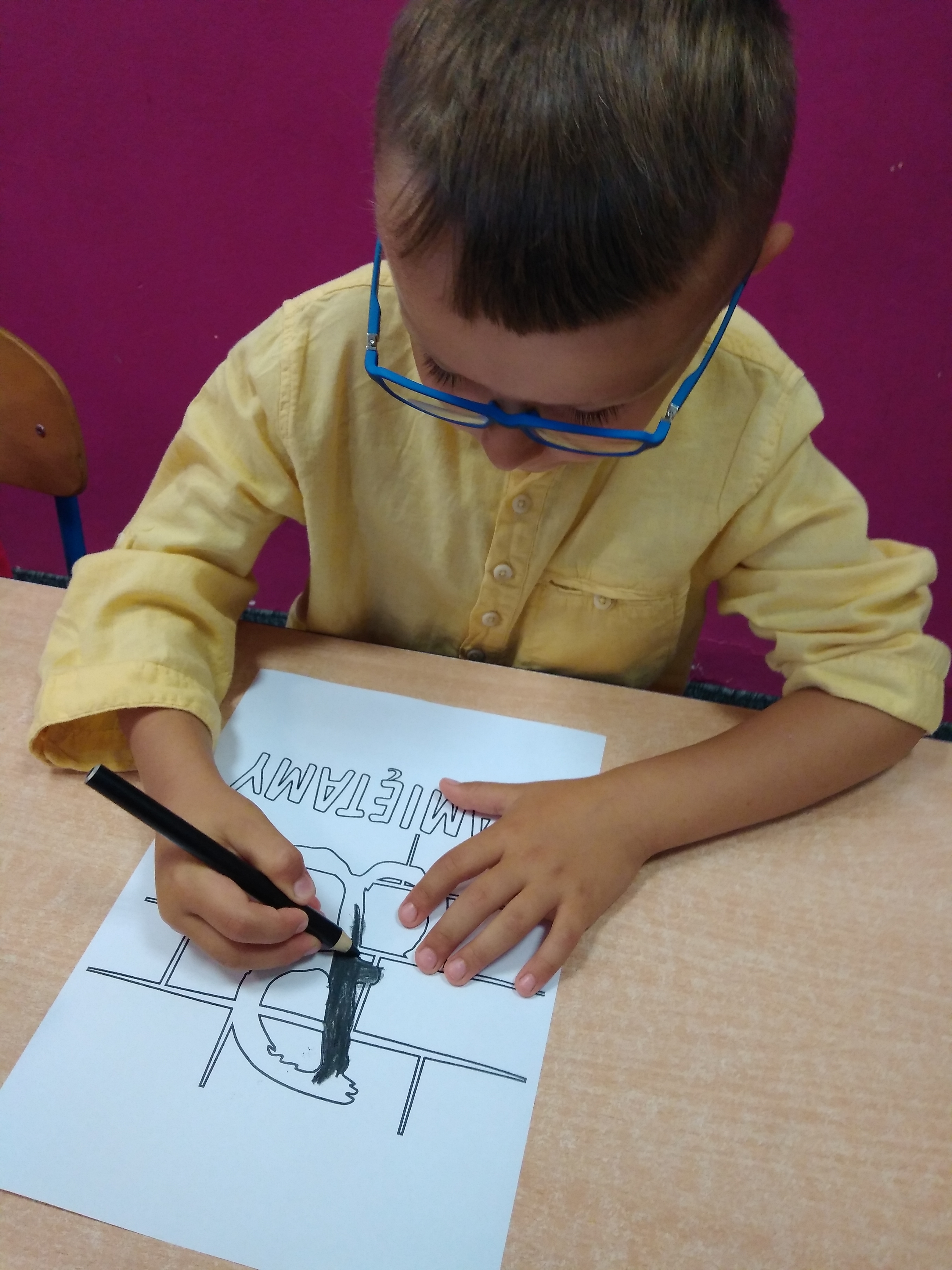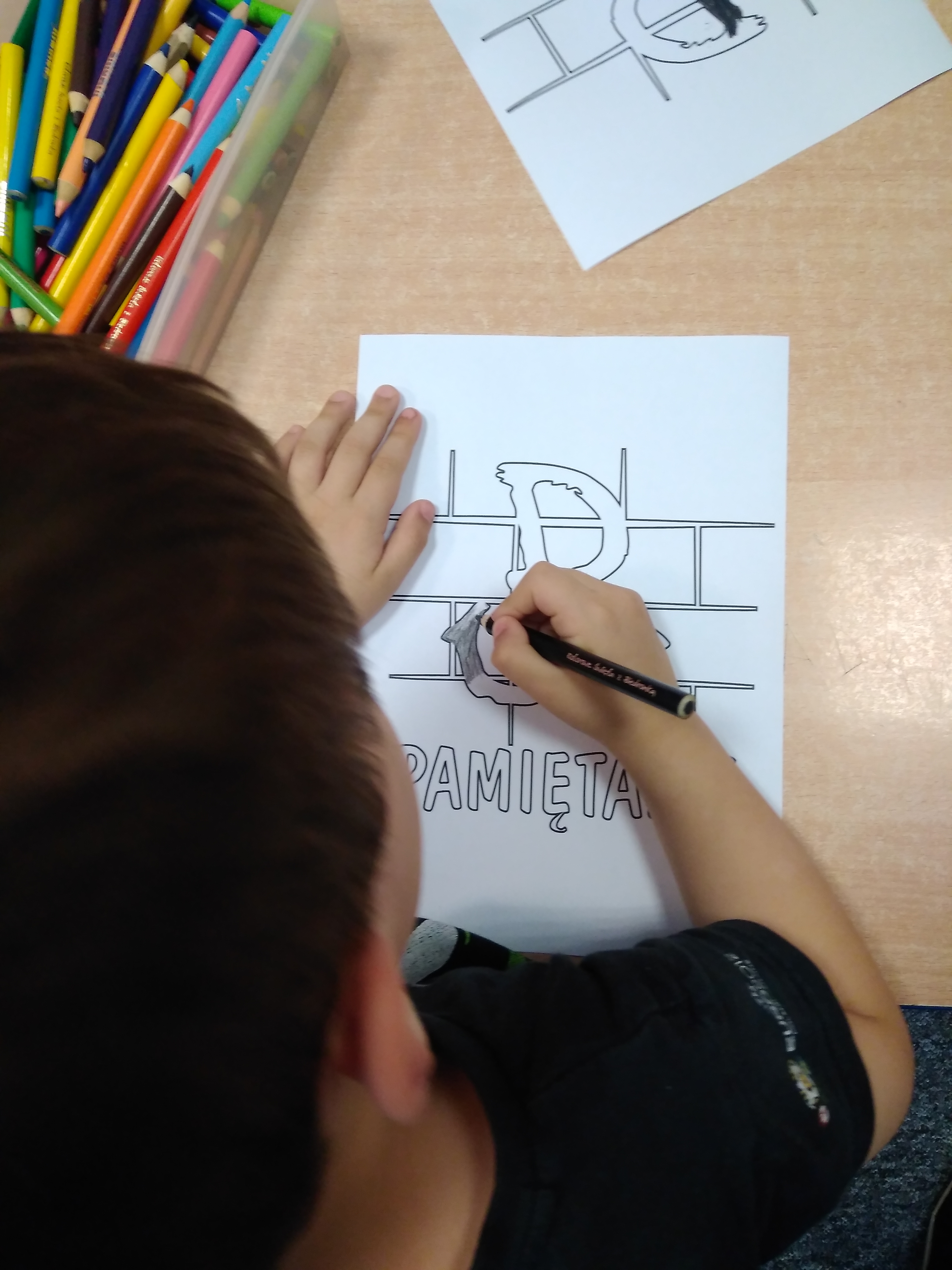 - W centrum obrazka siedzi chłopiec w żółtej koszuli i koloruje kartkę ze znakiem Polski walczącej i napisem „Pamiętamy”.