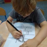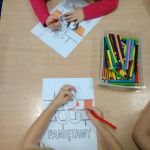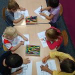 - Grupa dzieci pracuje przy stoliku, kolorują kolorowankę upamiętniającą Powstanie Warszawskie.