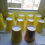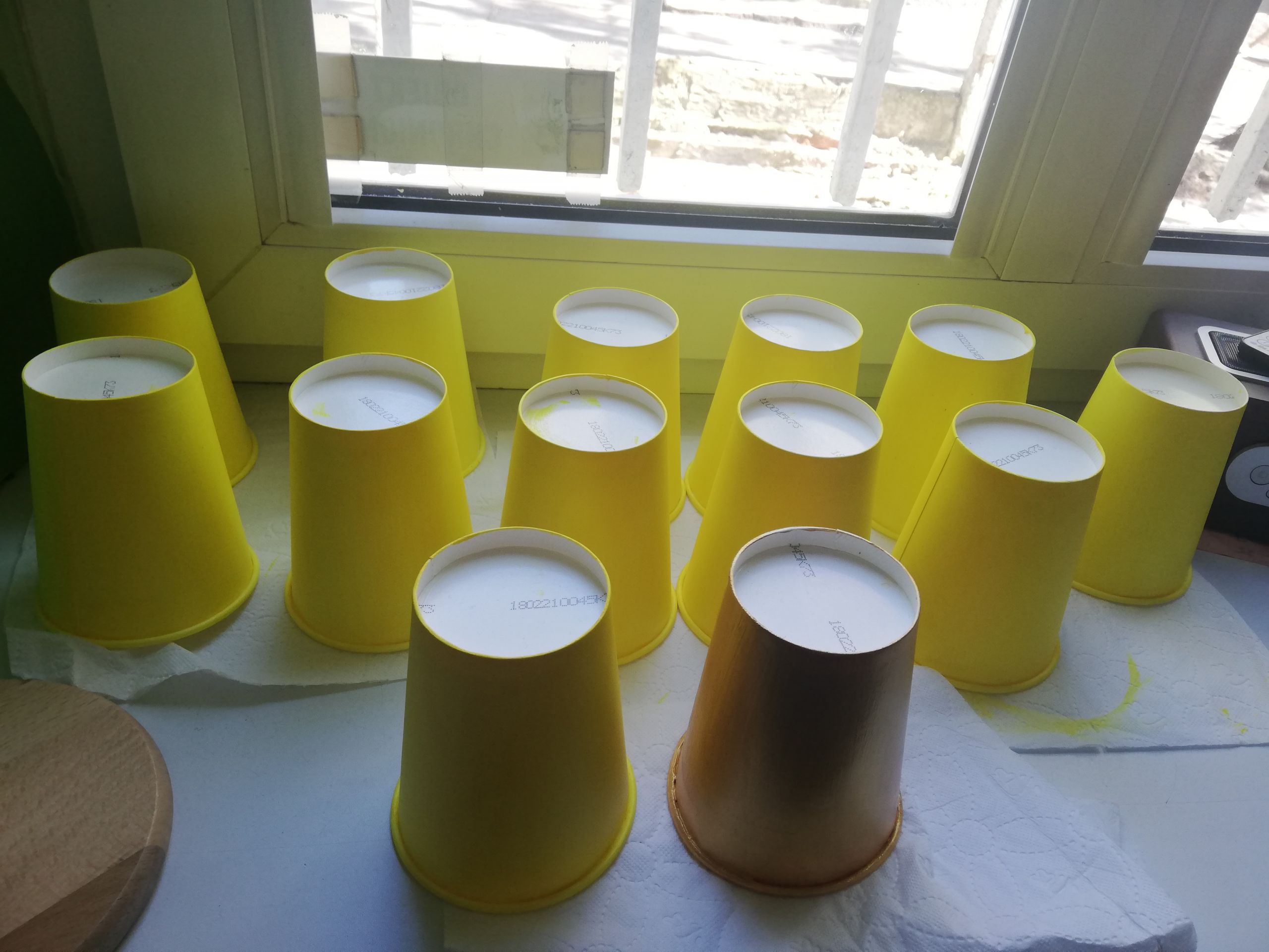 - Prace plastyczne pszczółki zrobione z papierowych kubeczków stoją na czarnym stole.