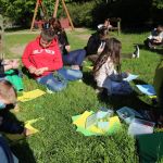 - Grupa dzieci siedzi na trawniku i tworzy roślinne haiku.