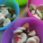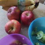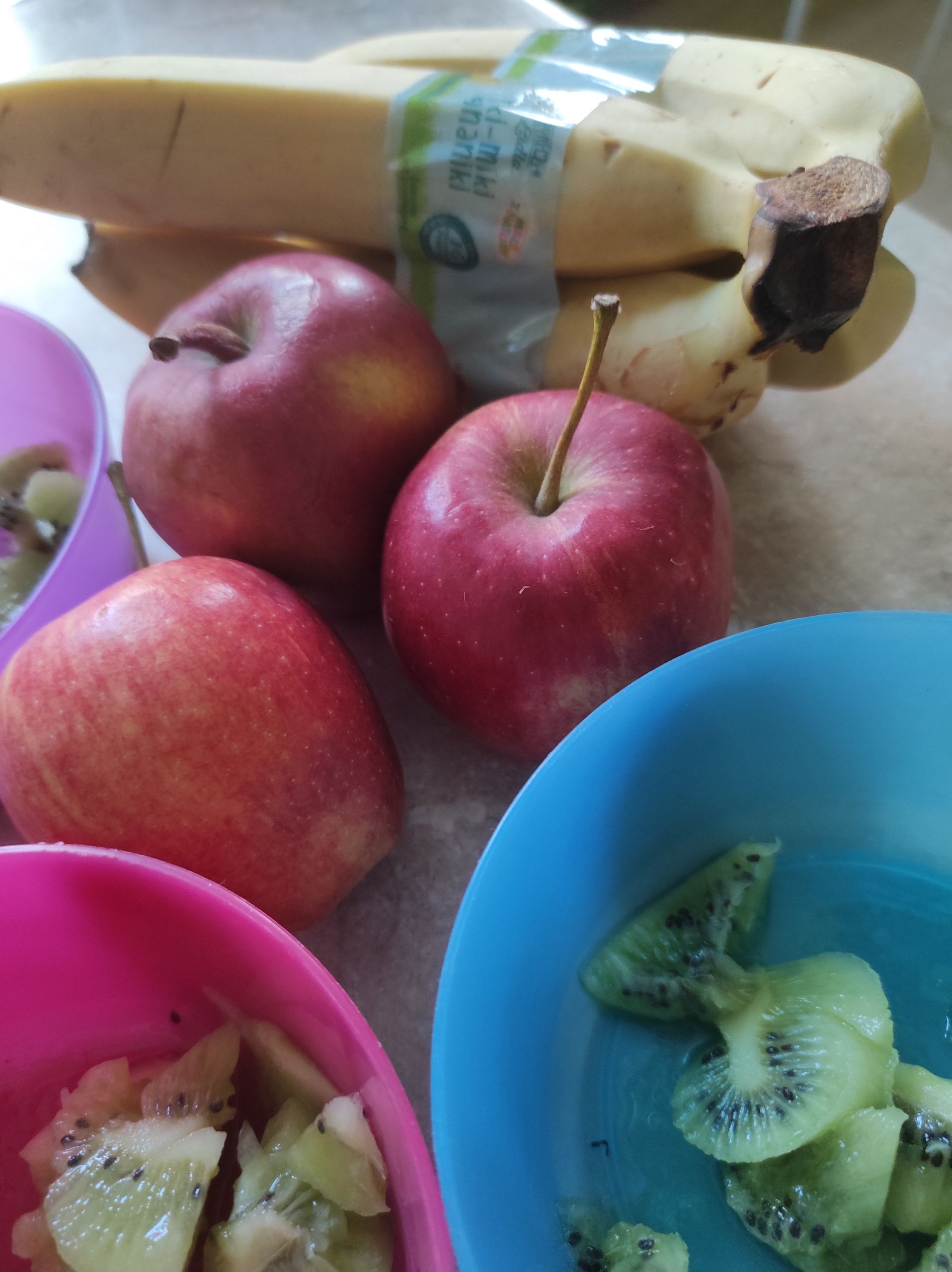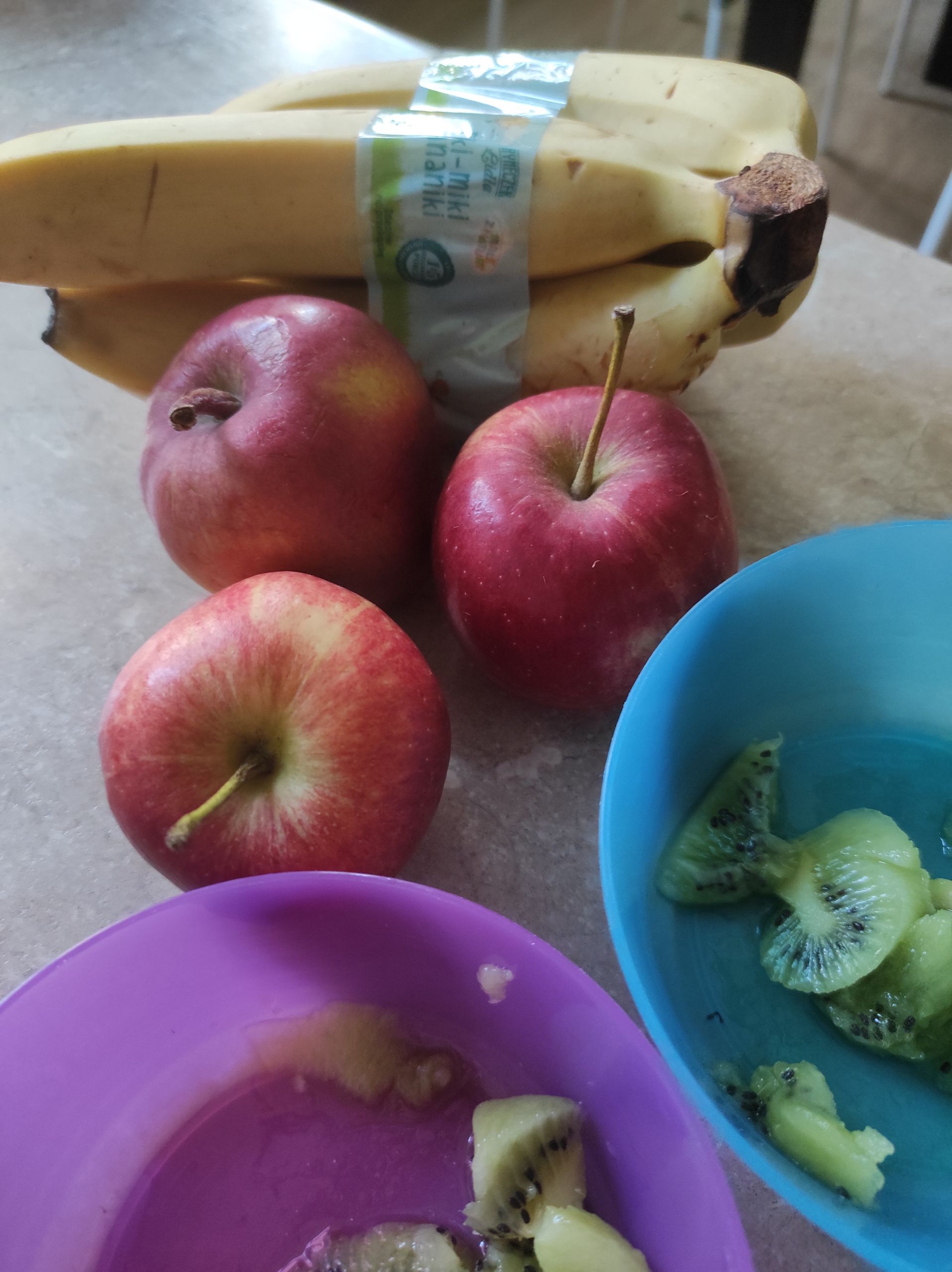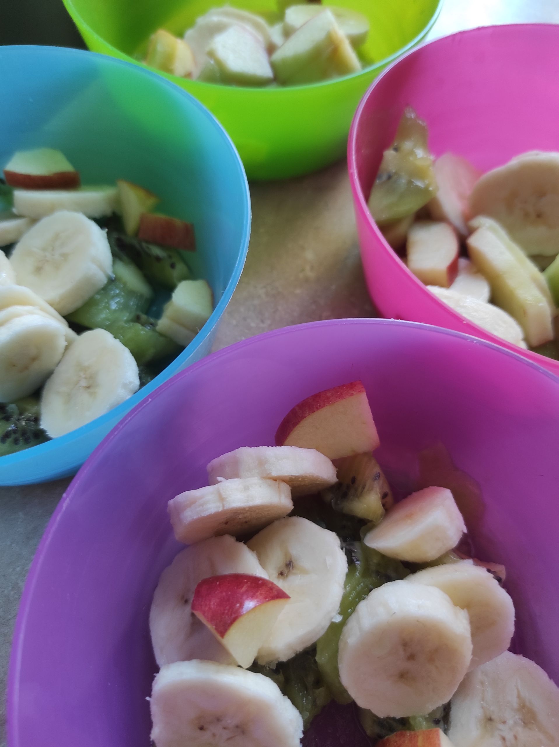 - Kolorowe miseczki wypełnione pokrojonymi owocami – bananem, kiwi i jabłkiem.