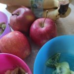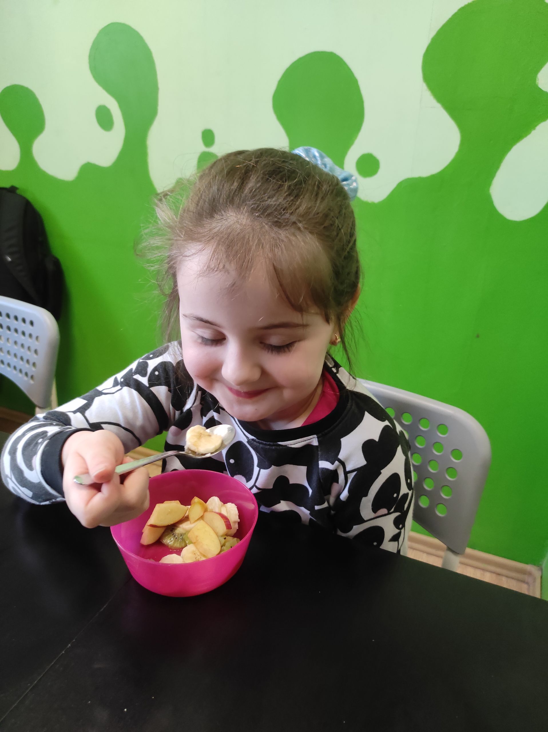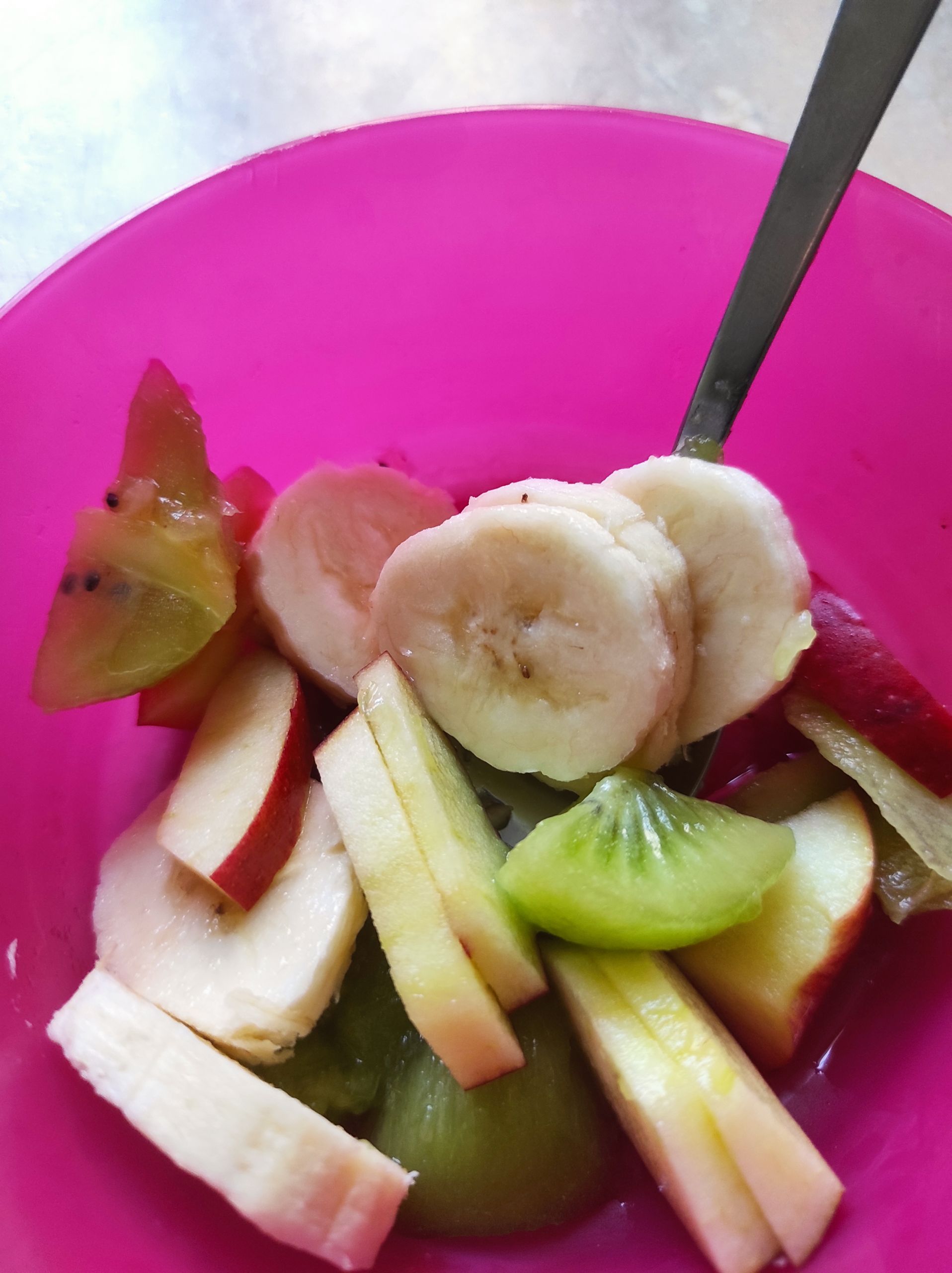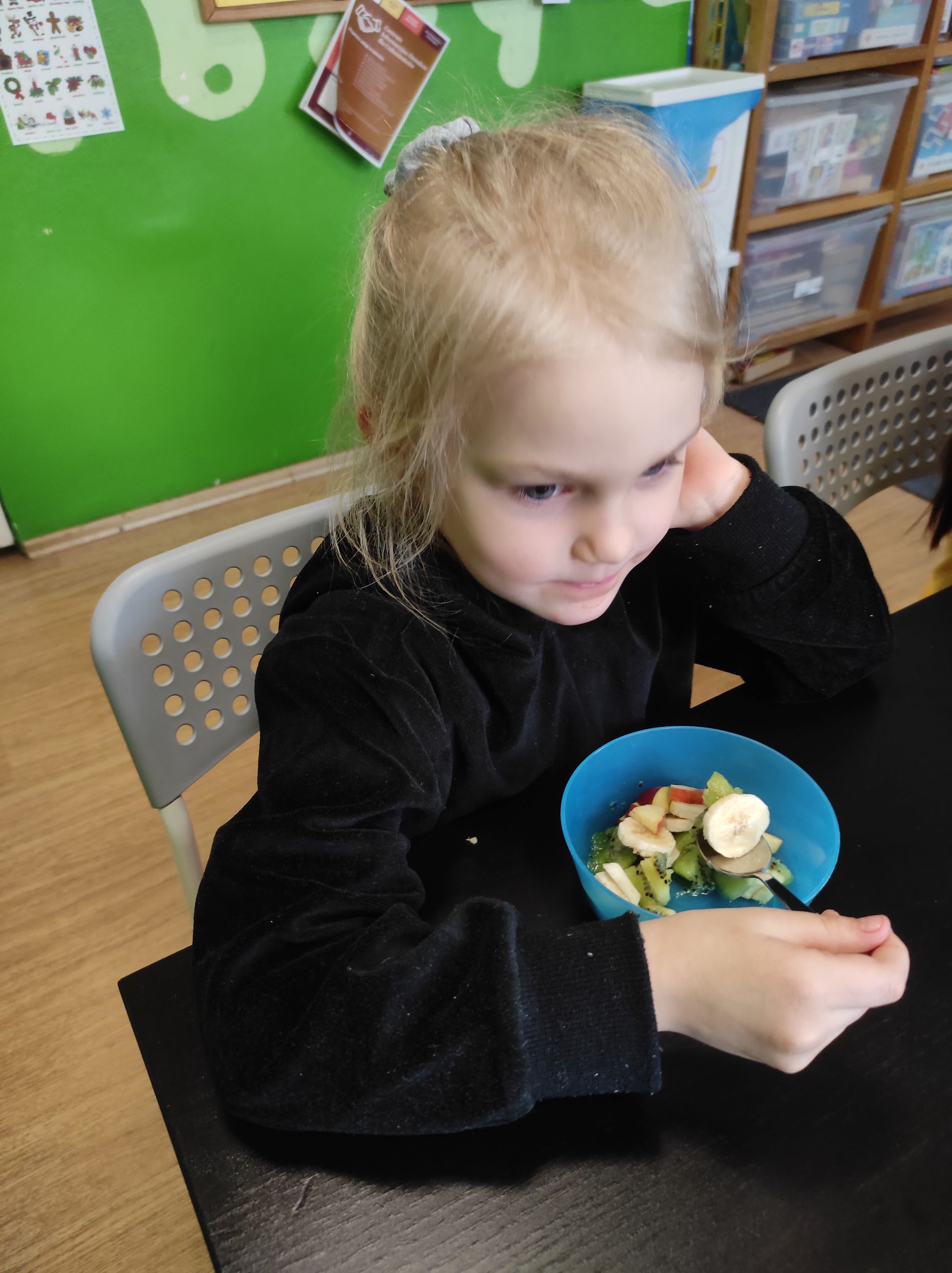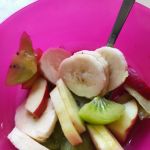 - Kolorowe miseczki wypełnione pokrojonymi owocami – bananem, kiwi i jabłkiem.