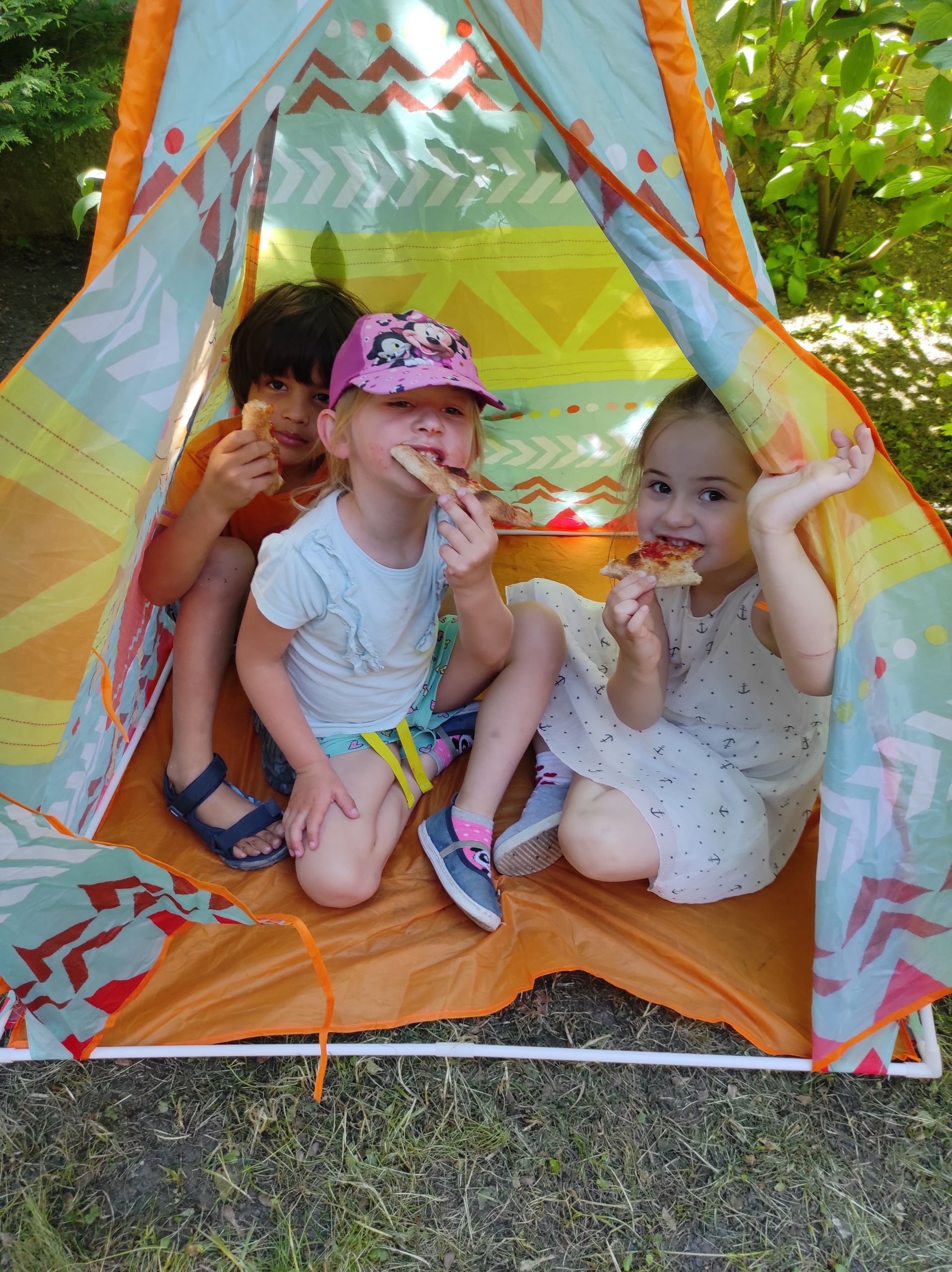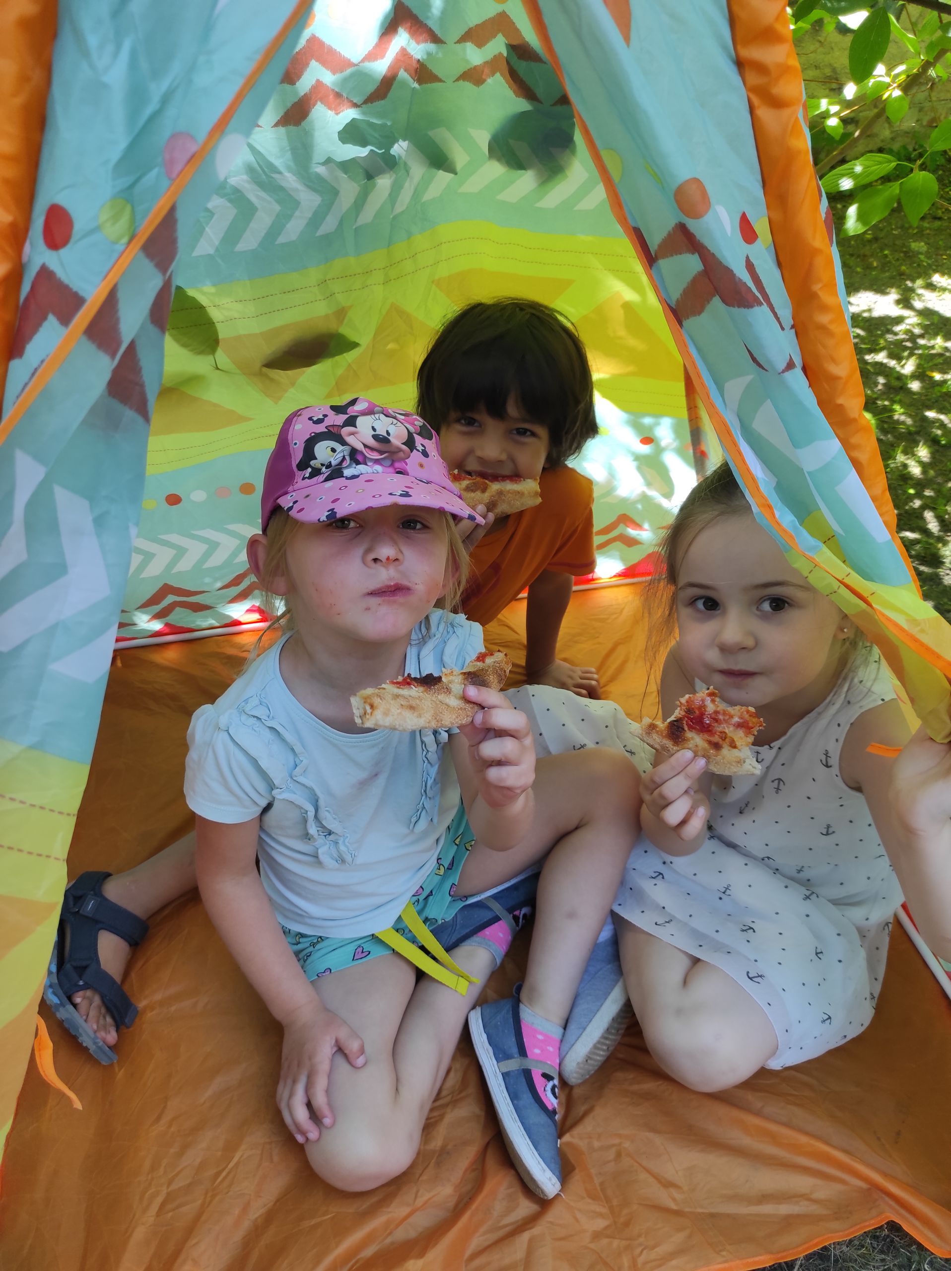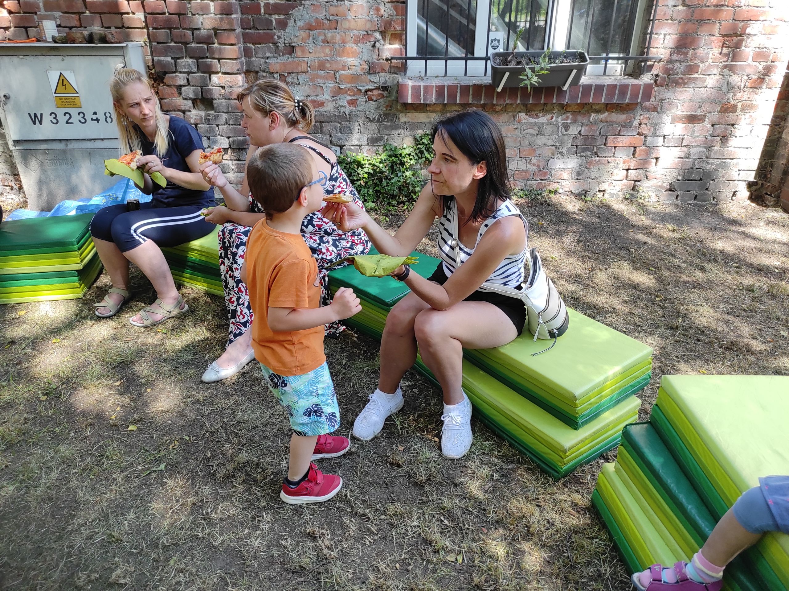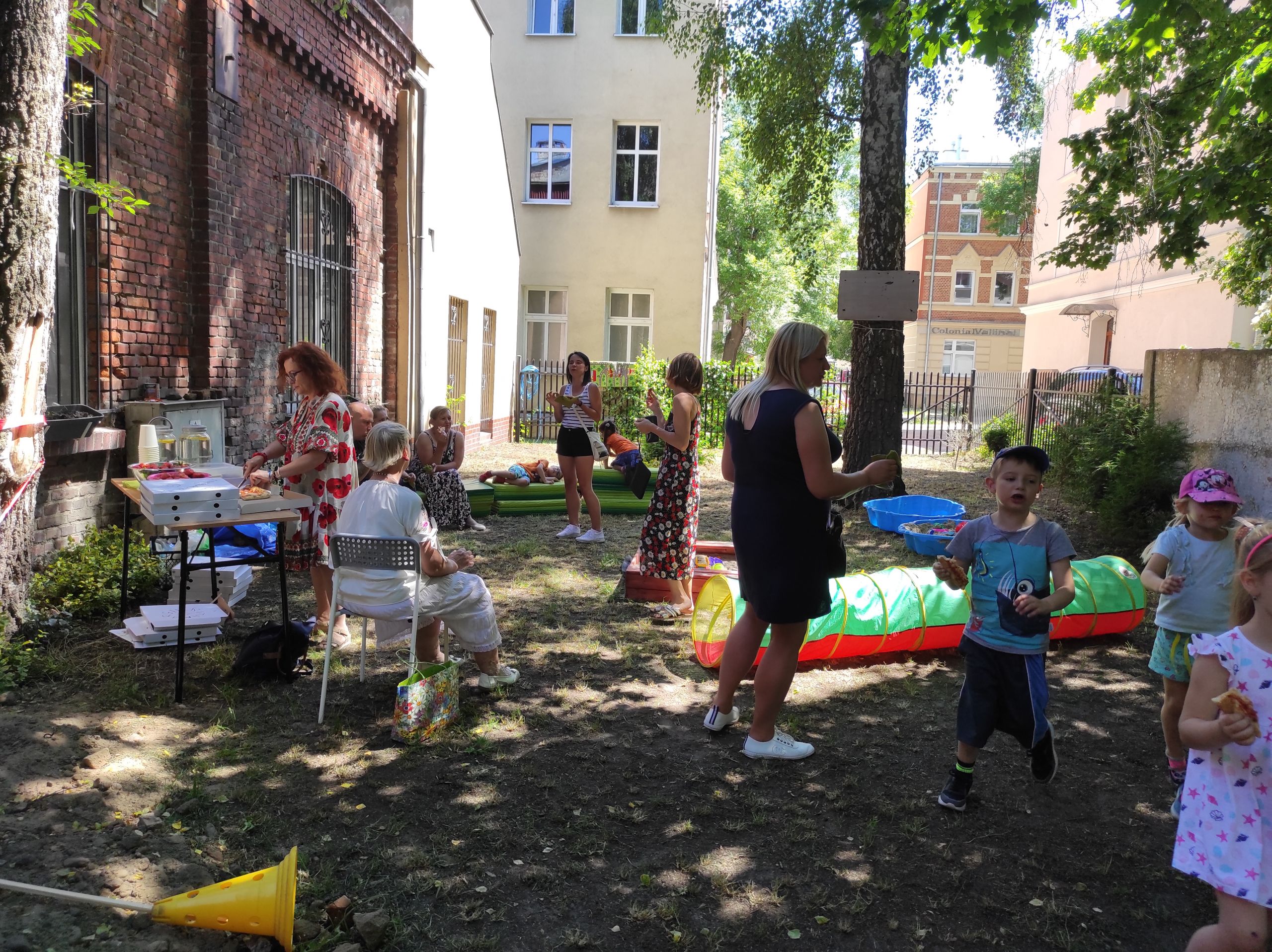 17.06.2021r. w podziękowaniu dla rodziców naszych Krasnali zorganizowaliśmy piknik w naszym ogródku. Rodzice na początku wiosny bardzo się zaangażowali w prace ogrodowe oraz zakupili nową piaskownicę do ogródka. Dzięki ich pracy oraz wsparciu nasze dzieciaki mają teraz piękne miejsce do zabawy i aktywnego wypoczynku. Na naszym pikniku nie zabrakło pyszności – pizzy, truskawek oraz kilku słodkości, które wszyscy zajadali ze smakiem. Urzekły nas pudełka od pizzy, które miały śliczne rysunki, żaden z nich nie powtarzał się dwa razy. Mielimy też czas na różnego rodzaju zabawy oraz puszczanie baniek mydlanych, które przyniosły dużo uśmiechu dla dzieci, jak i dla dorosłych 🙂 🙂 🙂