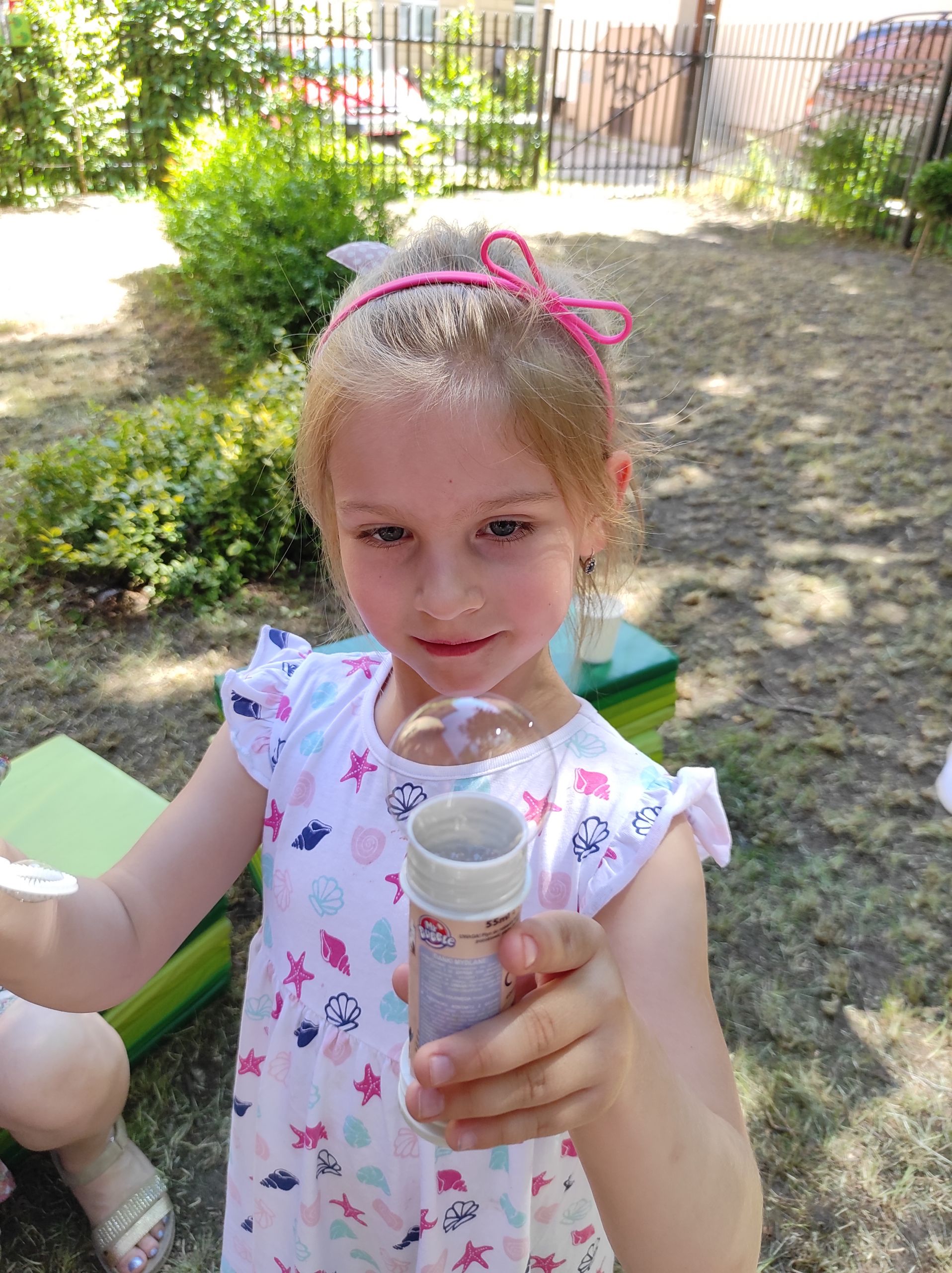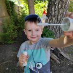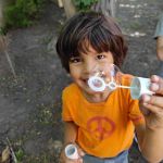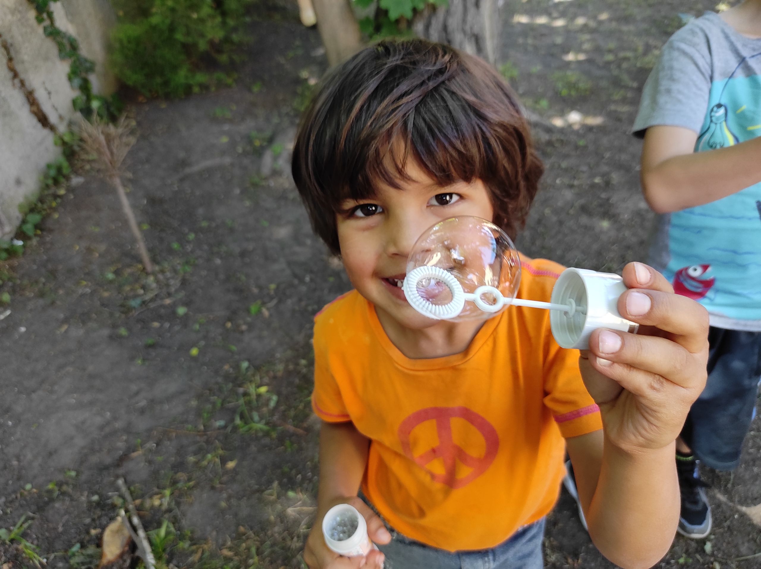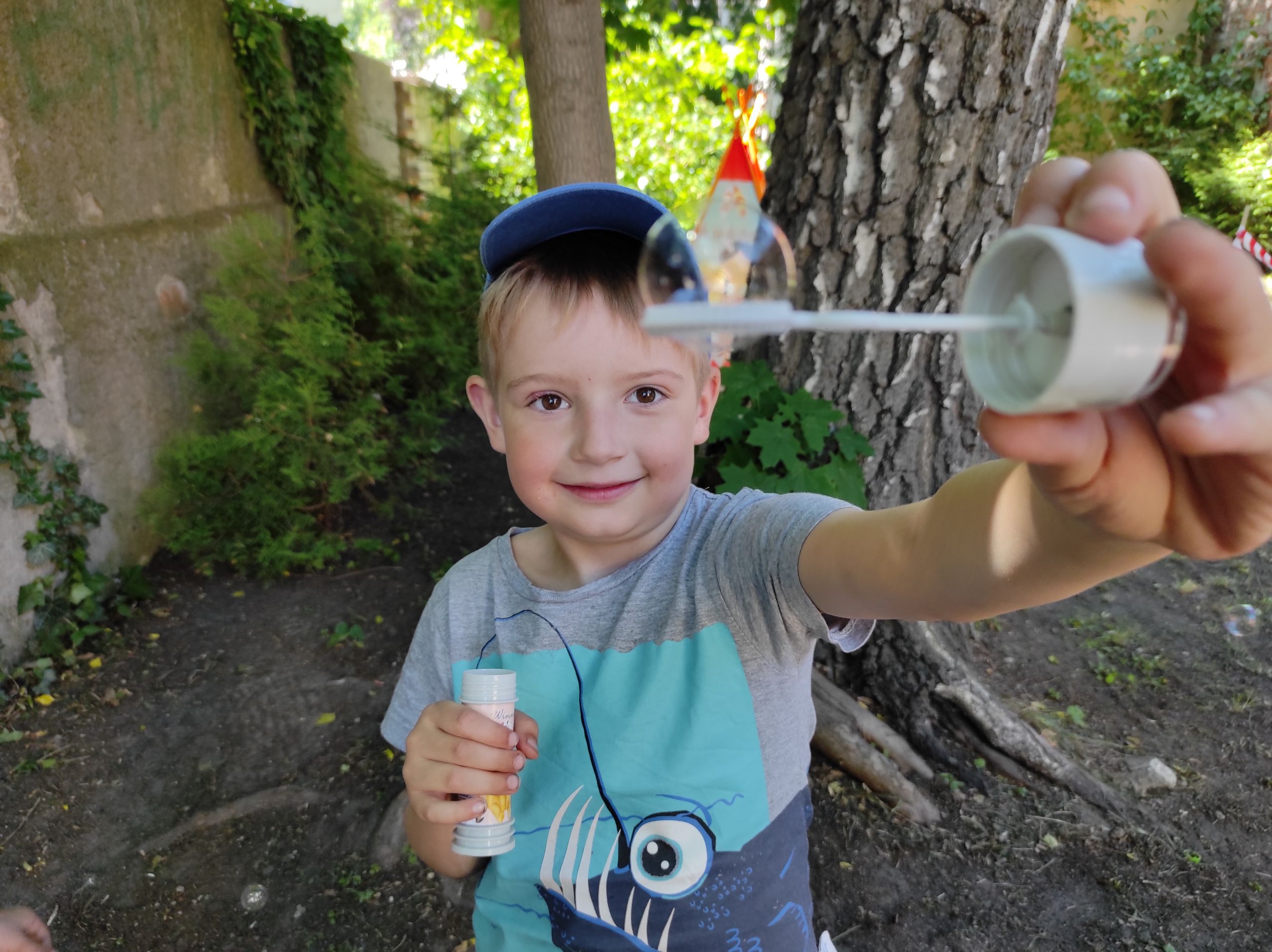 - Chłopiec w trakcie puszczania baniek mydlanych.