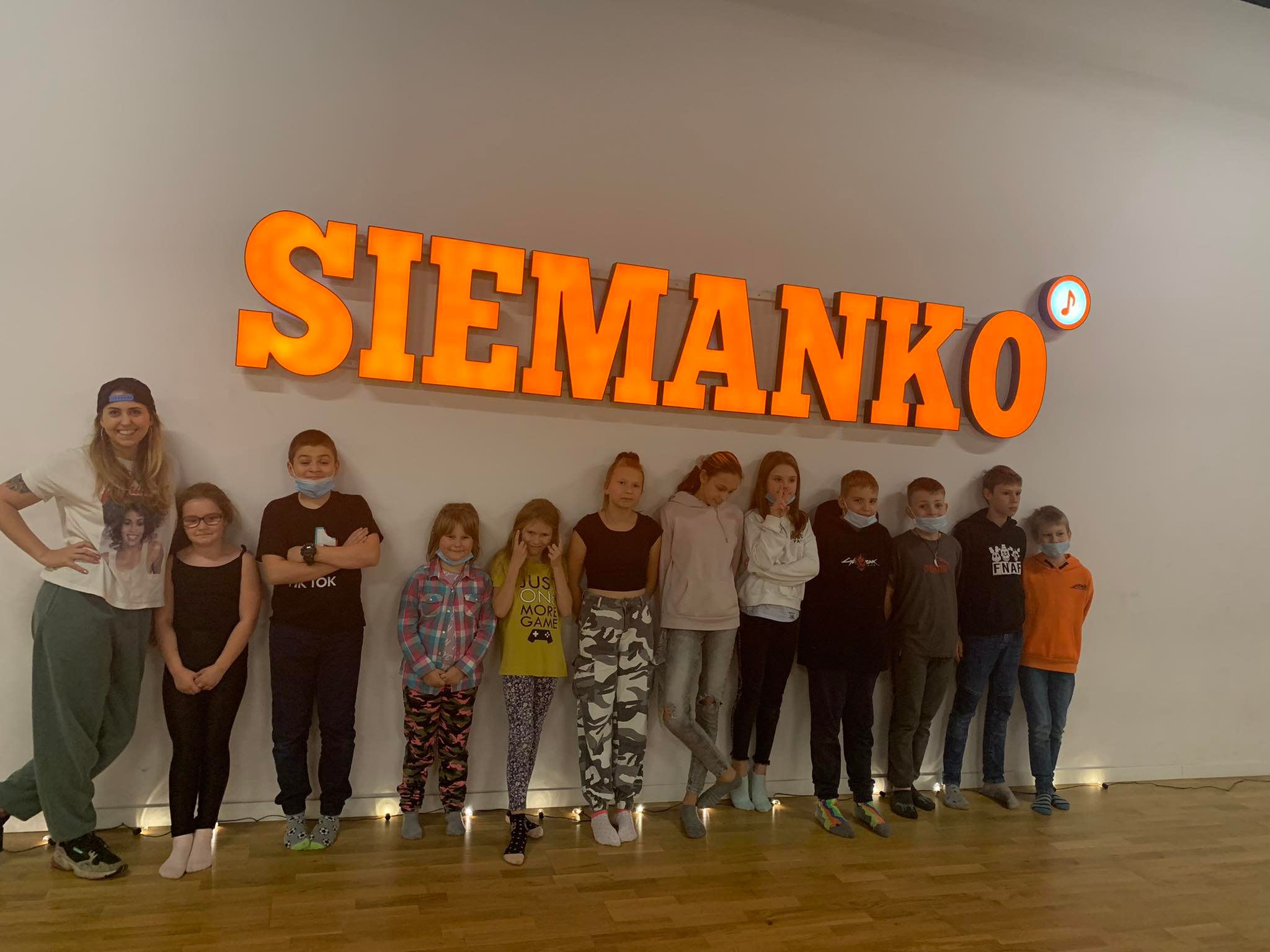 - Grupa dzieci stoi na sali tanecznej. Na ścianie wisi duży, pomarańczowy napis „Siemanko”.