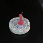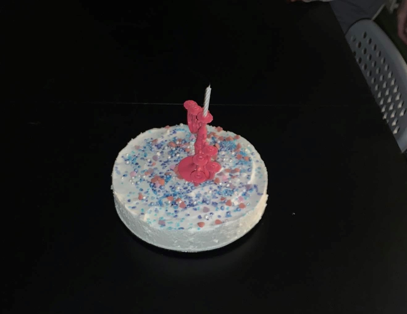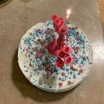 - Kolorowy tort urodzinowy z różową świeczką wbitą w środek.