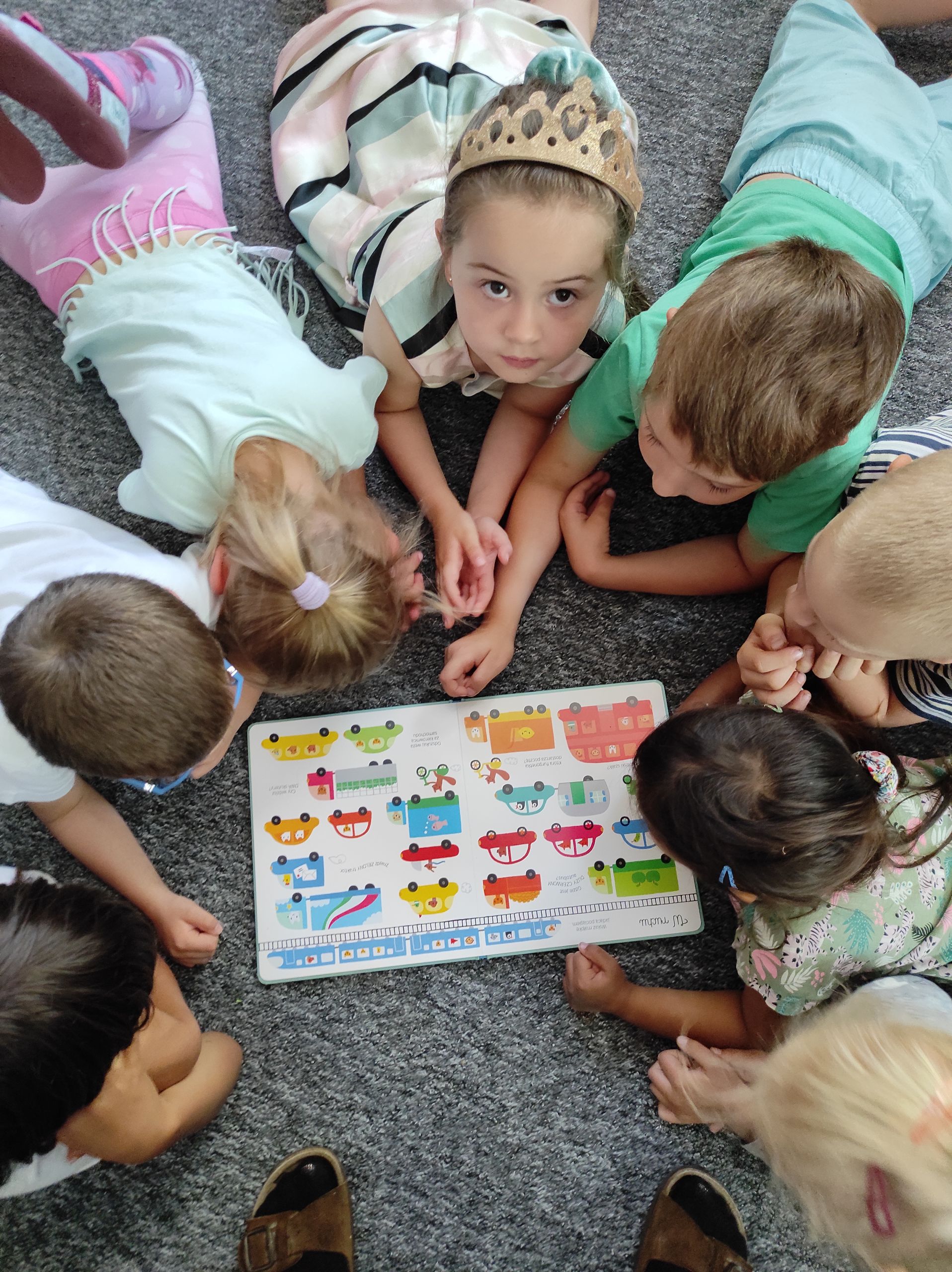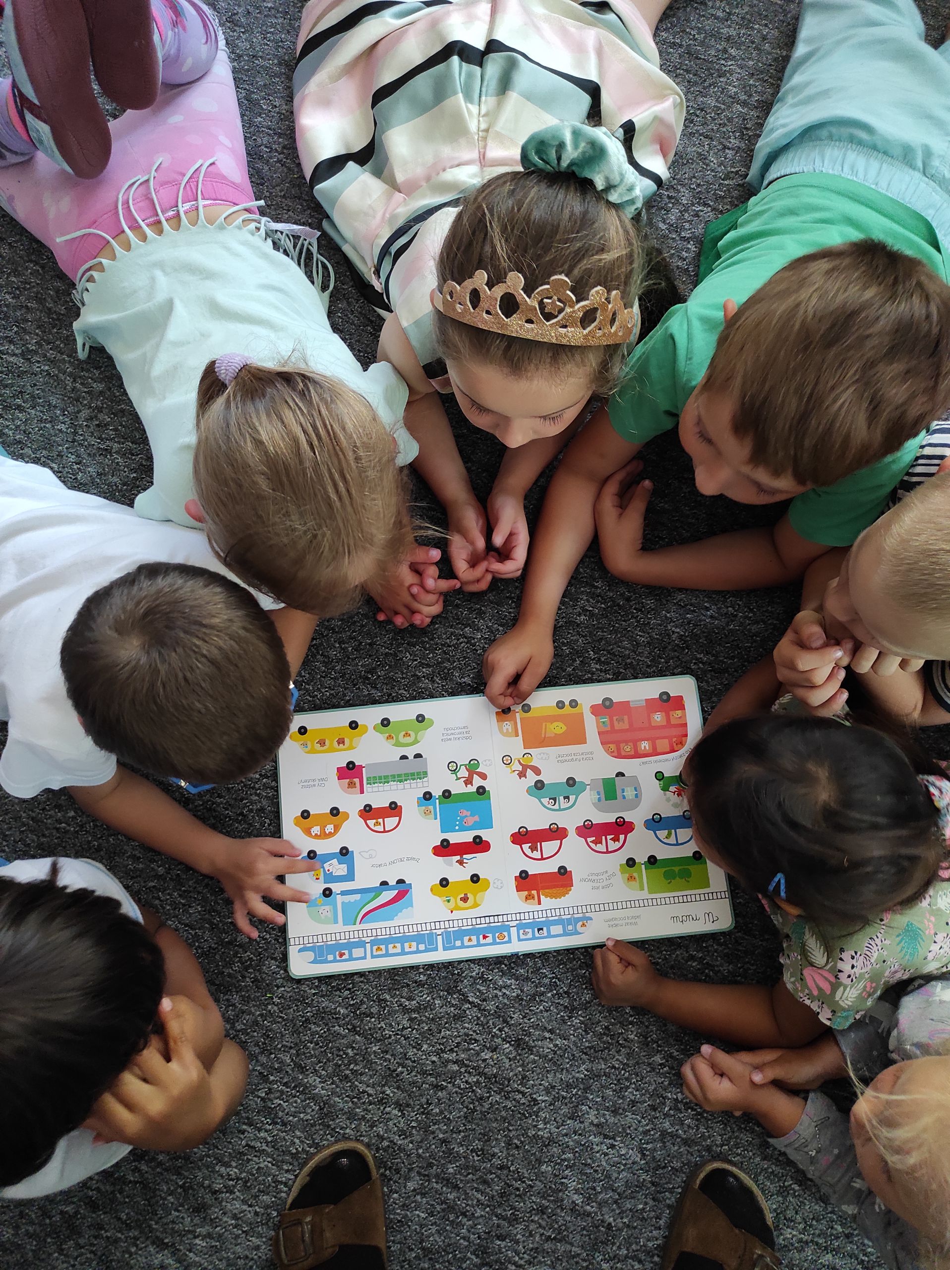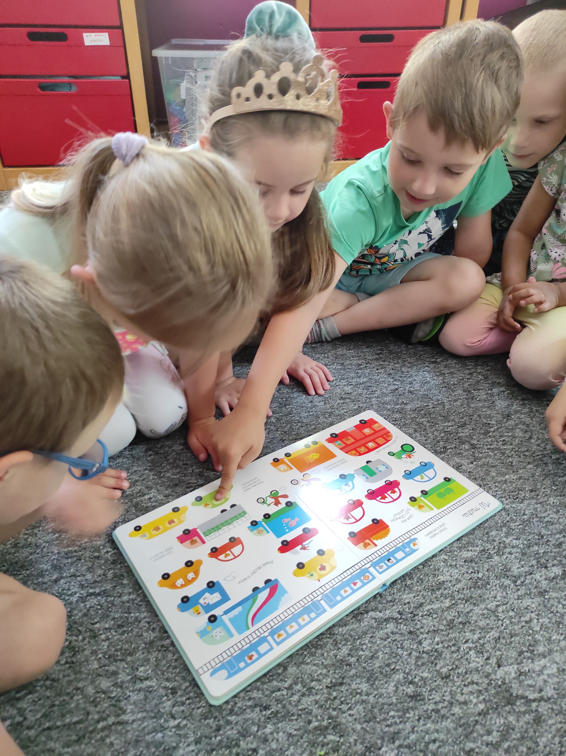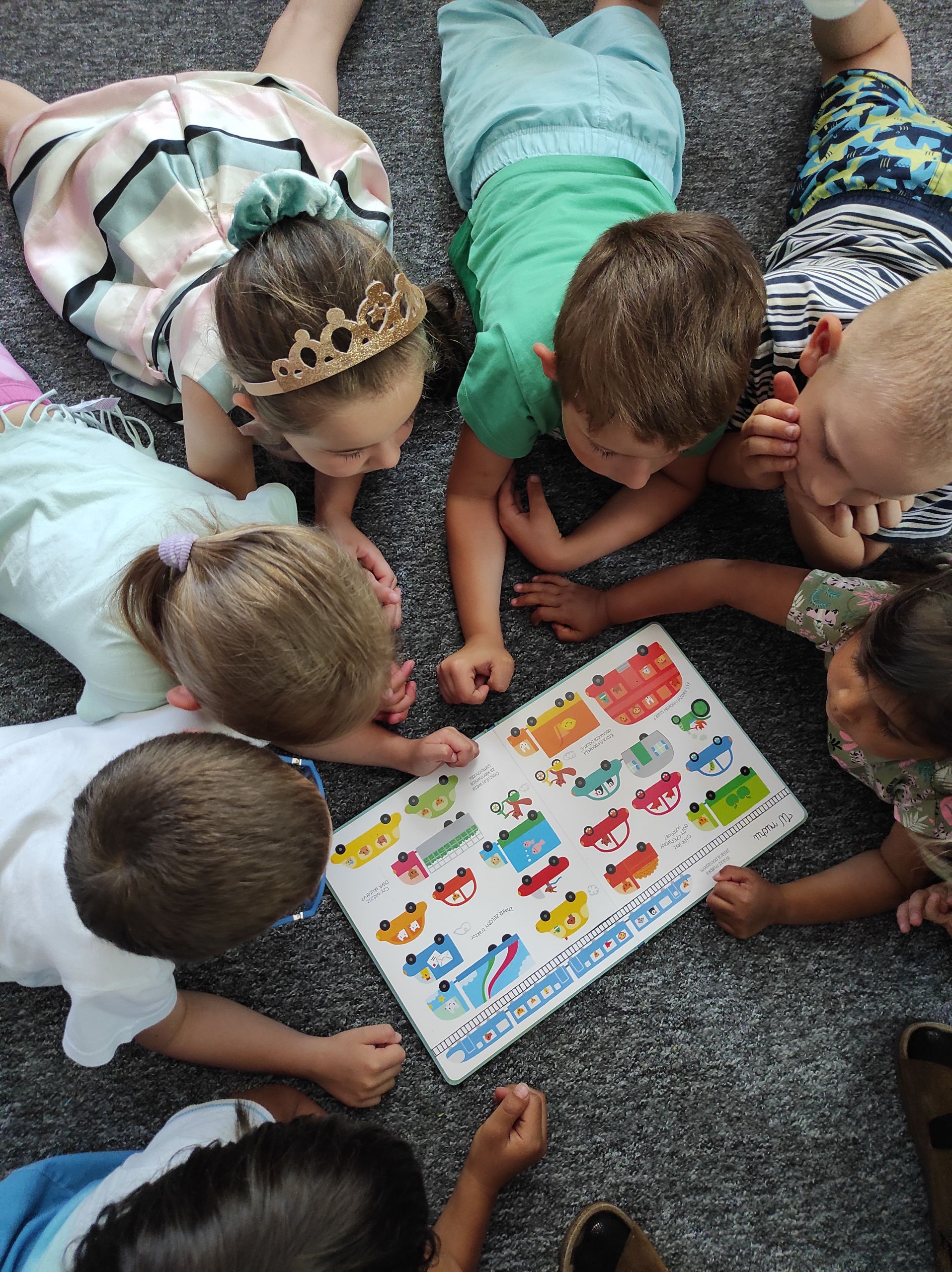 - Grupa dzieci leży na brzuchach dookoła książeczki edukacyjnej.