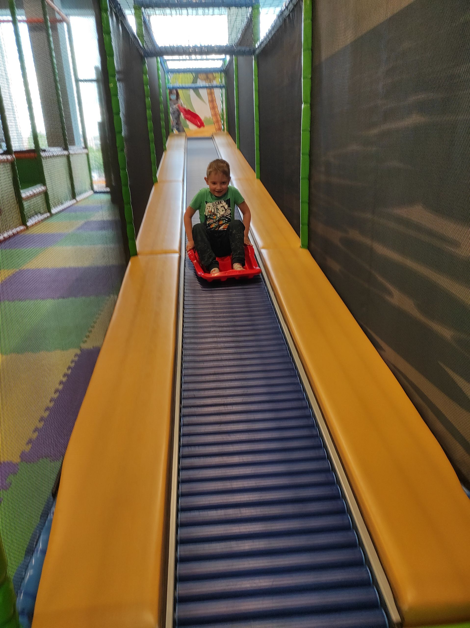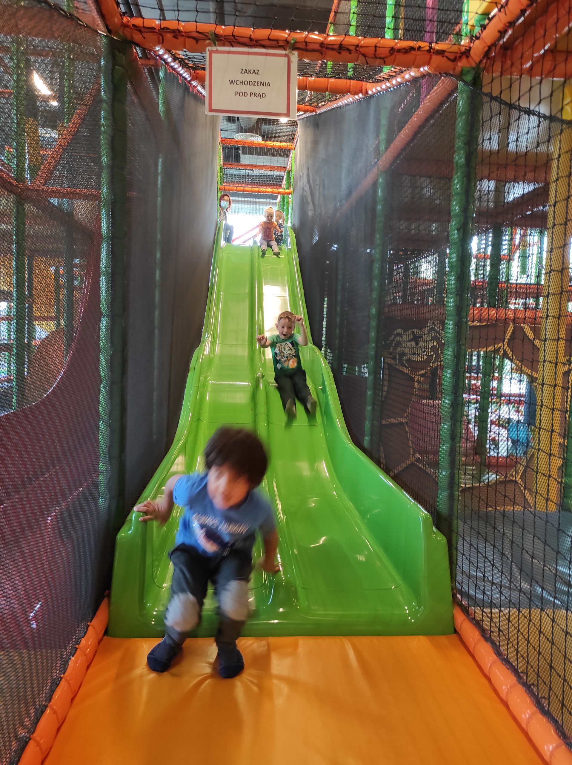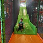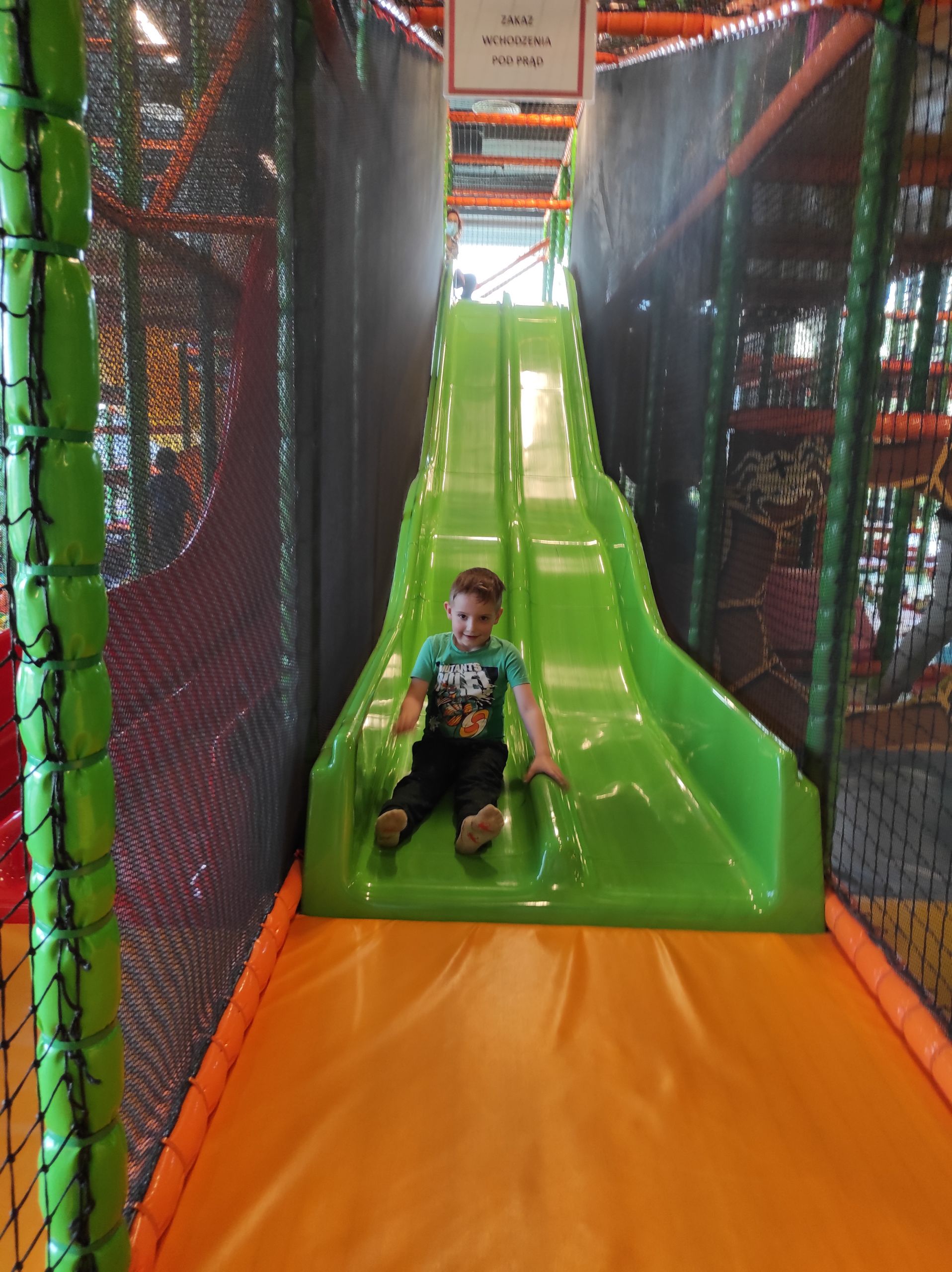 - Uśmiechnięty chłopiec zjeżdża z zielonej zjeżdżalni.